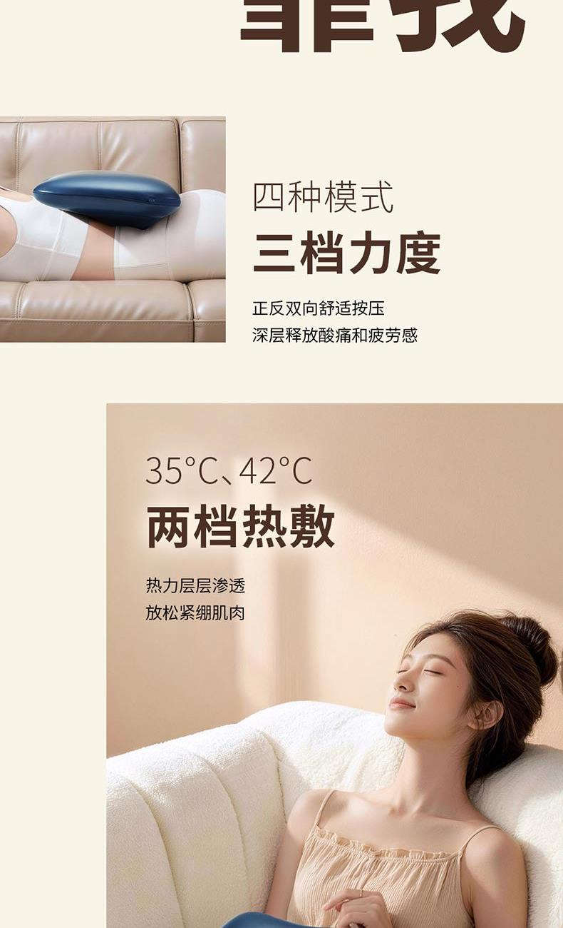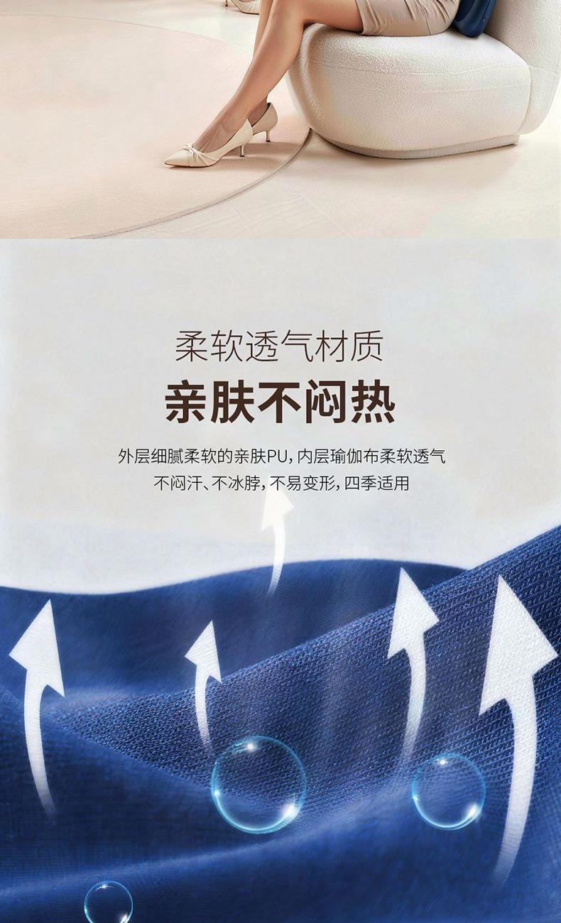 产品规格: 1、工作电压:7.4V 充电电压:5V 2、工作功率:24W 输入功率:10W 3、电池容量:2000mAh 4、产品材质:PU皮+瑜伽布 5、工作时长:10min 6、产品颜色:蓝色 产品特点: 1、一机多用,多部位、多场景、多模式; 2、安全可靠,内置机芯保护程序,遇到堵转时会自动反转,防止夹肉; 3、四种模式、三档力度调节,深层释放酸痛和疲劳感; 4、人体工程学设计,环抱支撑,不伤腰,更舒适; 5、35℃/42℃两档热敷,热力渗透放松紧绷肌肉 6、10min定时享受,防止按摩过度。