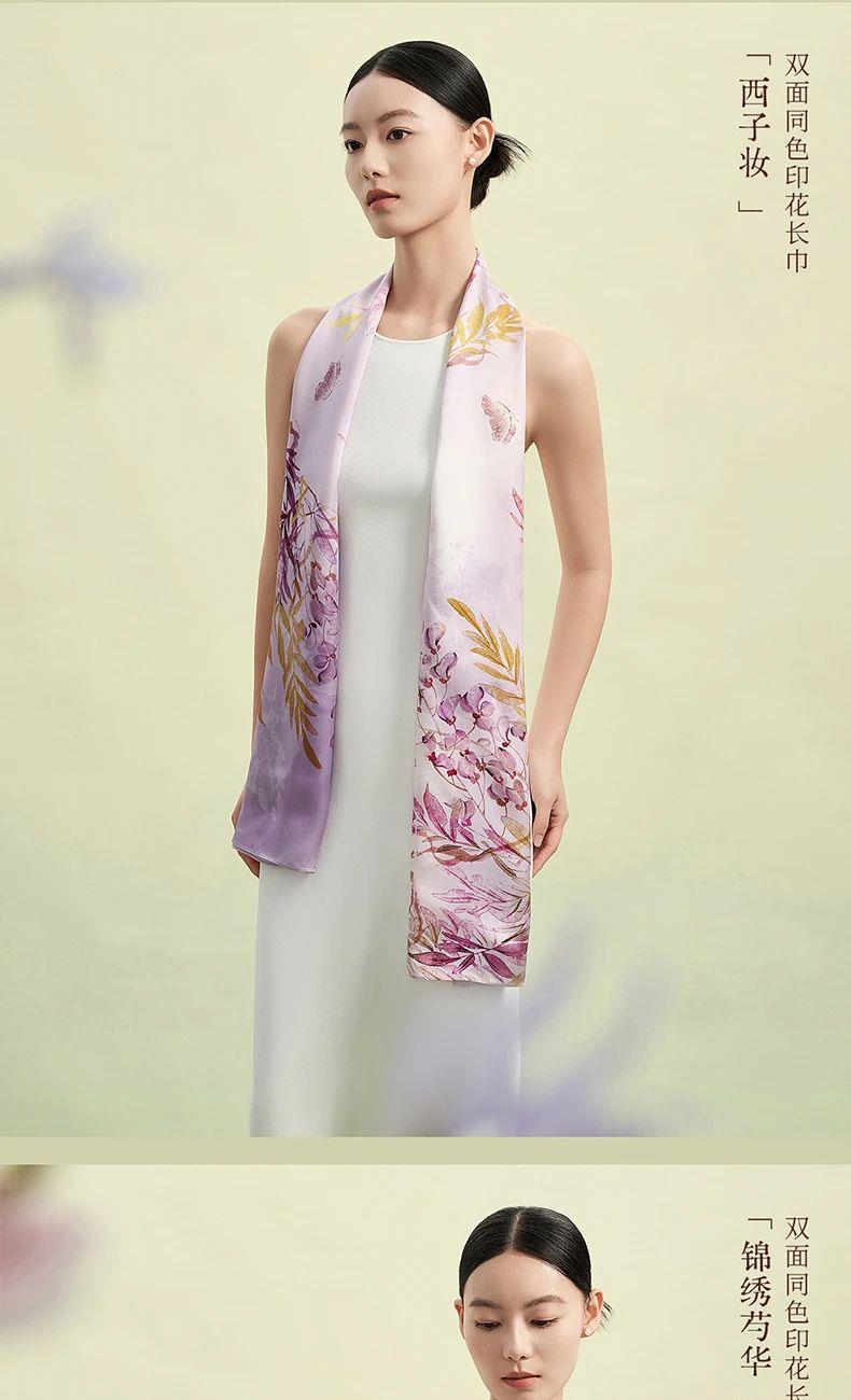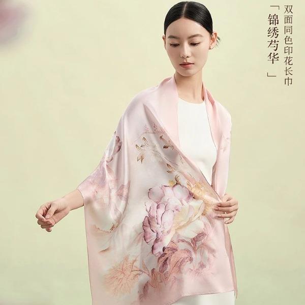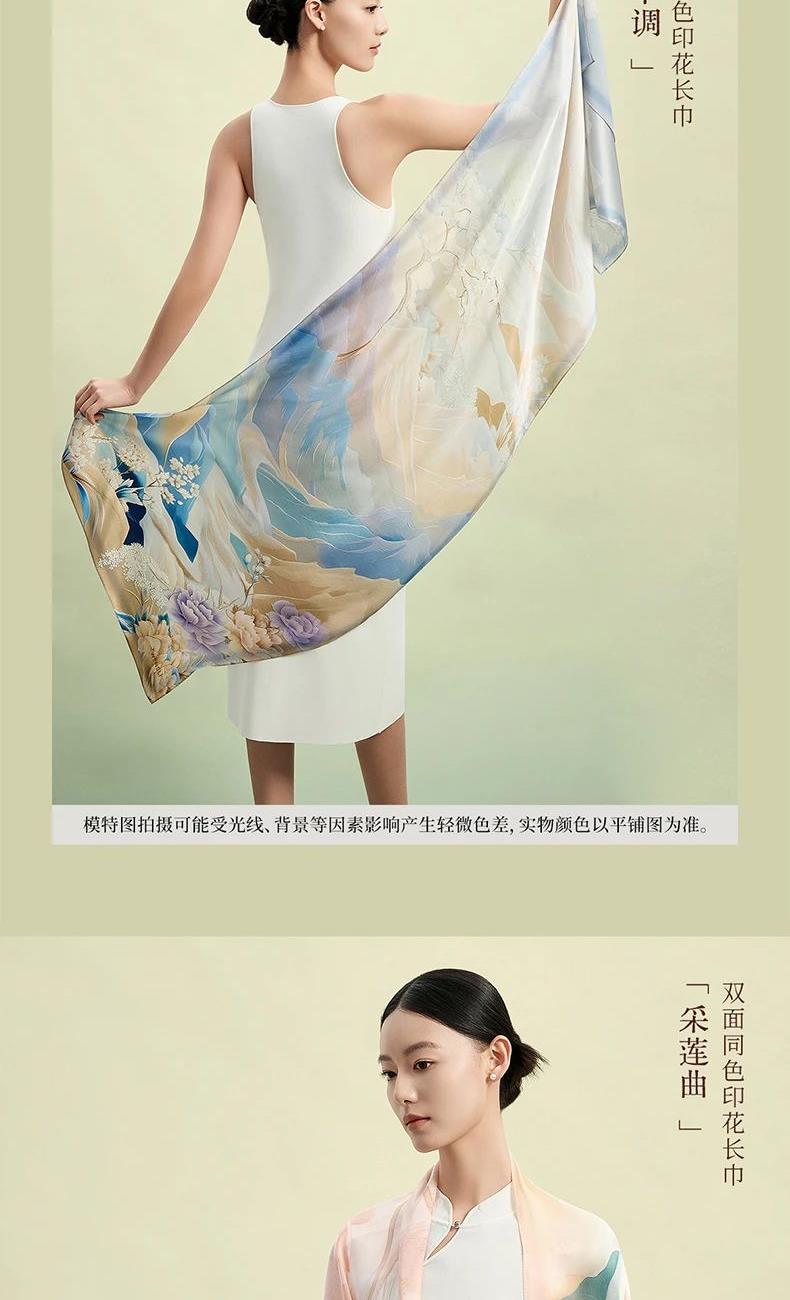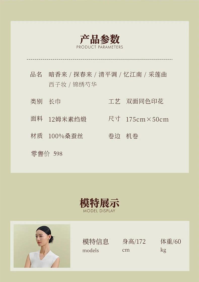 分类 暗香来/探春来/清平调/忆江南/采莲曲/西子妆/锦绣芍华 工艺:双面同色印花 面料:12姆米素绉缎 尺寸:175cm×50cm 材质:100桑蚕丝 卷边:机卷