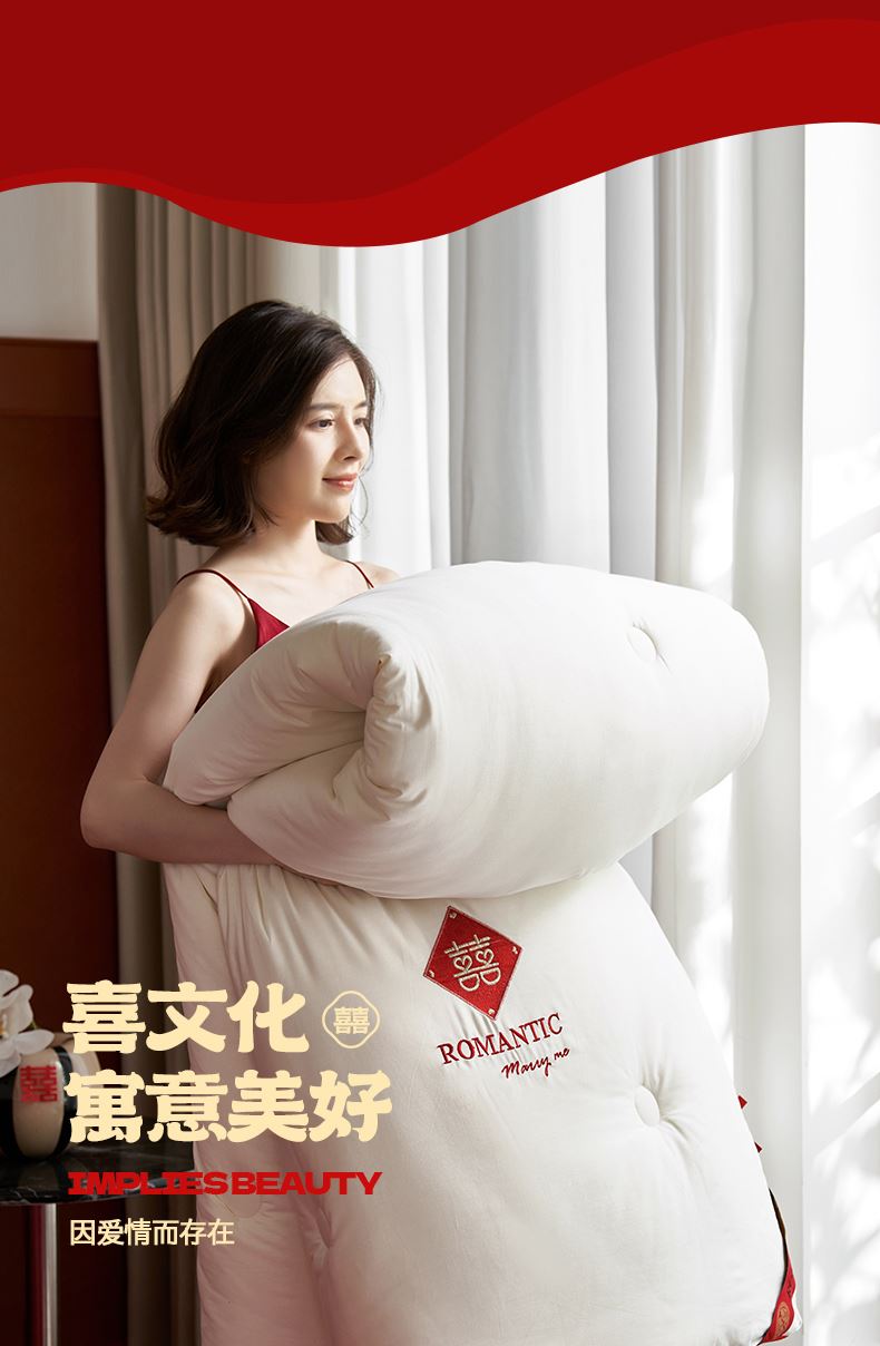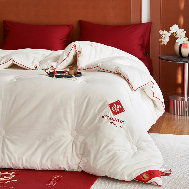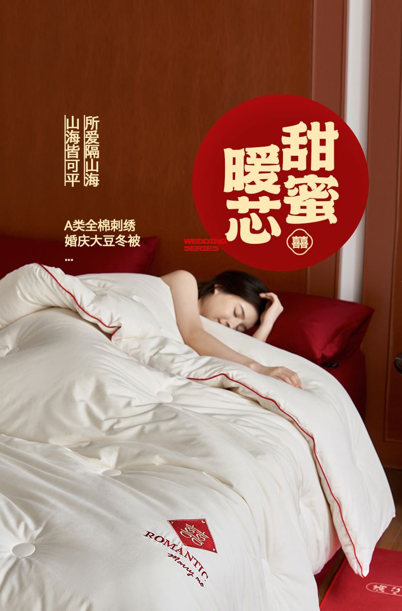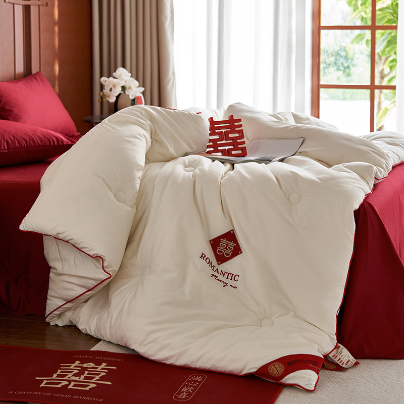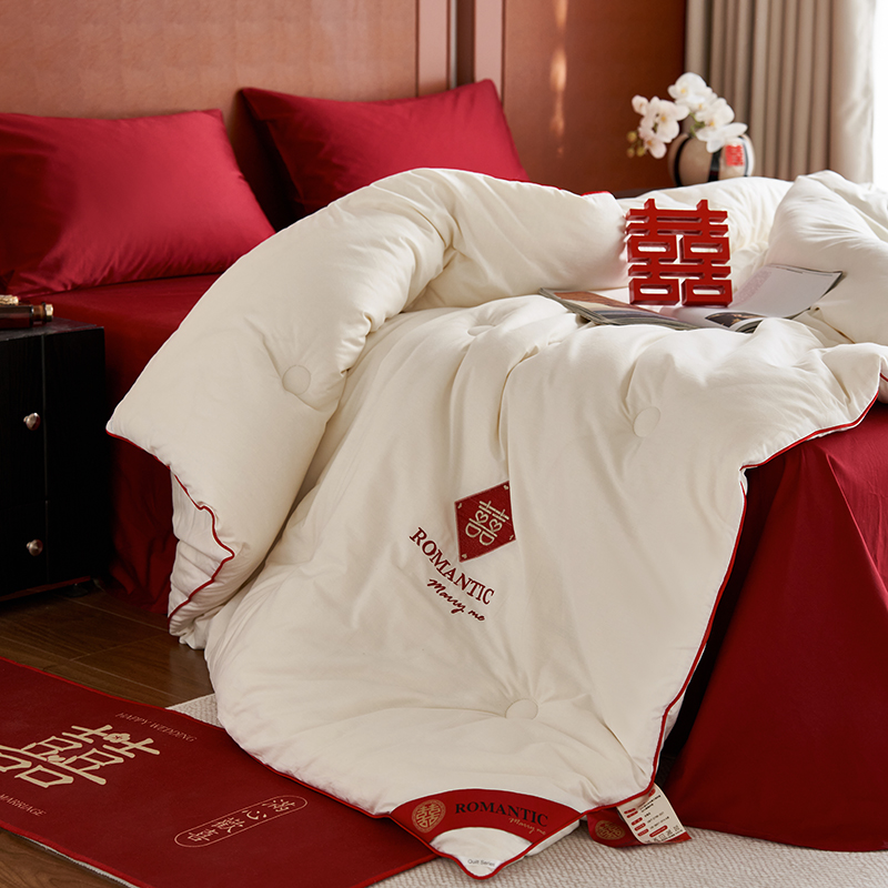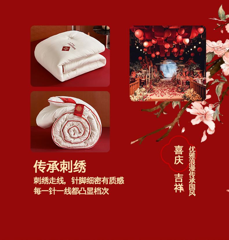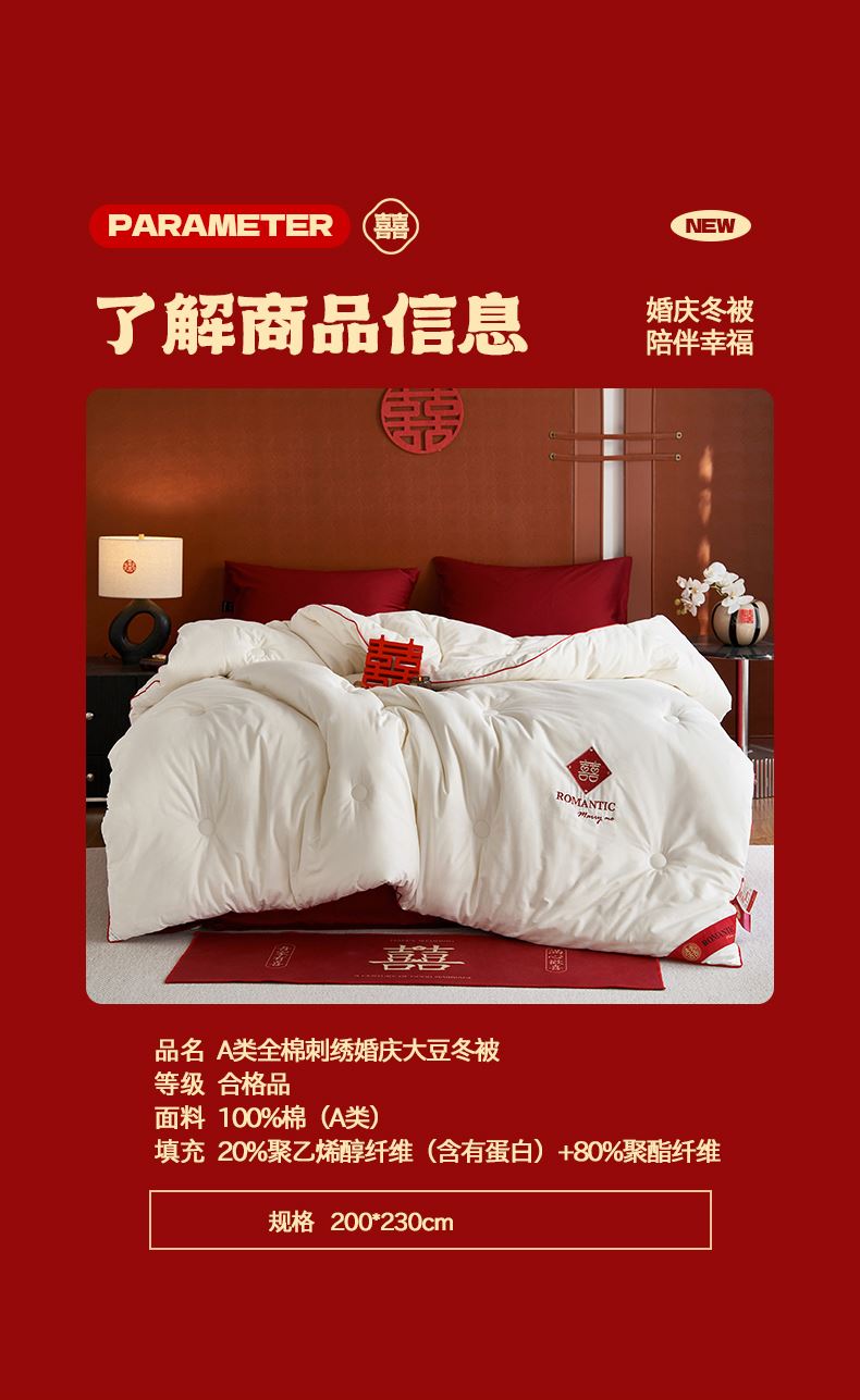 面料:棉 规格:200×230cm 填充:20%大豆纤维+80%聚酯纤维 总重:3500g 包装:精美软包 精选新疆长绒棉,面料选用新疆长绒棉,每一缕都柔韧亲和棉朵光合作用充分,生长时间充足其柔韧度、光泽度、亲肤透气性都优于普通棉,精美刺绣工艺,立体刺绣,针线严谨,一触一碰间被爱意环绕,仪式感和氛围感拉满。