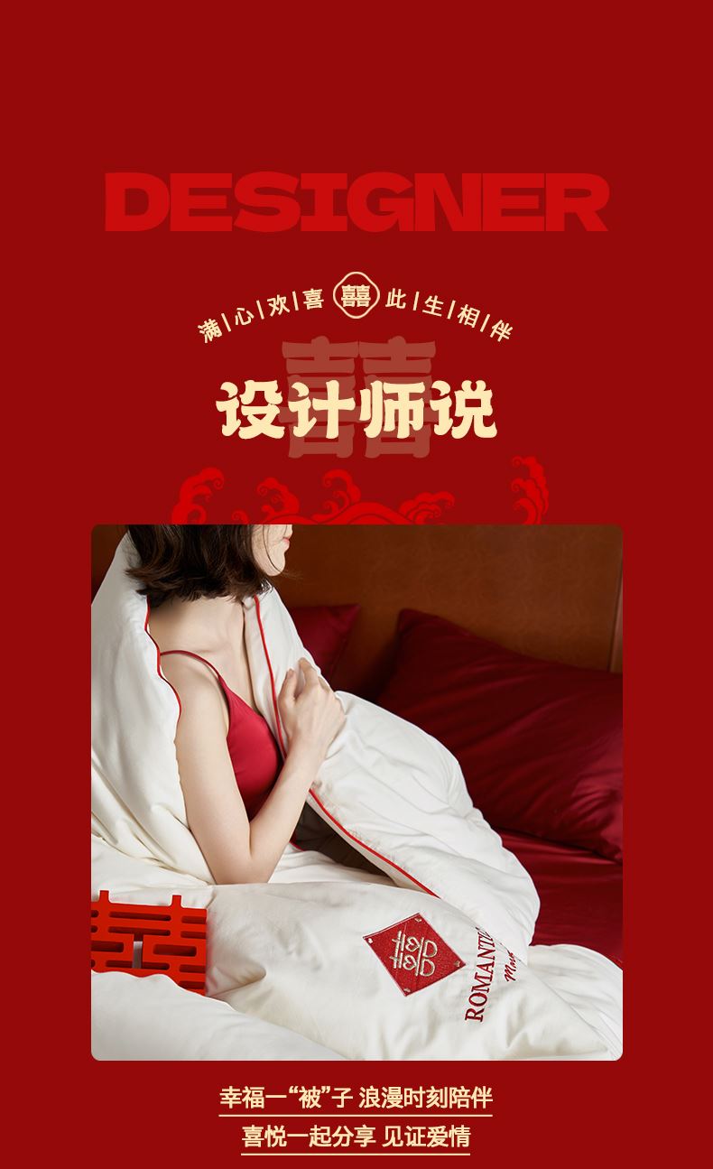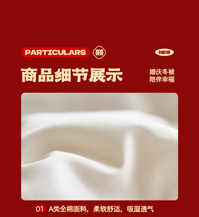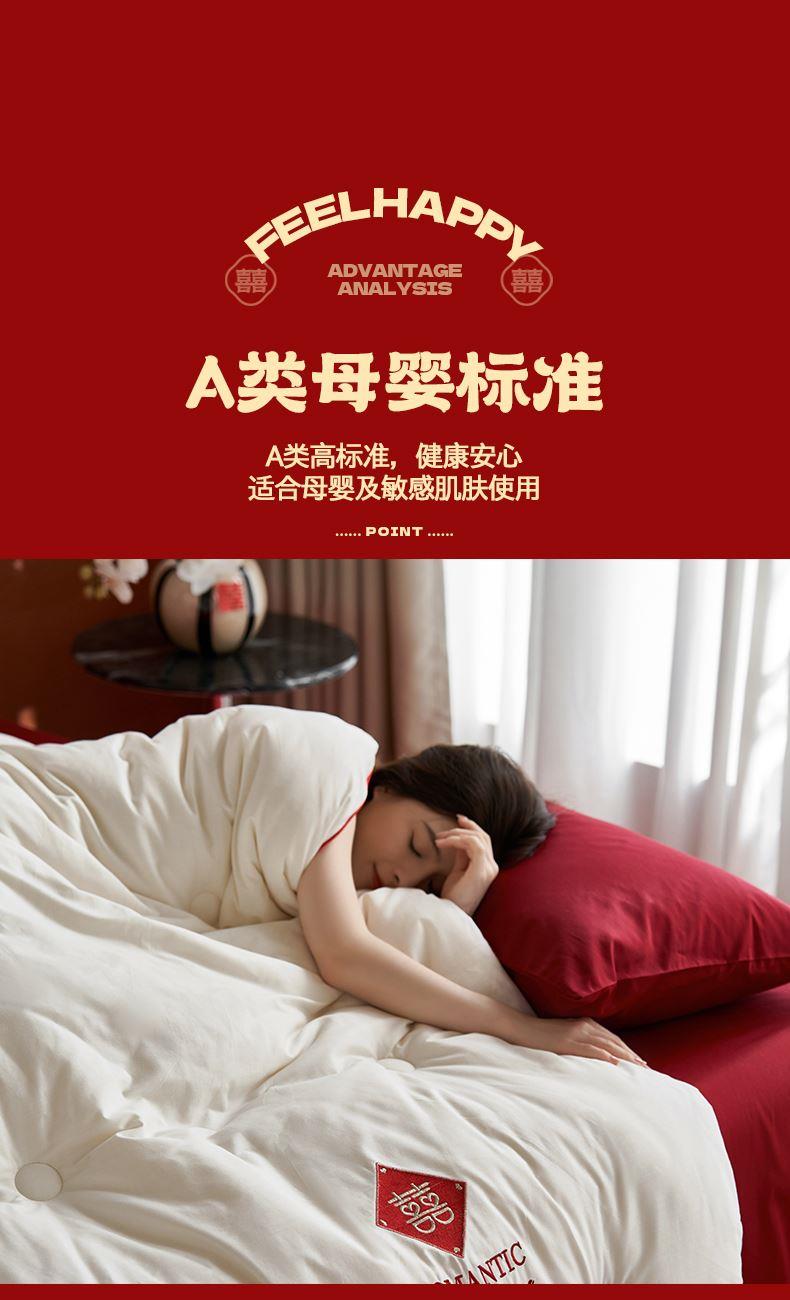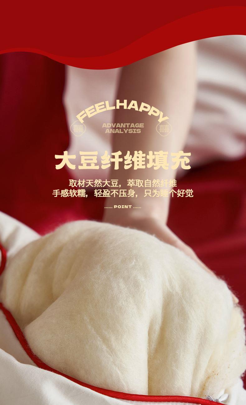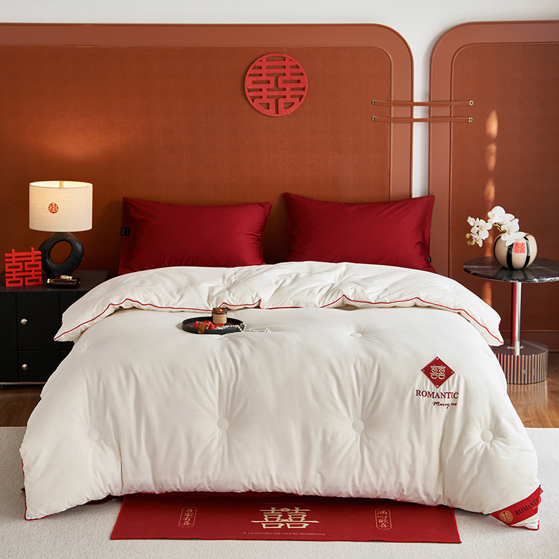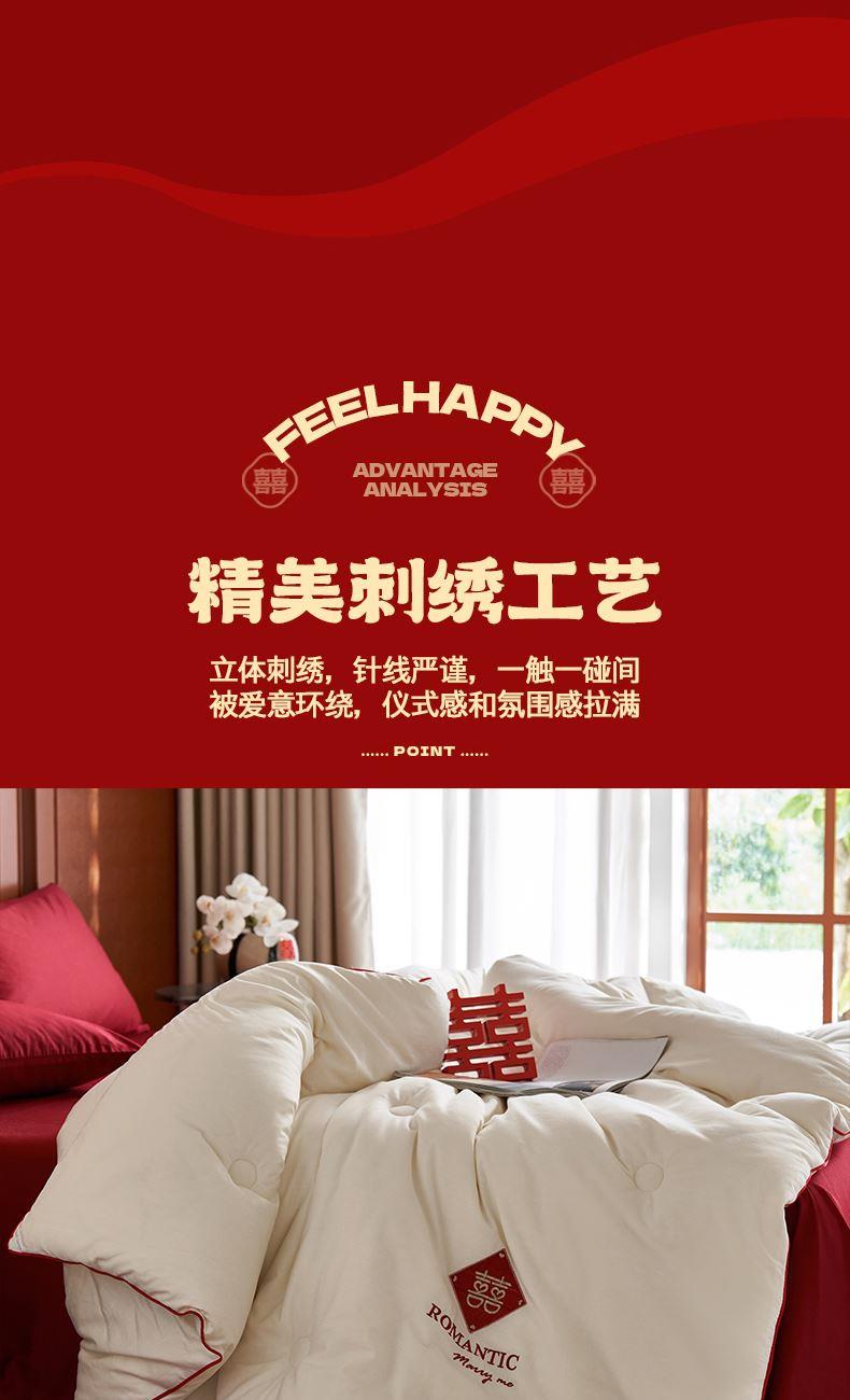 面料:棉 规格:200×230cm 填充:20%大豆纤维+80%聚酯纤维 总重:3500g 包装:精美软包 精选新疆长绒棉,面料选用新疆长绒棉,每一缕都柔韧亲和棉朵光合作用充分,生长时间充足其柔韧度、光泽度、亲肤透气性都优于普通棉,精美刺绣工艺,立体刺绣,针线严谨,一触一碰间被爱意环绕,仪式感和氛围感拉满。