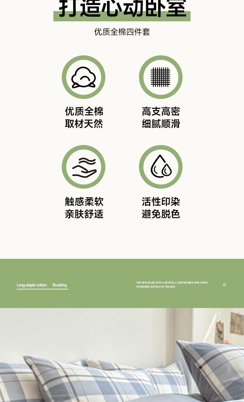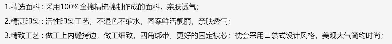 3.精致工艺 : 做工上内缝拷边,做工细致,四角绑带,更好的固定被芯;枕套采用口袋式设计风格,美观大气简约时尚;
