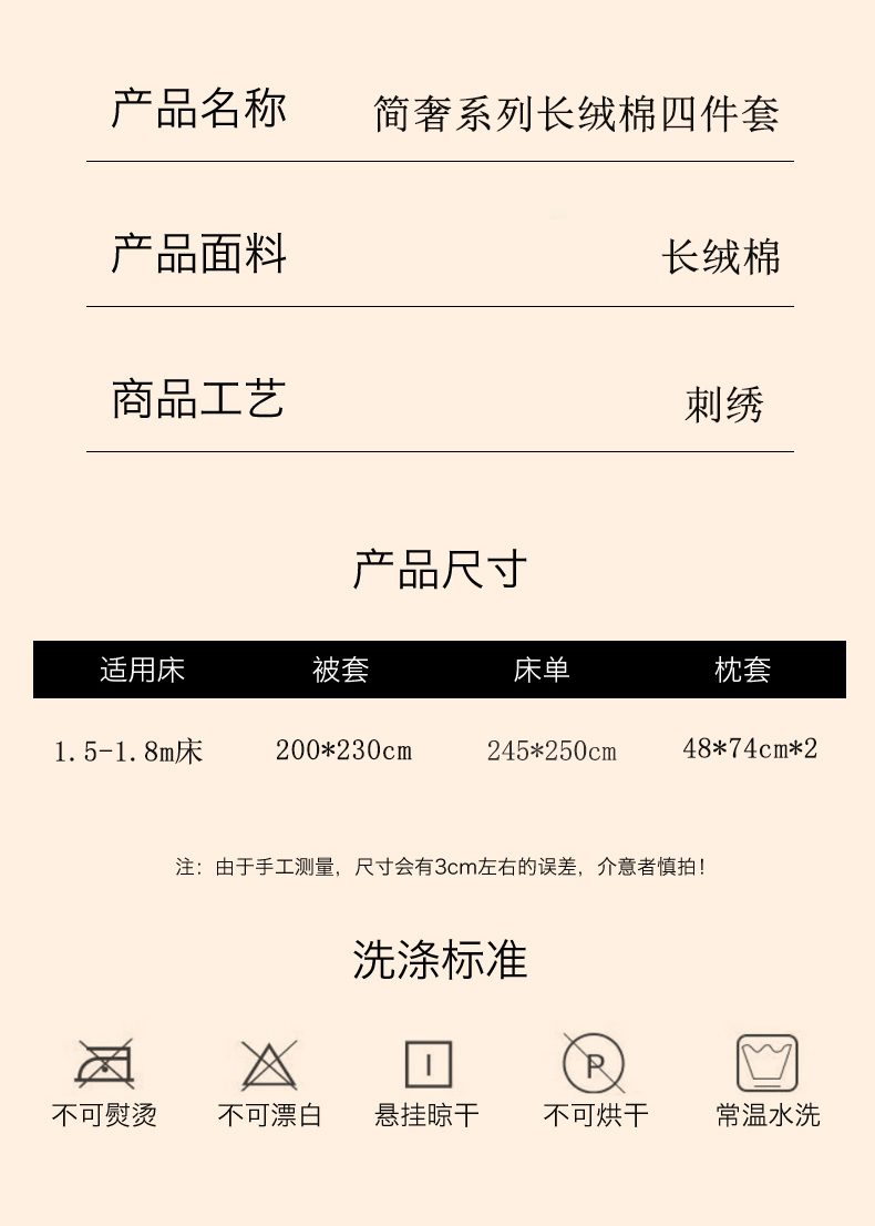 被套:200*230cm 床单:245*250cm 枕套:48*74cm*2 面料:长绒棉 产品包装:精美礼盒 包装尺寸:43.5*33*10cm 特点:采用长绒棉棉高密活性印染,洗后不易脱色、不变形、不起球,依然如新。绿色无污染,手感细腻柔软,经纬额度均匀,面料厚实不起球,不缩水。
