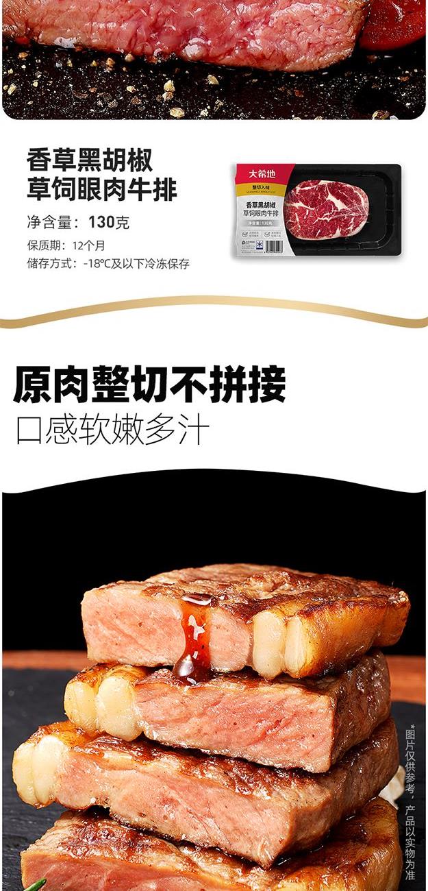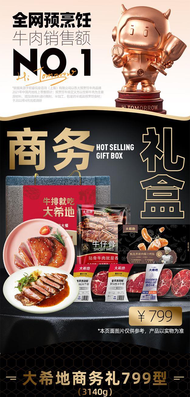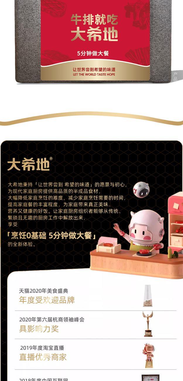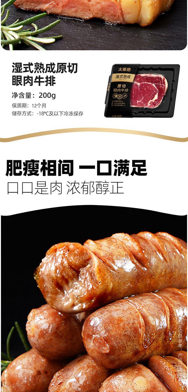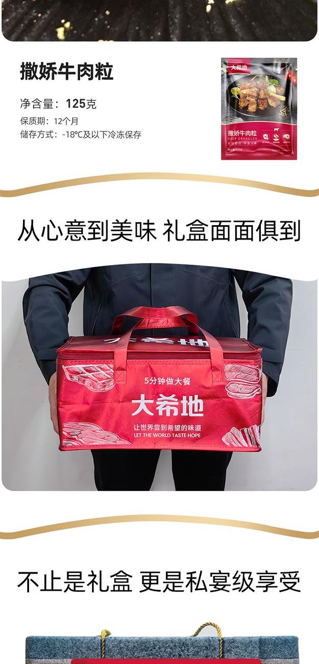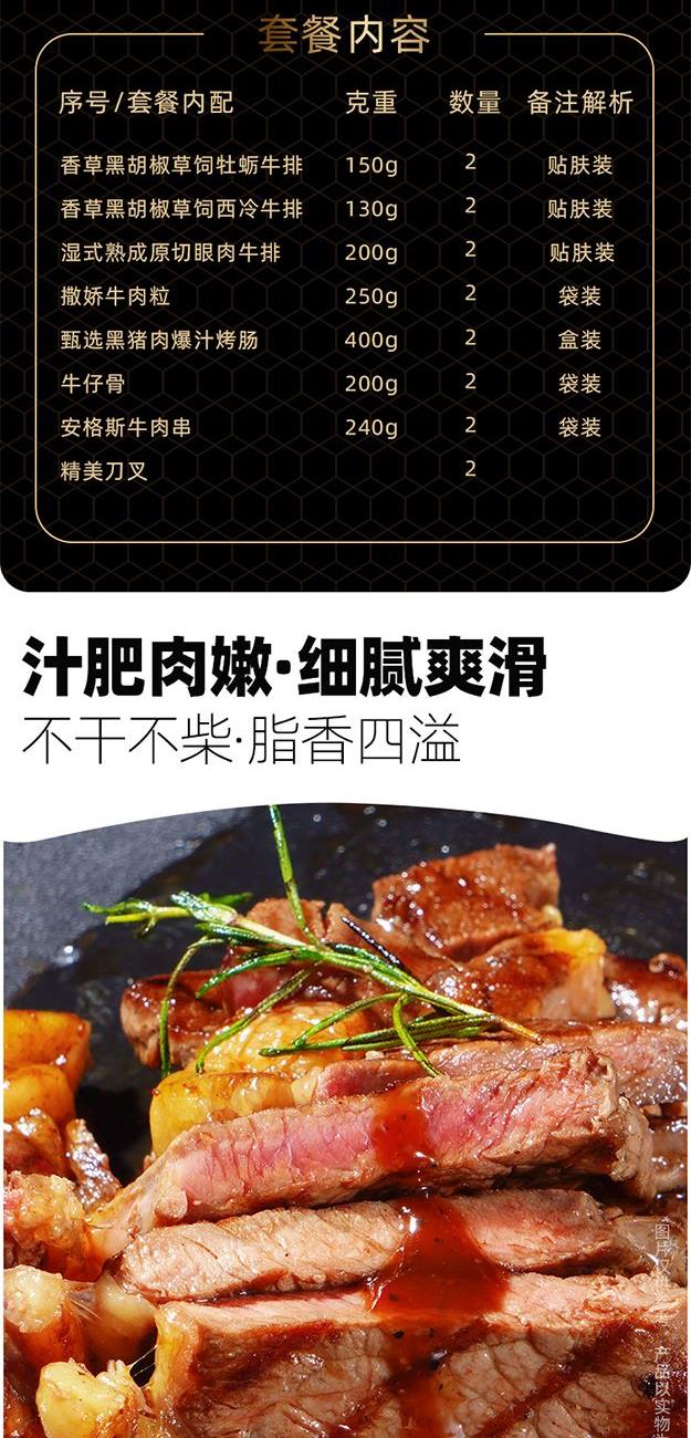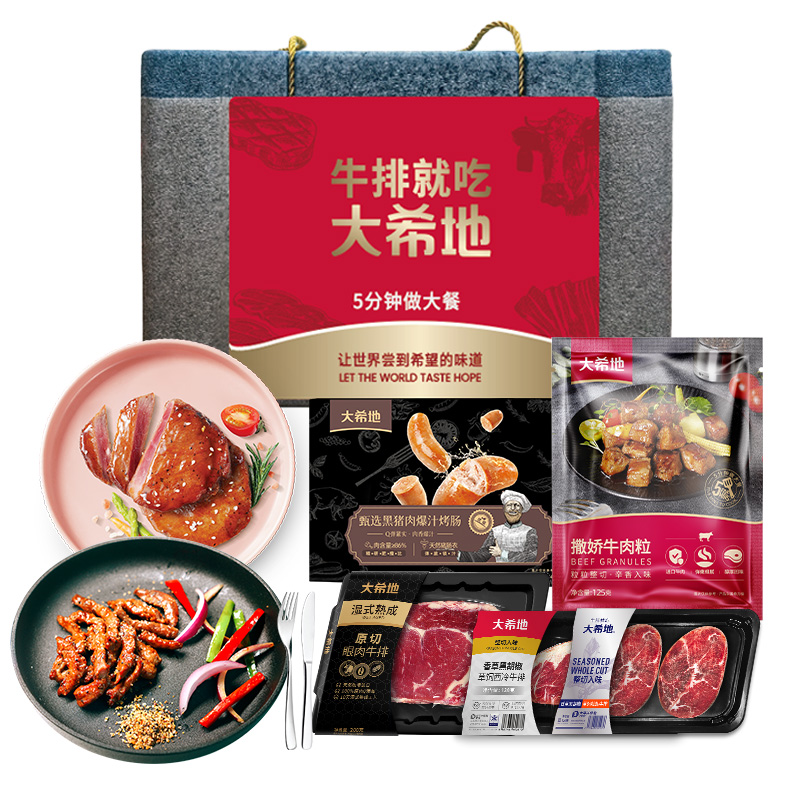 DXDSW-05 大希地商务礼799型 "大希地 香草黑胡椒草饲西冷牛排130g*2 大希地 香草黑胡椒草饲牡蛎牛排150g*2 大希地湿式熟成原切眼肉牛排200g*2 大希地 撒娇牛肉粒250g*2 大希地安格斯牛肉串240*2 大希地甄选黑猪肉爆汁烤肠400g*2 大希地牛仔骨200g*2 精美刀叉一副 精美刀叉一副"