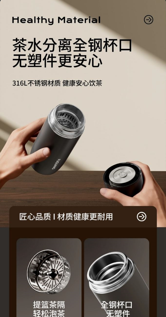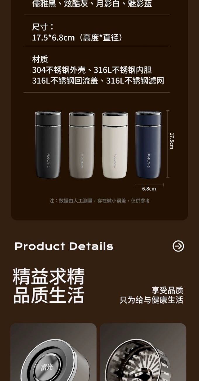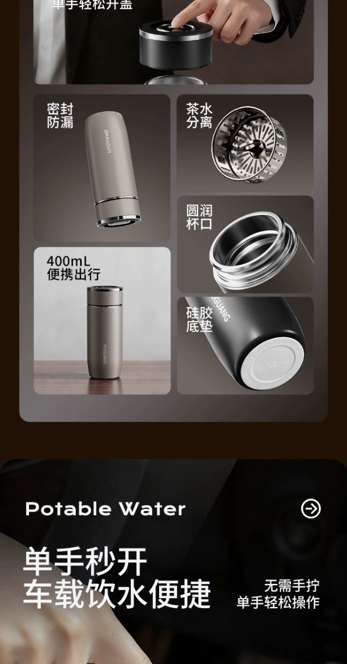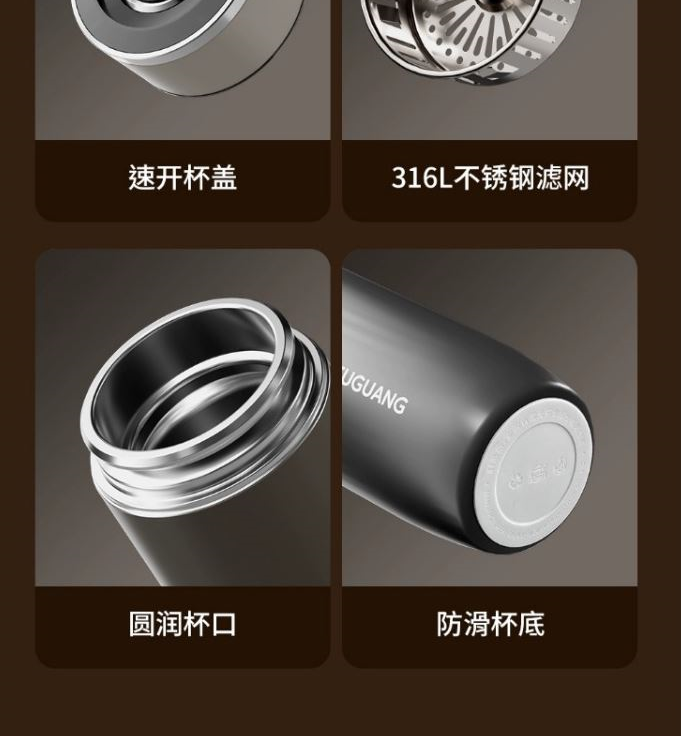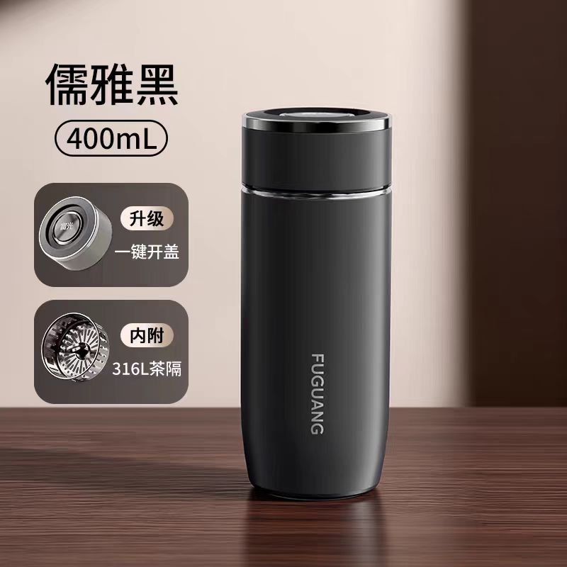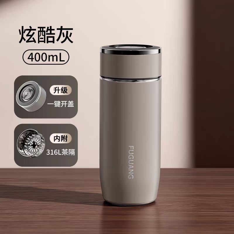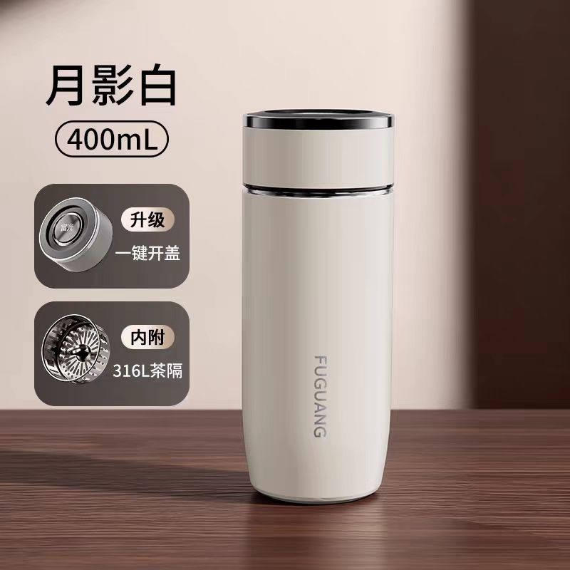 颜色:儒雅黑 炫酷灰 月影白 魅影蓝 尺寸:68*175mm 容量:400ml 材质:316L奥氏体不锈钢内胆,不锈钢手捏滤网。 无尾真空超长保温。 圆润杯口,自带茶隔,快速分离茶汤。 一键开合单手轻松开盖。硅胶杯底静音防滑 包装:单瓦盒