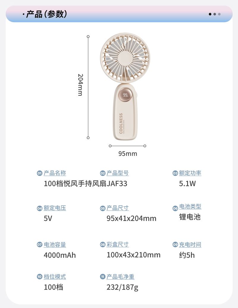 产品型号: 产品颜色:米色、粉色、蓝色 产品尺寸:95x41x204mm 电池容量:4000mAh 风速档位:100档 充电时间:5小时 使用时间:4-15小时 外箱尺寸:47.5x43x45.5cm 整箱毛/净重:19.9/18.9kg 备注:本产品须整箱发货