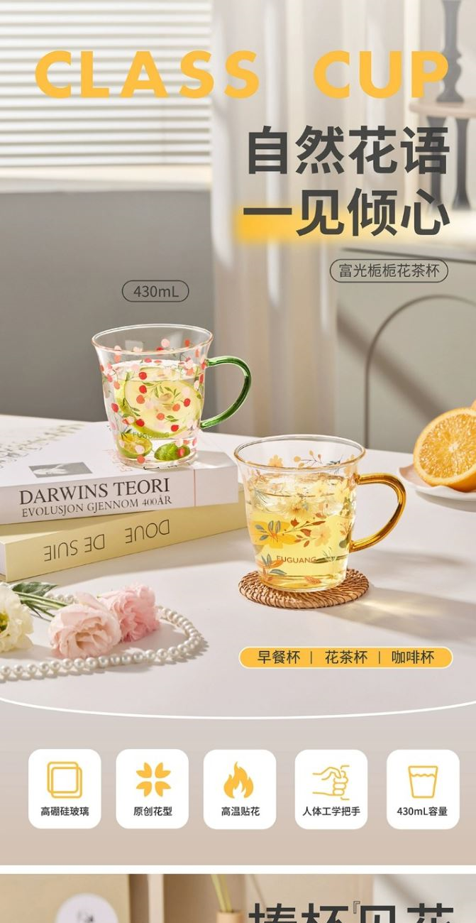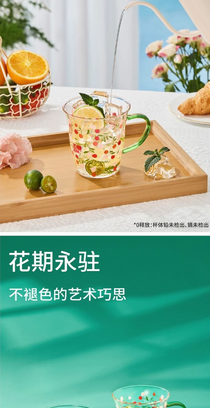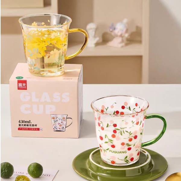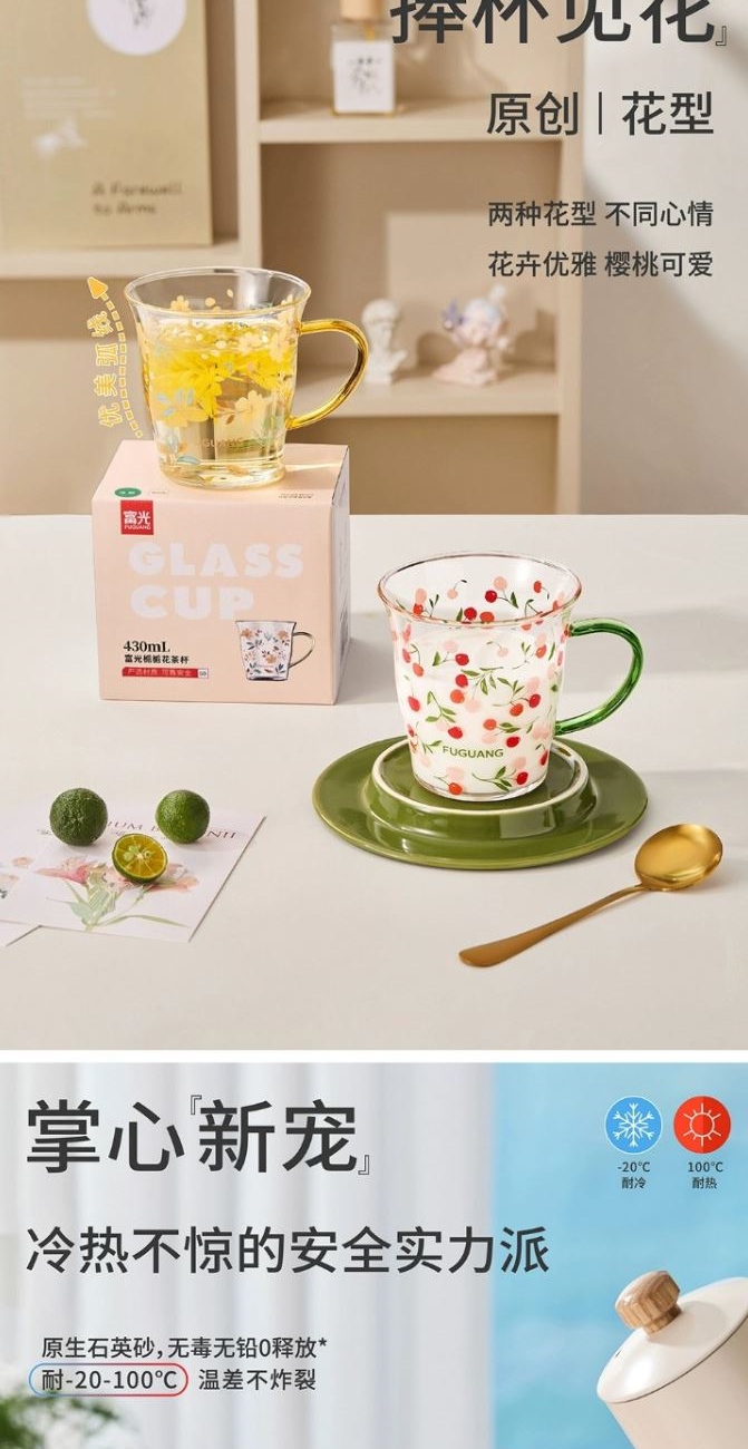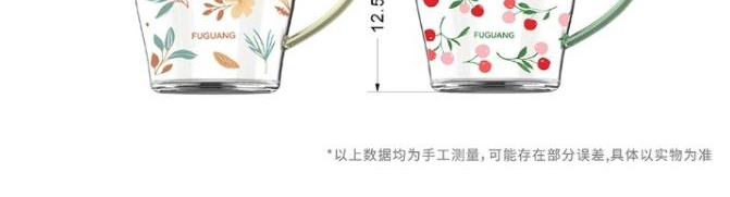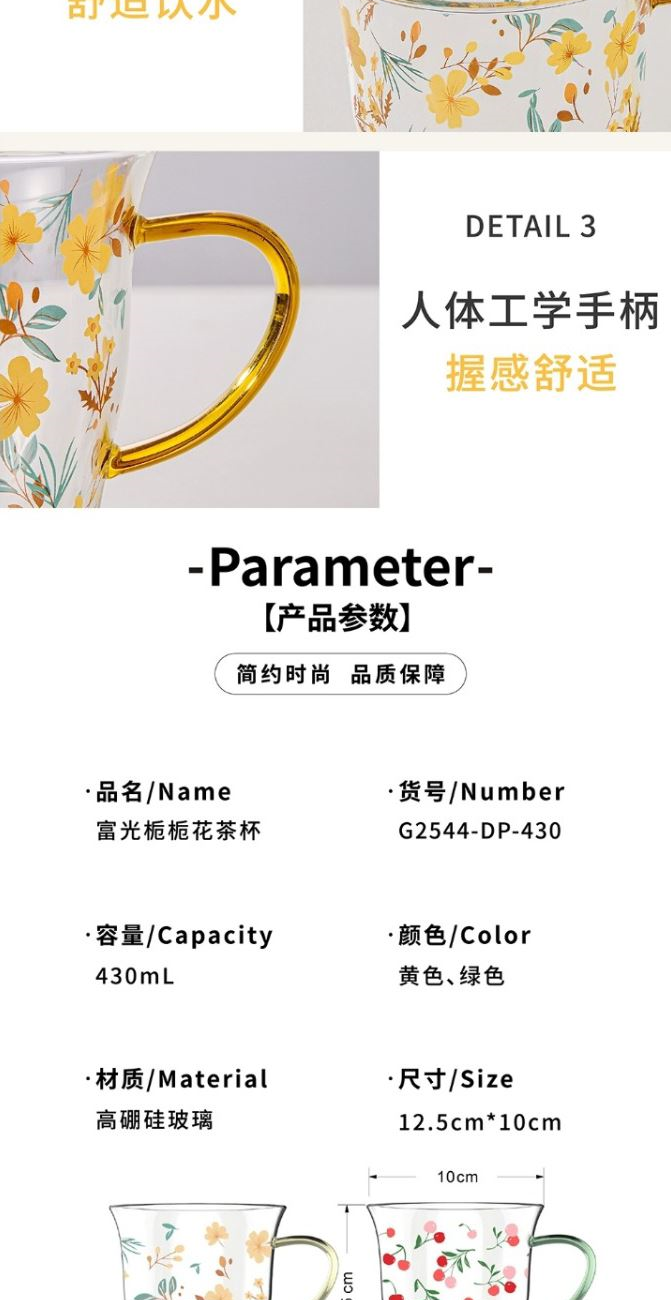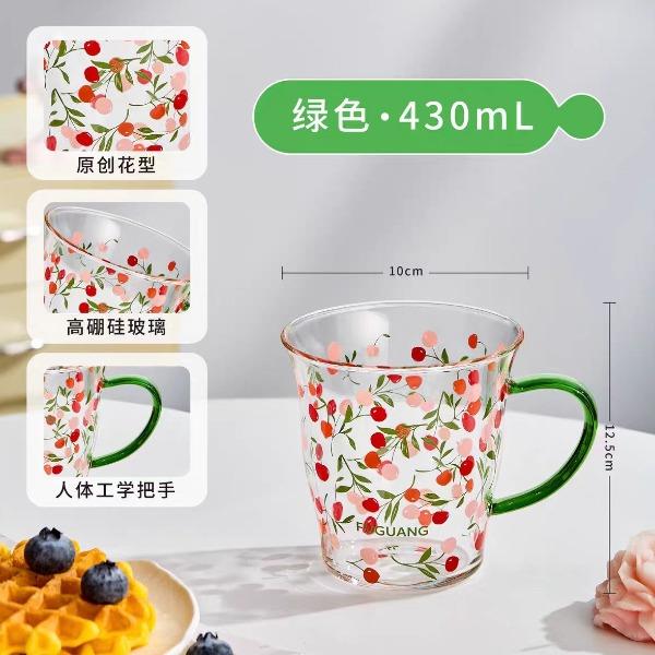 颜色:黄色 绿色 容量:430ml 尺寸:杯口直径10cm*12.5cm高度 材质:单层强化高硼硅玻璃,耐热耐冷健康无铅。 16小时高温退火处理,更耐急剧温差。 两种花型不同心情,花卉优雅,樱桃可爱。 包装:单瓦盒