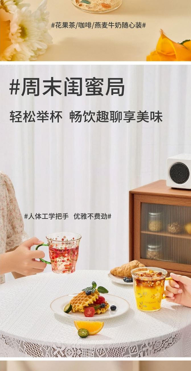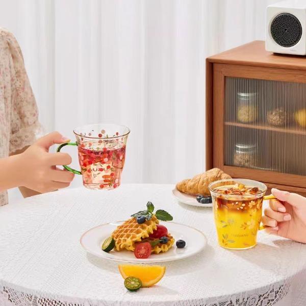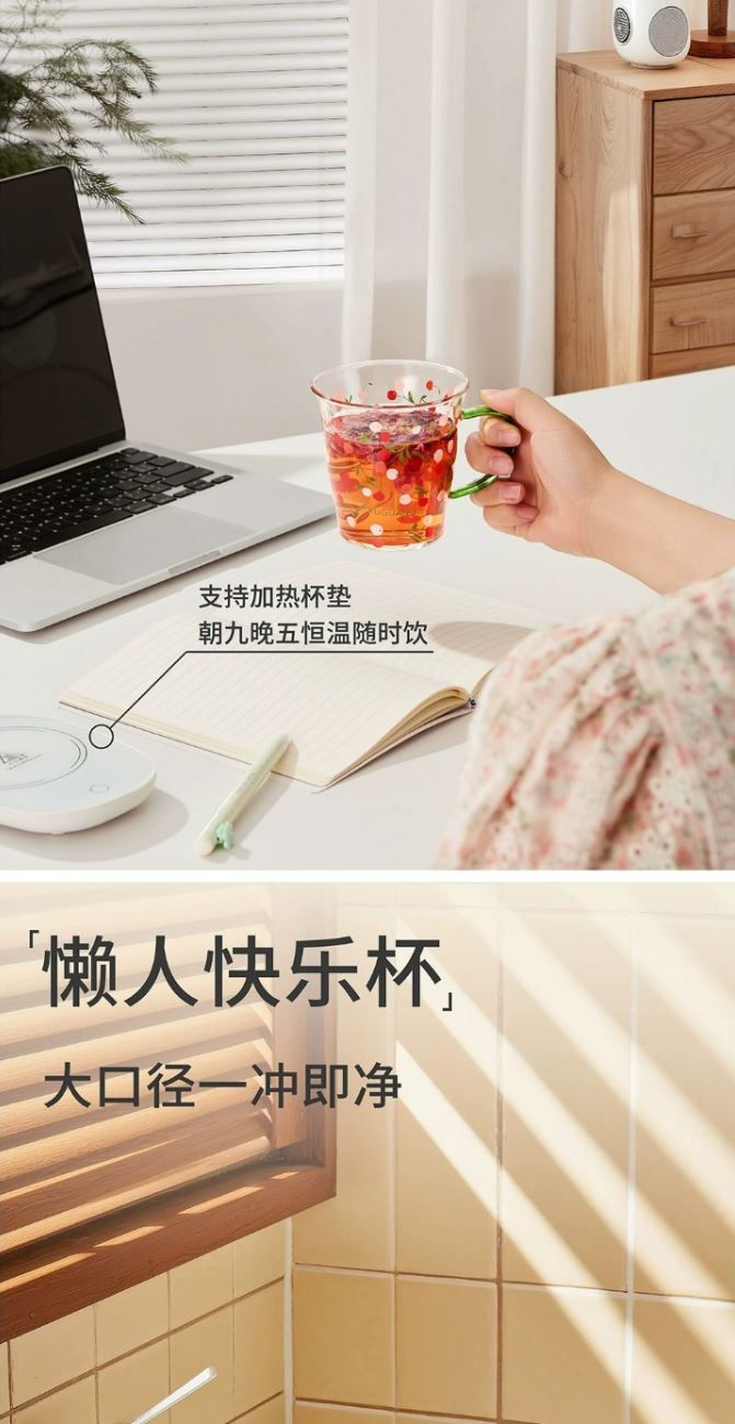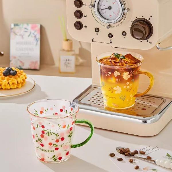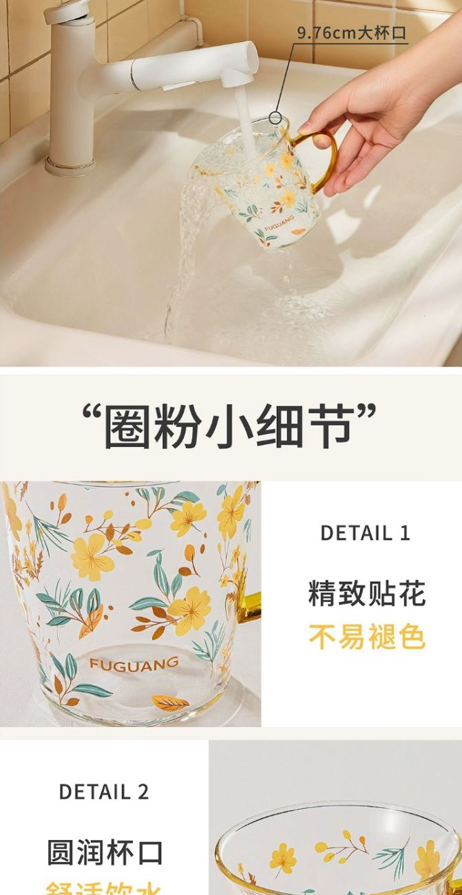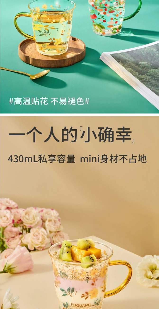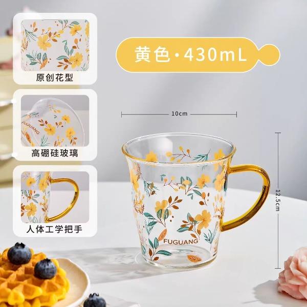 颜色:黄色 绿色 容量:430ml 尺寸:杯口直径10cm*12.5cm高度 材质:单层强化高硼硅玻璃,耐热耐冷健康无铅。 16小时高温退火处理,更耐急剧温差。 两种花型不同心情,花卉优雅,樱桃可爱。 包装:单瓦盒