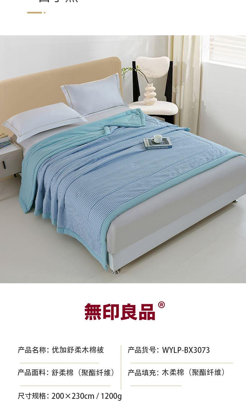 规 格:200×230cm 克重:1200g 面 料:舒柔棉(聚酯纤维) 填 充:木柔棉(聚酯纤维) “無印良品”大染无印,优良品质的产品是年轻人喜欢的,“無印”设计, 优雅 , 质朴 , 自然 , 是無印良品的初心与追求。让体验更舒适。享受简约健康生活,走进無印,上善若水,大爱无疆,创新让生活更精彩。