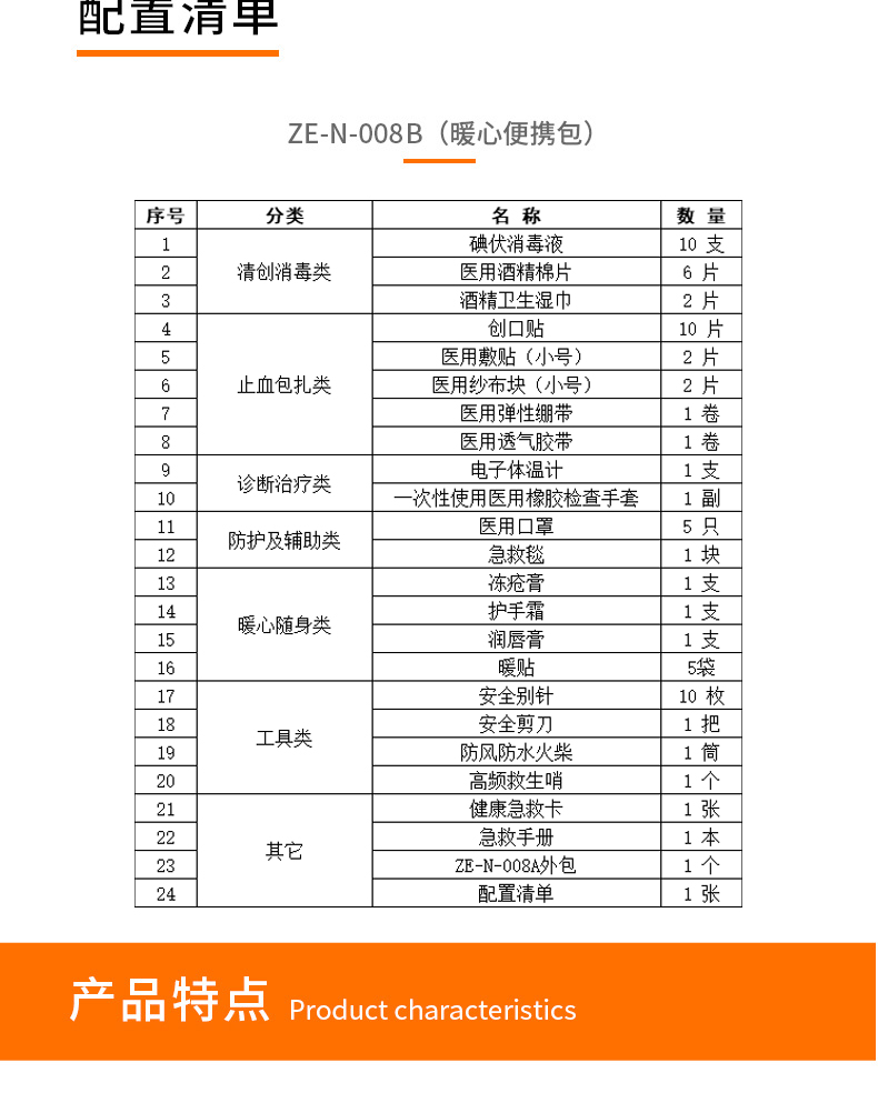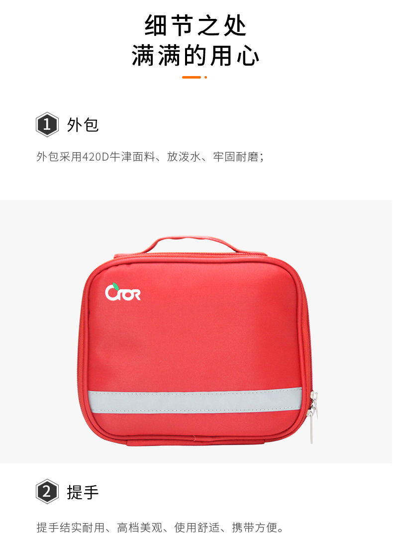 产品材质:190D发泡尼龙 产品规格:200*170*70mm 产品颜色:红色 产品配置:含7大类24种急救用品