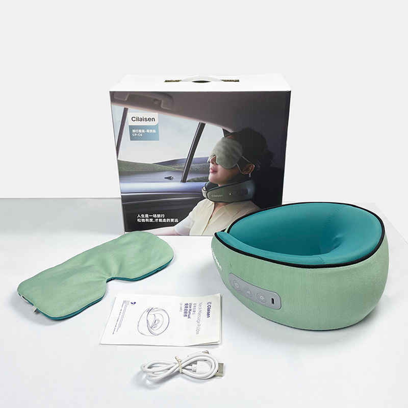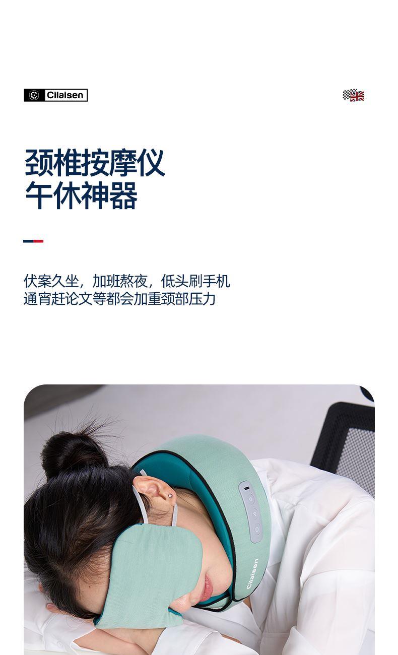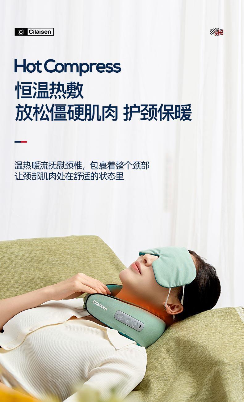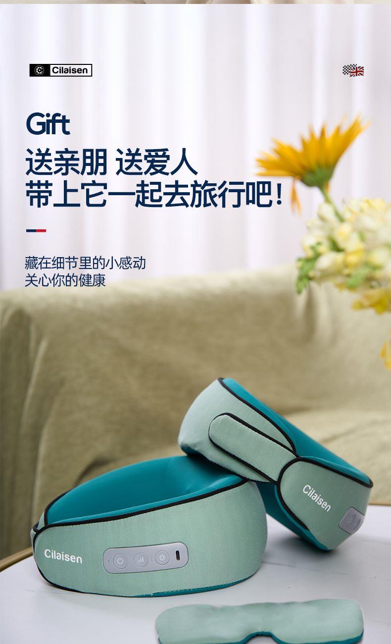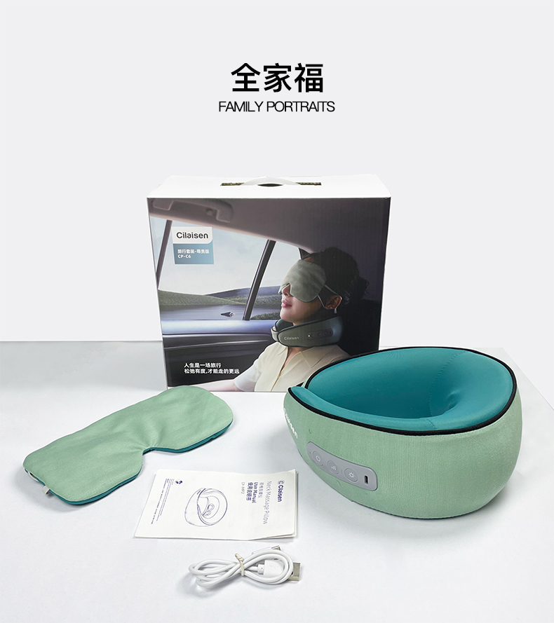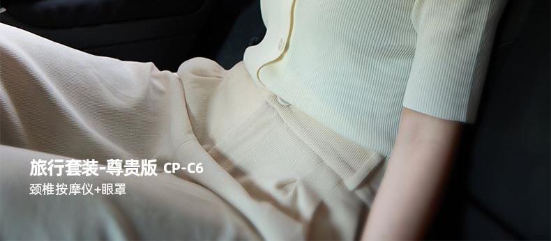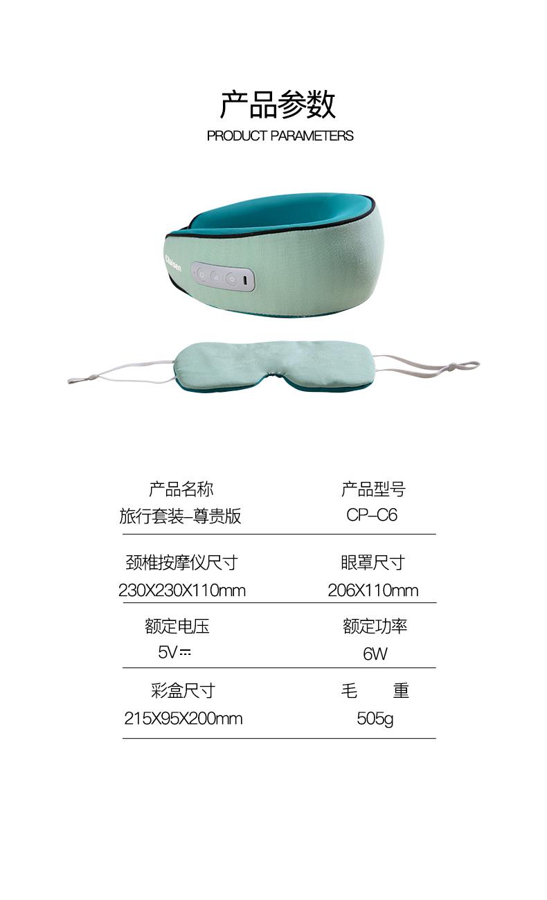 产品参数: 套装型号:CP-C6 商品条码 : 6972831860815 颈椎按摩仪型号:CP-MP2 定电压 : 5V ⎓ 颈椎按摩仪尺寸:230X230X110mm 额定功率:6W 眼罩尺寸:206X110mm 电池容量:1200mAh 产品毛重 : 505g 包装尺寸:215X95X200mm 外箱尺寸:550X470X480mm 包装清单:颈椎按摩仪x1、眼罩X1、充电线x1、说明书x1 1. 3档力度调节,舒缓、强力、轻柔,多部位大面积按摩 2、恒温热敷,放松僵硬肌肉 护颈保暖 3、两组3D按摩头,旋转式点对点揉捏,力度到位 4、立体舒适承托,给颈部全包裹的有力承托 5、充电便携,长续航,出差旅行好搭档 6、加宽大面罩,不勒耳不磨耳 轻盈更舒适