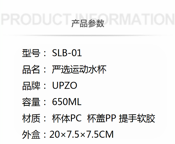 型号: SLB-01 成分:杯体PC 杯盖PP 规格:满杯容量650ML 外盒:20×7.5×7.5CM 杯体简约设计 提手设计 夏季好礼 搭配礼盒