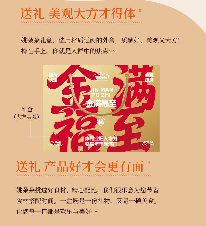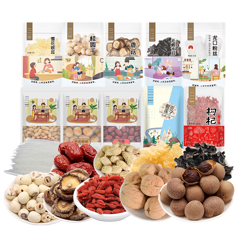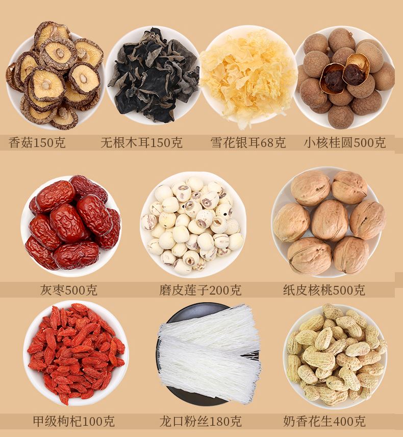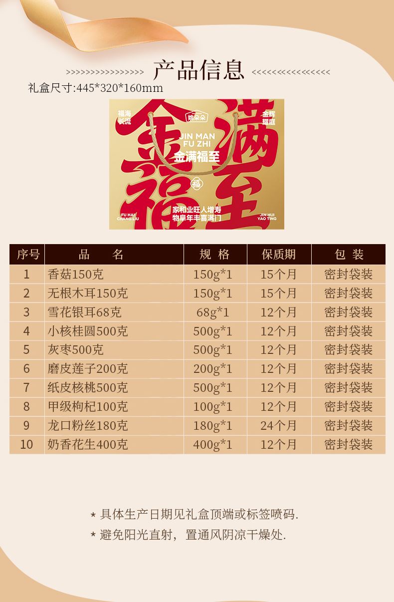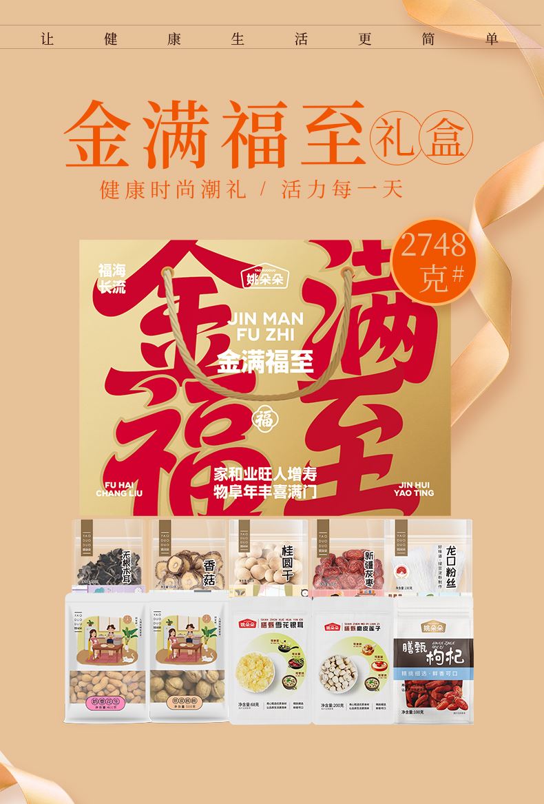 姚朵朵香菇150克 姚朵朵无根木耳150克 姚朵朵雪花银耳68克 姚朵朵桂圆500克 姚朵朵灰枣500克 磨皮莲子200克(袋) 姚朵朵纸皮核桃500克 姚朵朵甲级枸杞100克 姚朵朵龙口粉丝180克 姚朵朵奶香花生400克 包装盒-金满福至