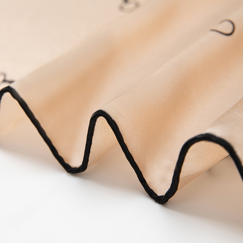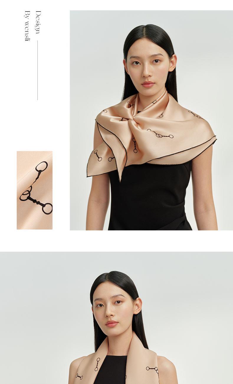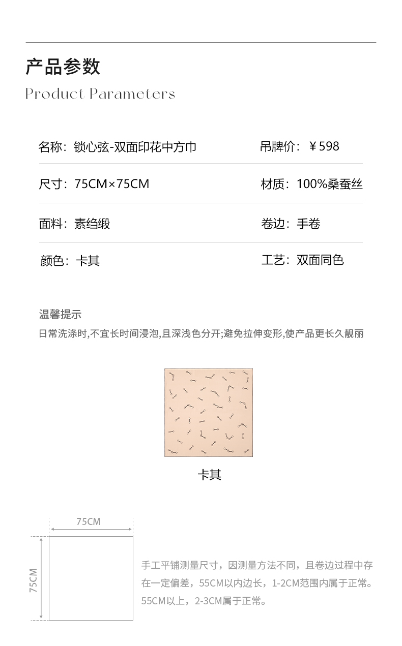 尺寸:75CM×75CM 材质:100桑蚕丝 面料:素绉缎 卷边:手卷 颜色:卡其 工艺:双面同色
