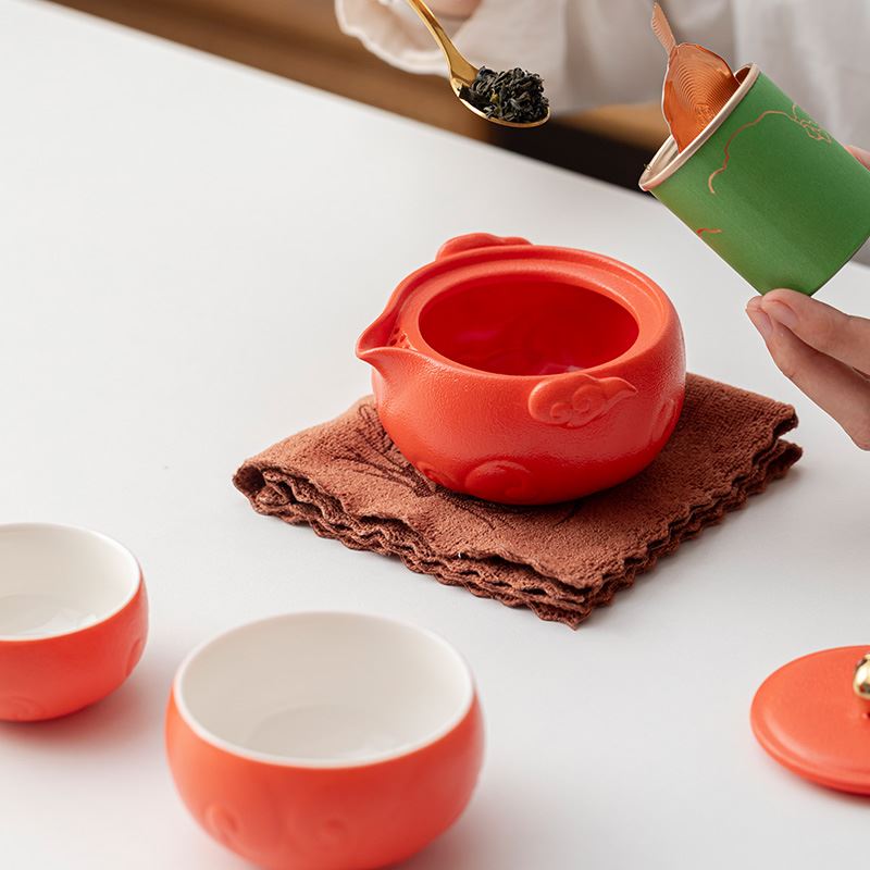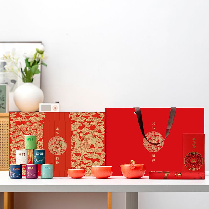 设计理念:礼盒设计灵感根植于故宫博物院珍藏的“华表柱蹲龙”与“祥云”纹饰。 茶壶盖钮精心塑造成一匹骏马,代表着自强不息、奋进不止的开拓之力。茶杯周身萦绕着经典的祥云纹样,寓意吉祥高照,福运连绵。 整个产品将龙与马融合。共同演绎出一幅“龙跃云津,马踏祥瑞”的生动画面。 品茗之间,感受的是龙之睿智祥瑞与马之奋发进取融合。这不仅是茶器的使用,更是一场精神的洗礼,激励人们在生活中始终保持昂扬向上的“龙马精神”。 产品配置:茶壶*1、客杯*1、主人杯*1、对联*1、红包*6、小罐茶*6(赠:大红袍、子君观音、云雾绿茶、正山小种、茉莉花茶、蜜香红茶各一罐)、浮雕烫金礼盒、礼袋
