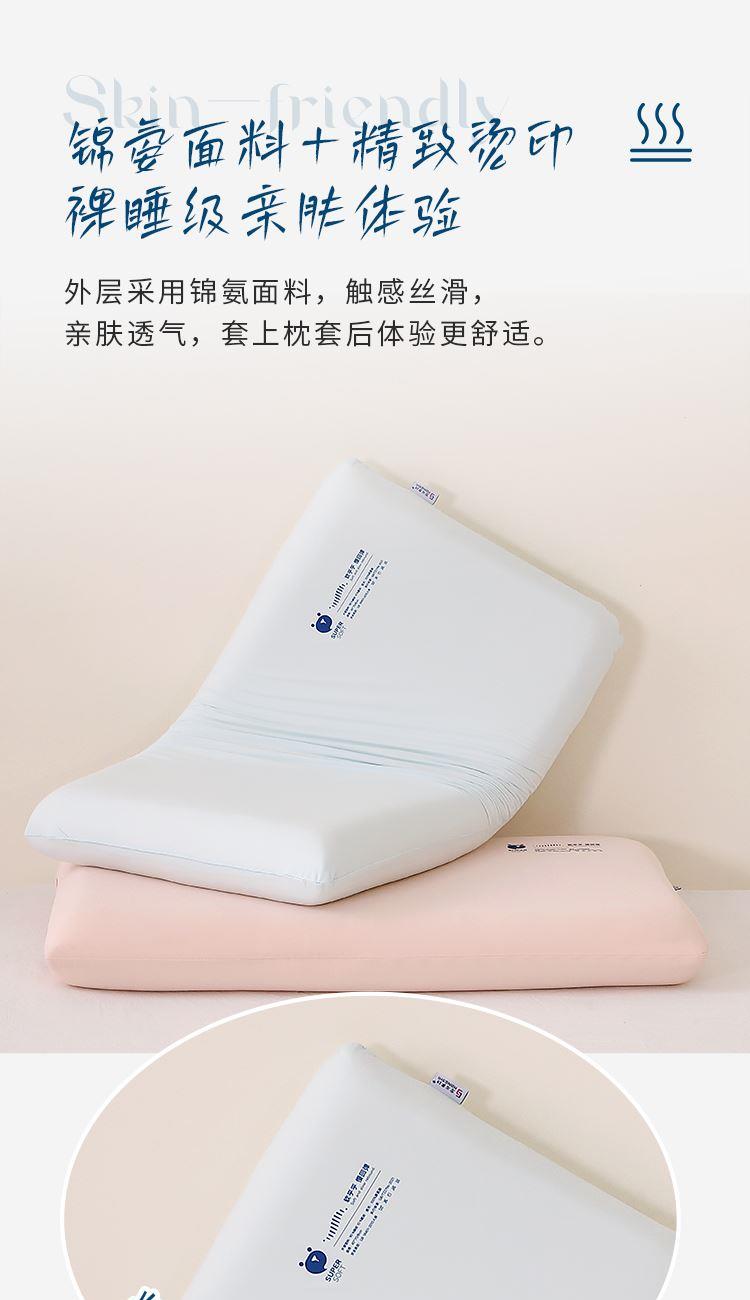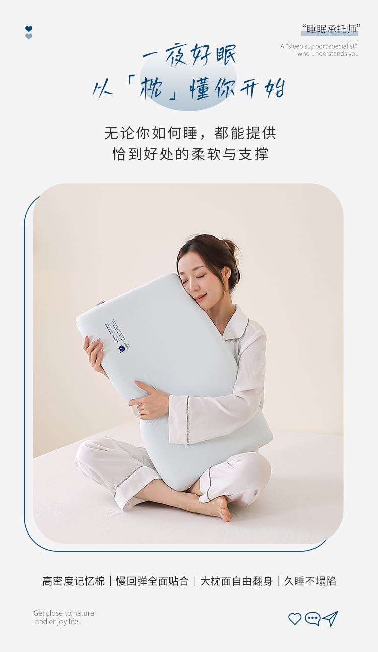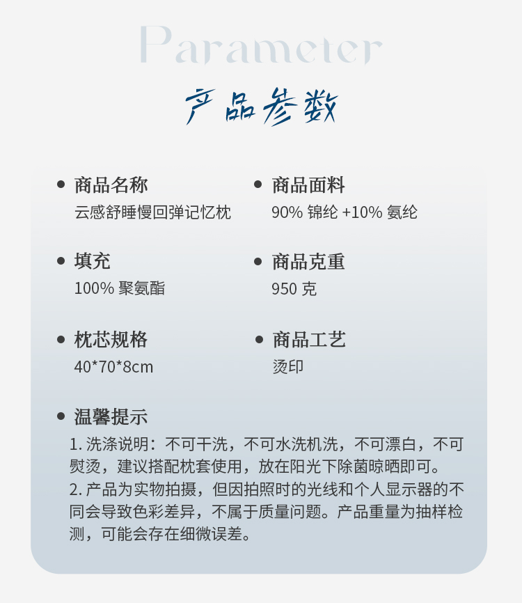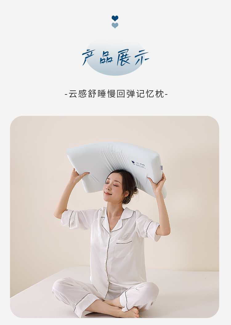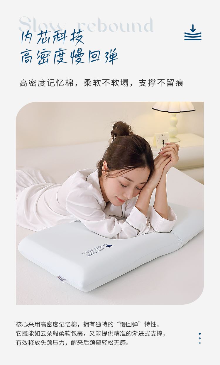 型 号:HS-Z-PU25101 面 料 :90%锦纶+10%氨纶 填 充: 聚氨酯 克 重: 950克 规 格 :40*70*8cm 产品说明: 云感舒睡慢回弹记忆枕,锦氨面料亲肤透气,细腻柔滑触碰肌肤如云朵包裹;填充慢回弹记忆棉,承托释压,温柔包裹每一处曲线 ; 烫印点缀,寓意吉祥,温暖相伴——夜夜深睡,日日福运相伴。