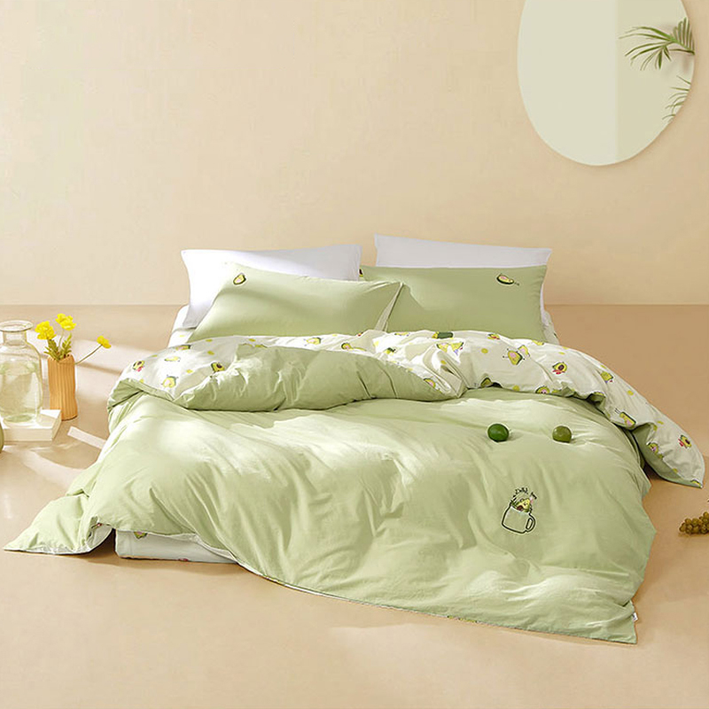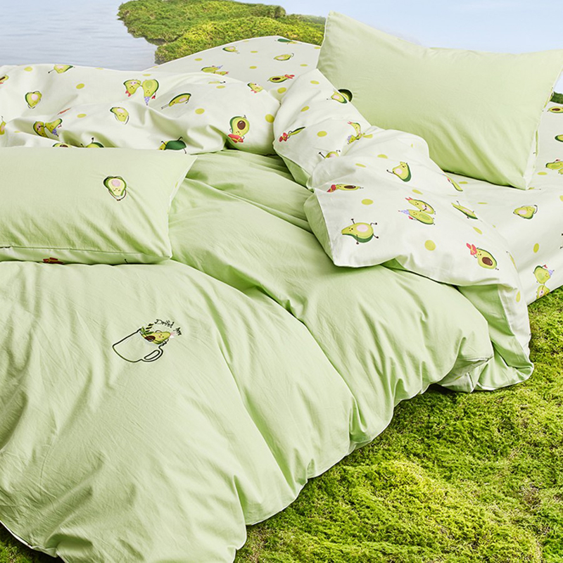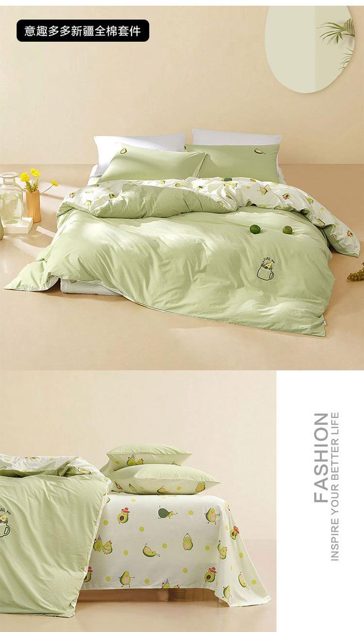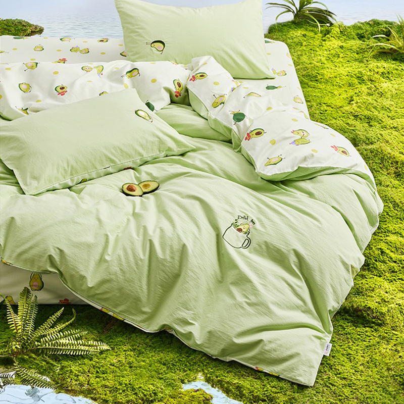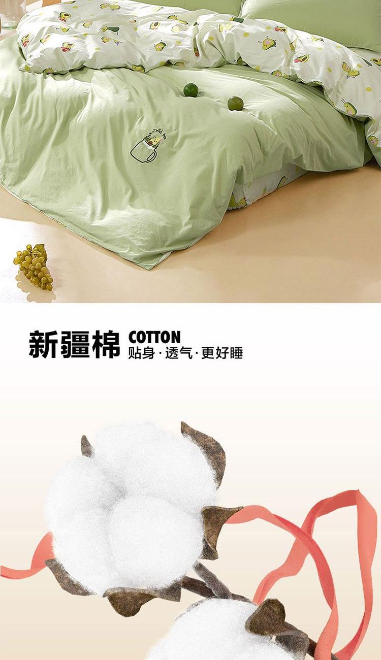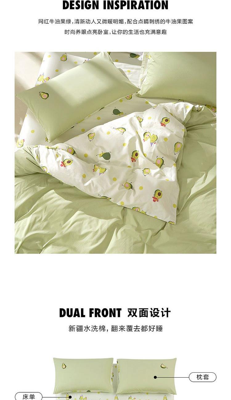 规 格 :200*230cm 被 套 :200*230(cm)*1 被 单 :150*200*35(cm)*1床笠 枕 套 :48*74(cm)*2 面 料 :棉 包 装 :礼盒包装 网红牛油果绿,清新动人又微暖明媚,配合点睛刺绣的牛油果图案 时尚养眼点亮卧室,让你的生活也充满意趣