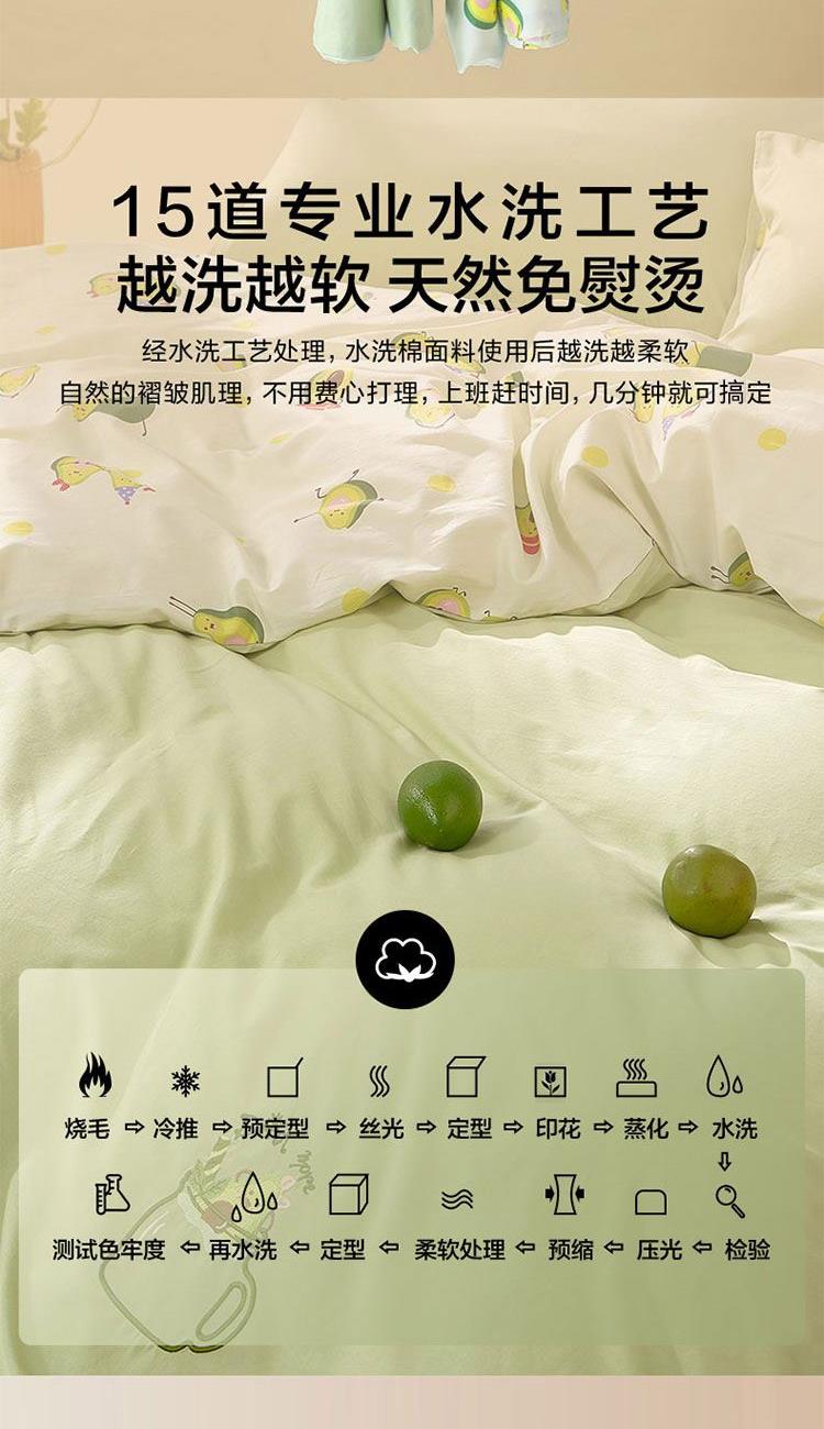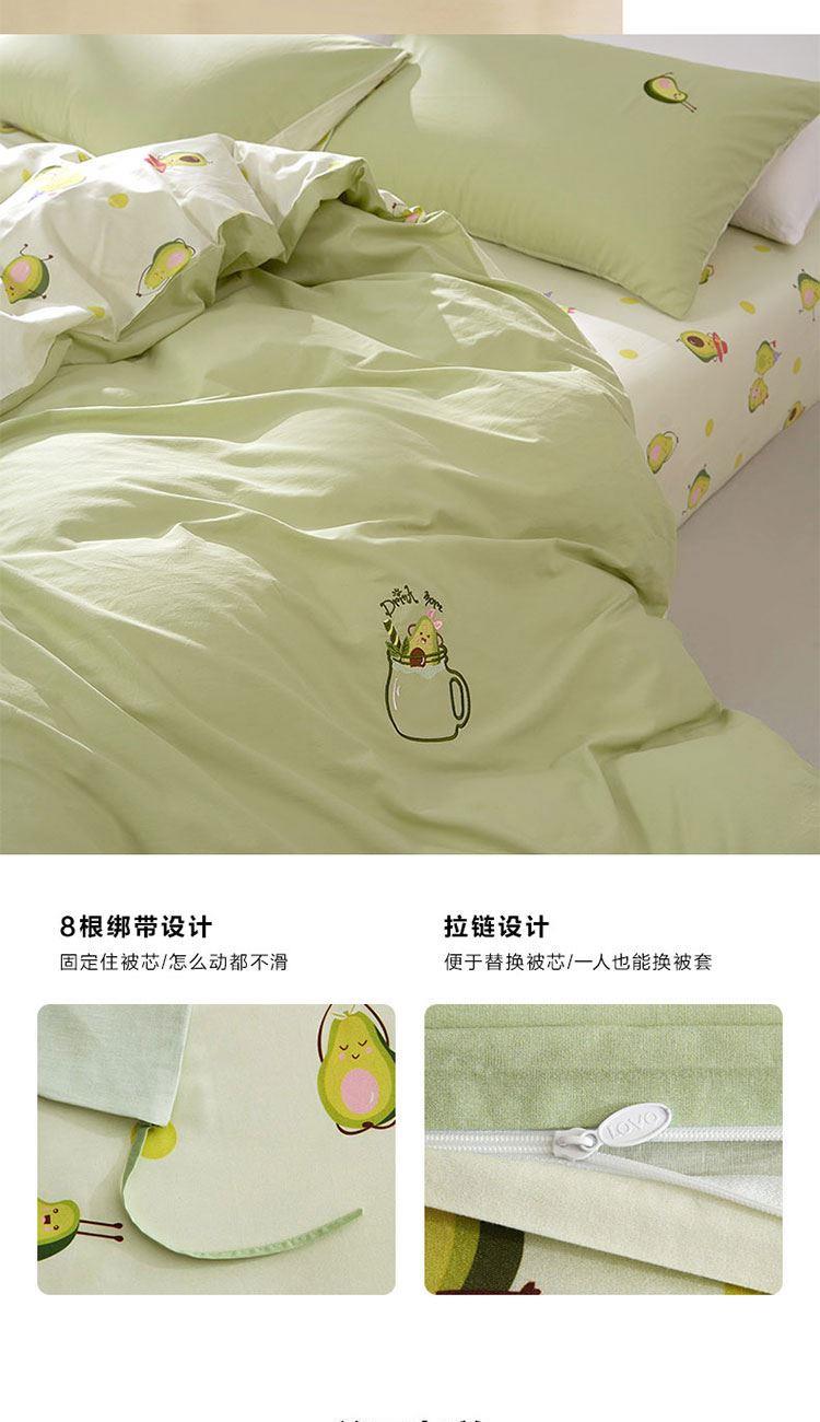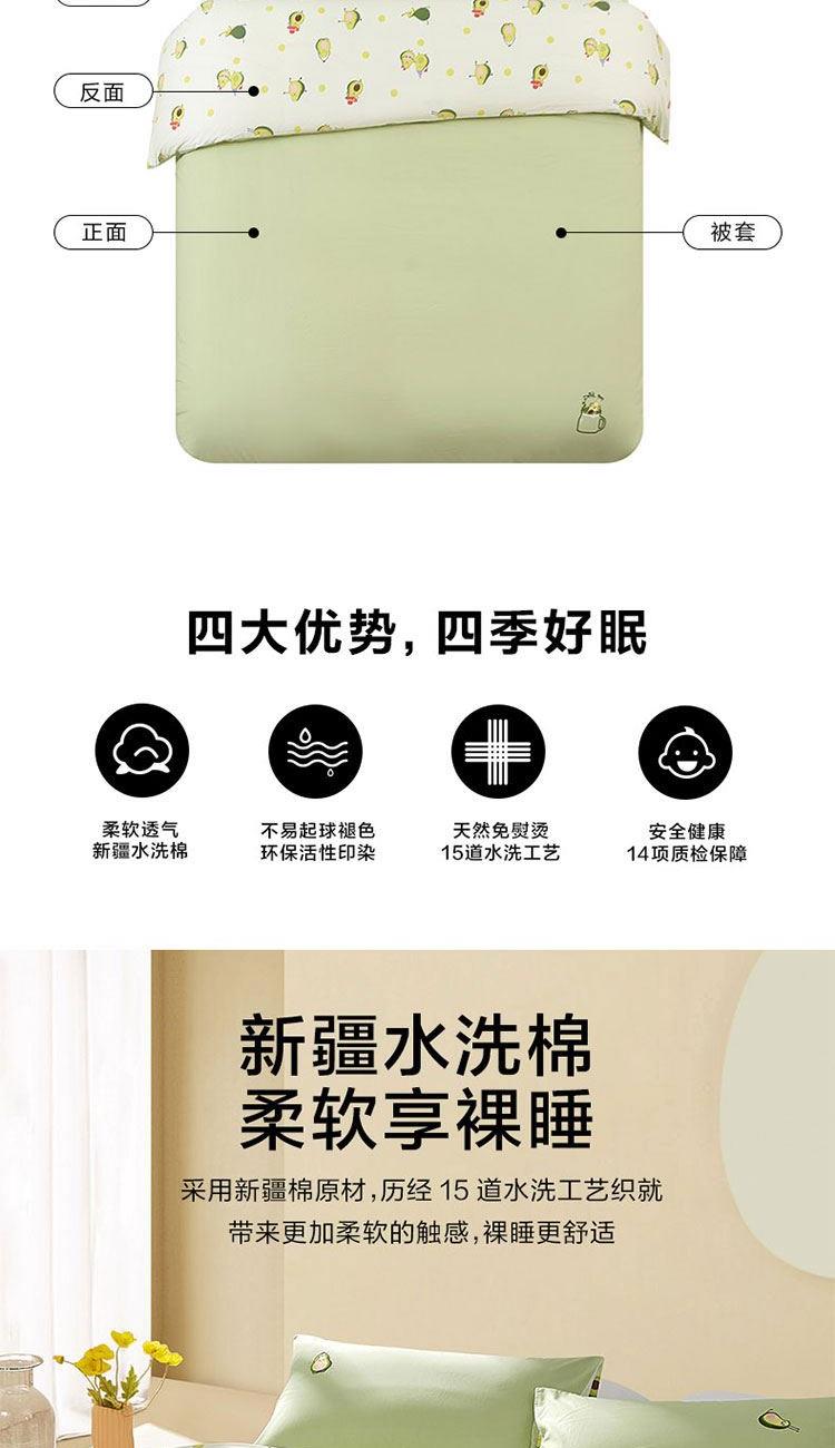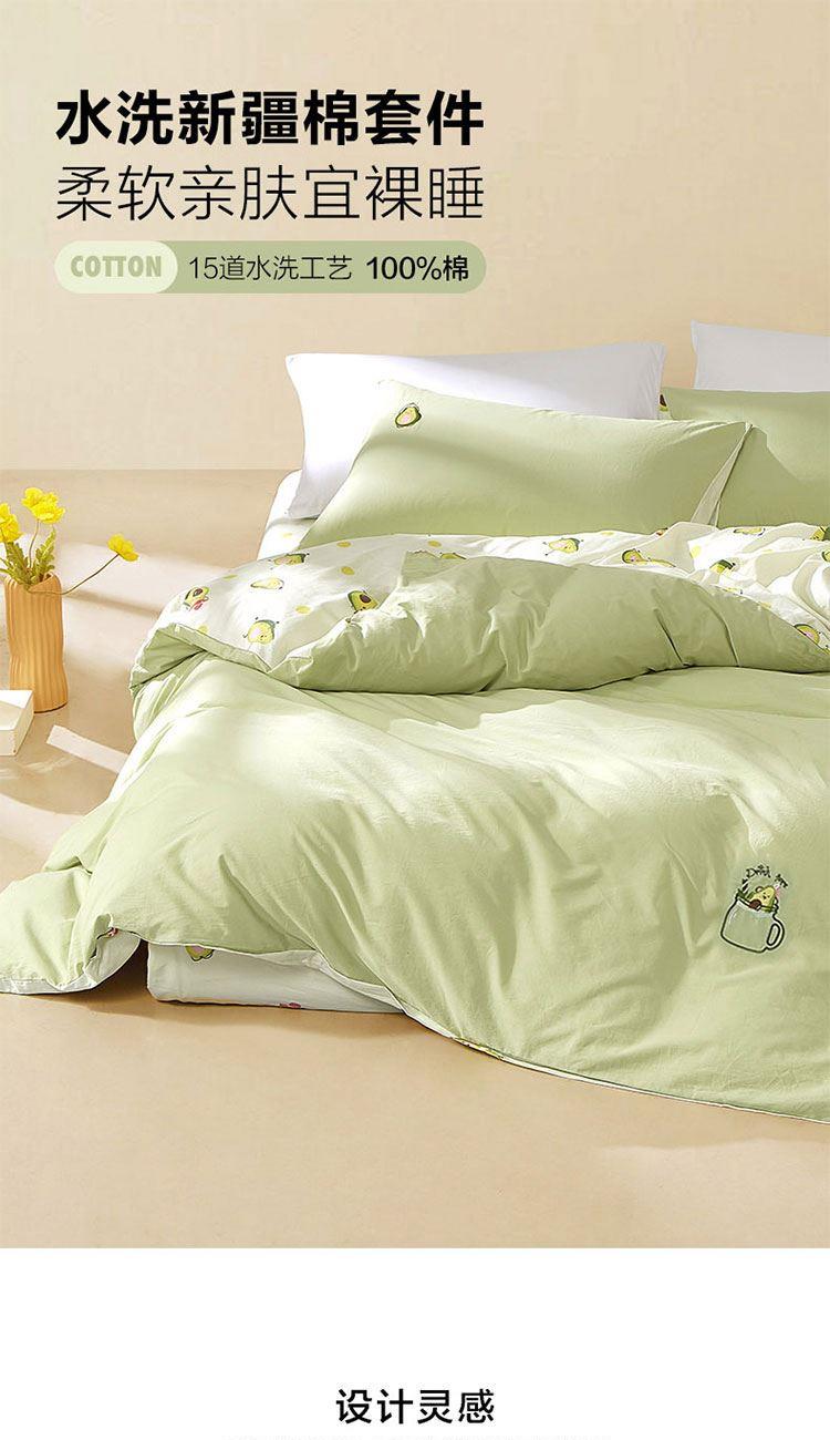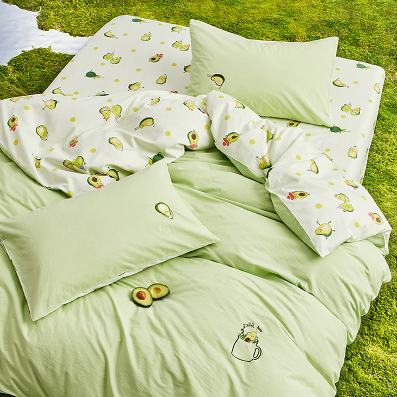 规 格 :200*230cm 被 套 :200*230(cm)*1 被 单 :150*200*35(cm)*1床笠 枕 套 :48*74(cm)*2 面 料 :棉 包 装 :礼盒包装 网红牛油果绿,清新动人又微暖明媚,配合点睛刺绣的牛油果图案 时尚养眼点亮卧室,让你的生活也充满意趣