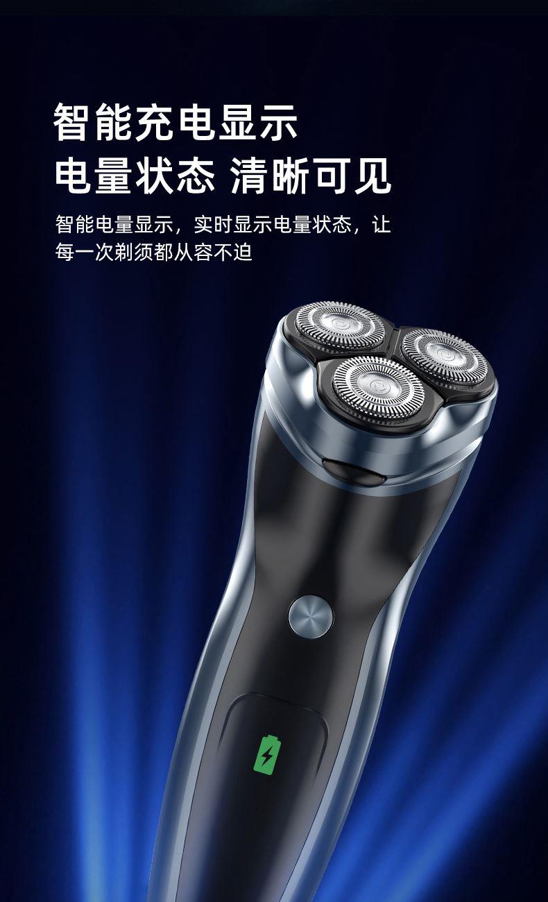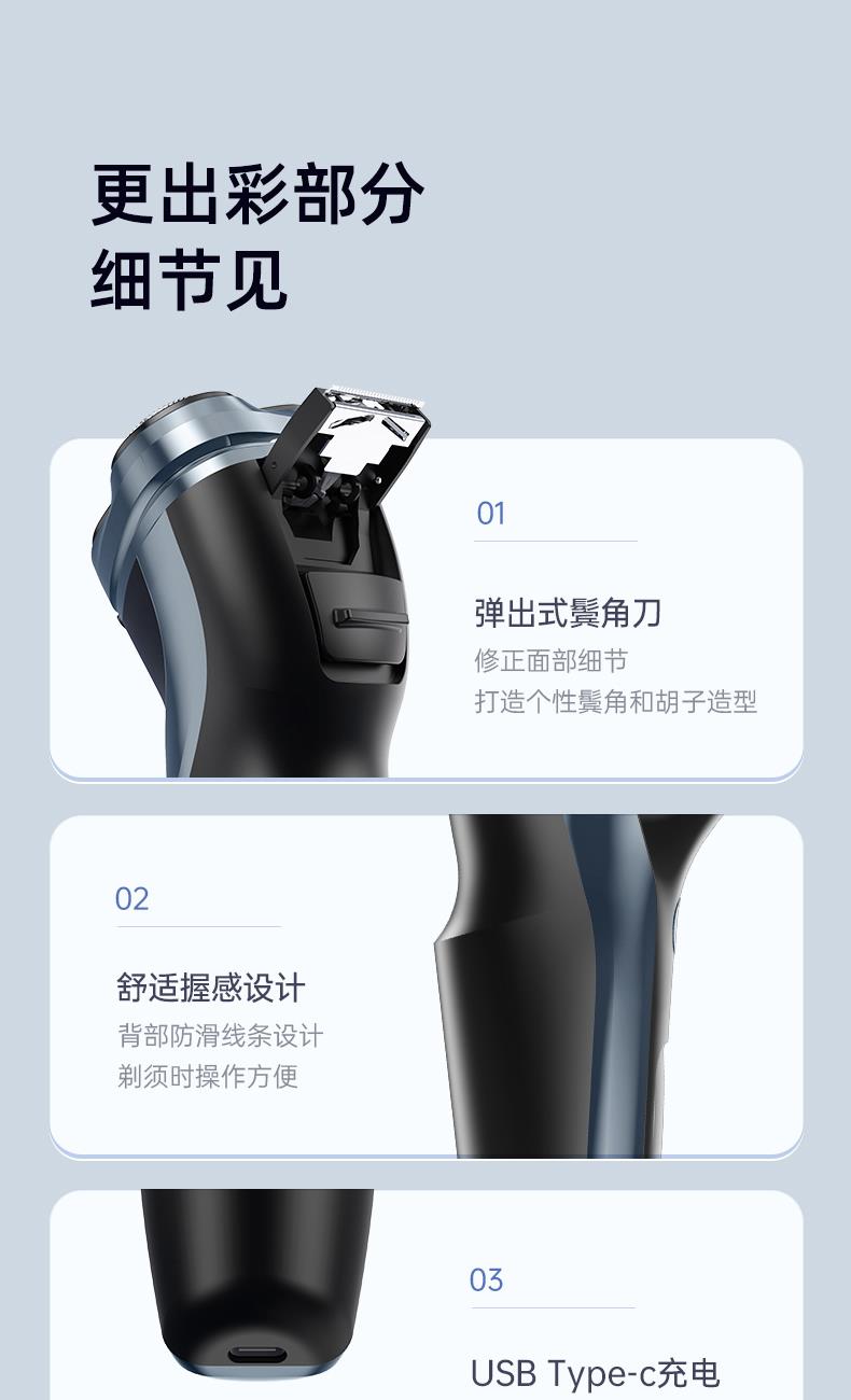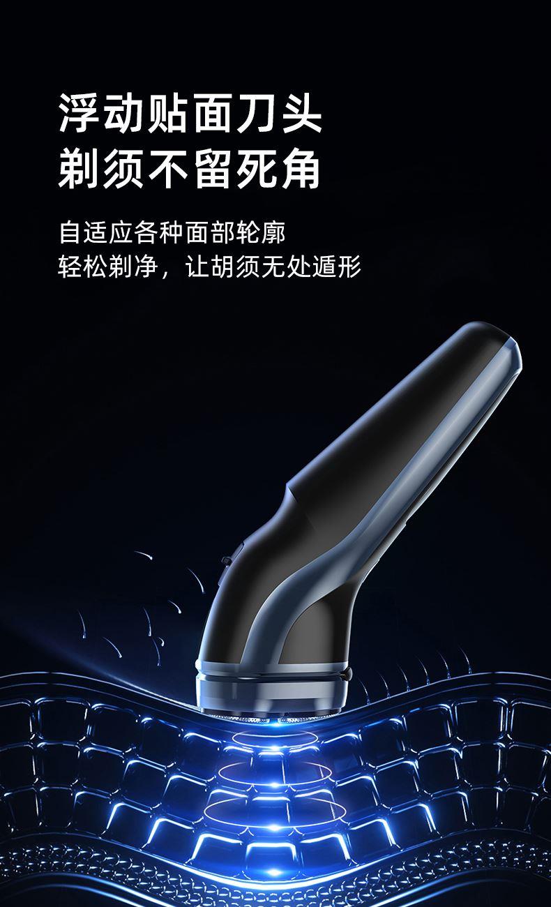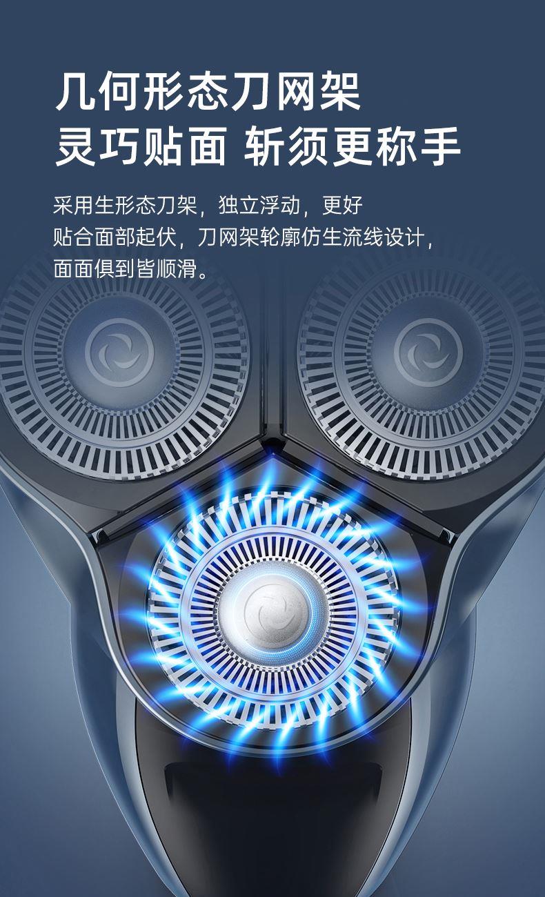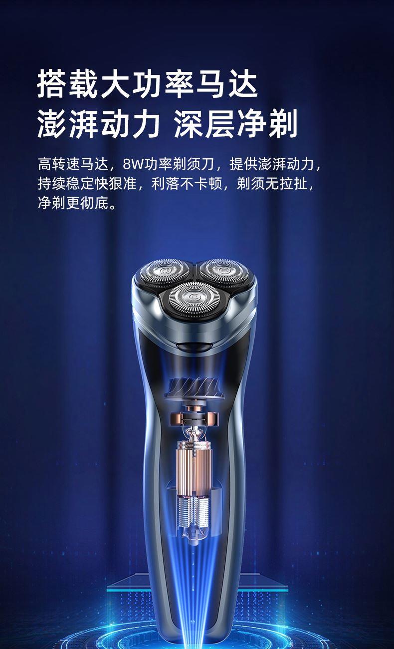额定功率:8W 双环3D贴面刀网、仿生形态刀网架 刀头自动研磨技术、1小时充电、续航40分钟 智能防夹须系统、浮动贴面剃须系统 强劲马达智控芯片、LED智能电量显示 全身水洗IPX4、支持干湿双剃、弹出式鬓角刀 包装方式:彩盒+网购包装