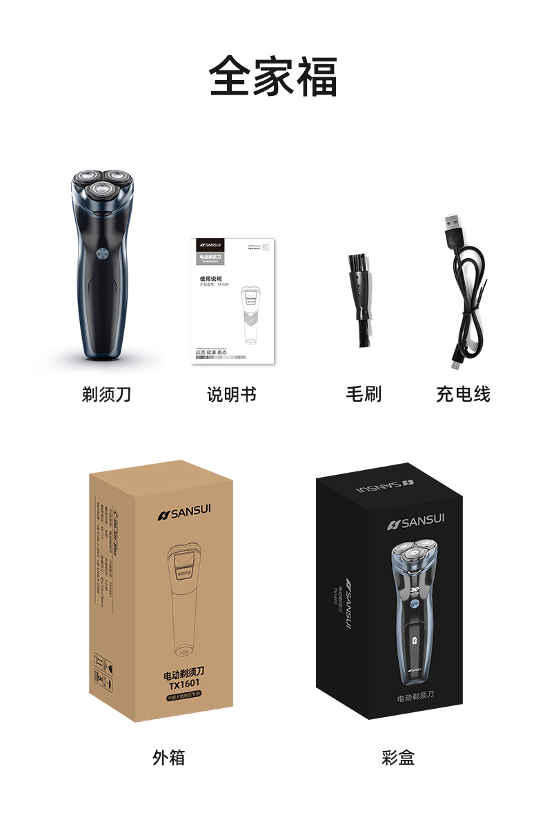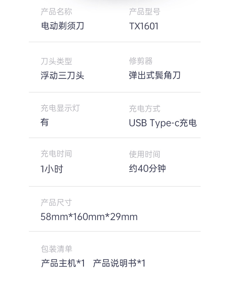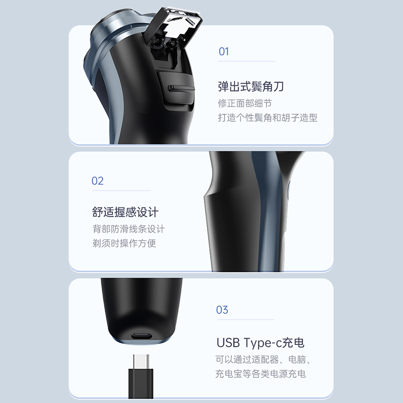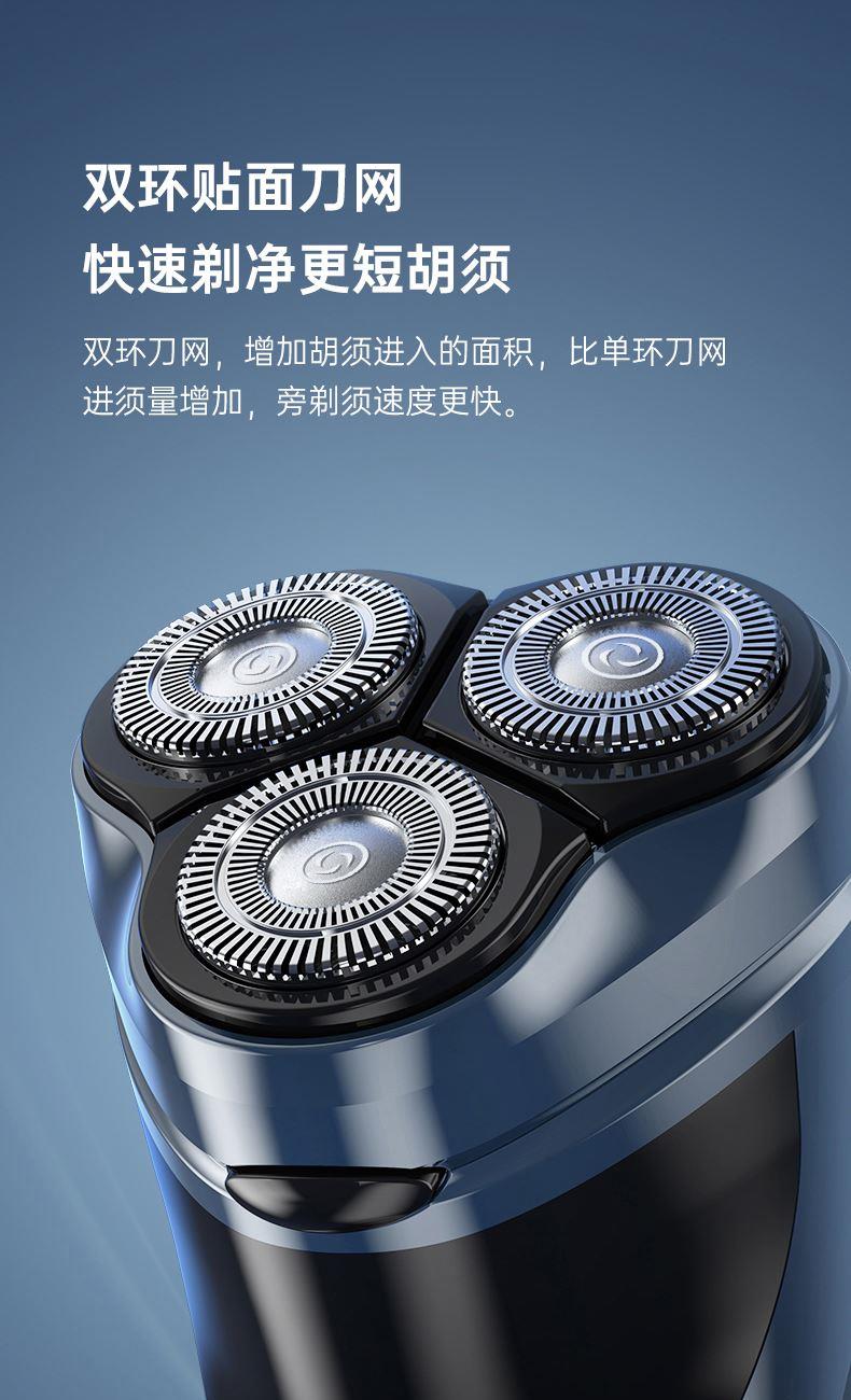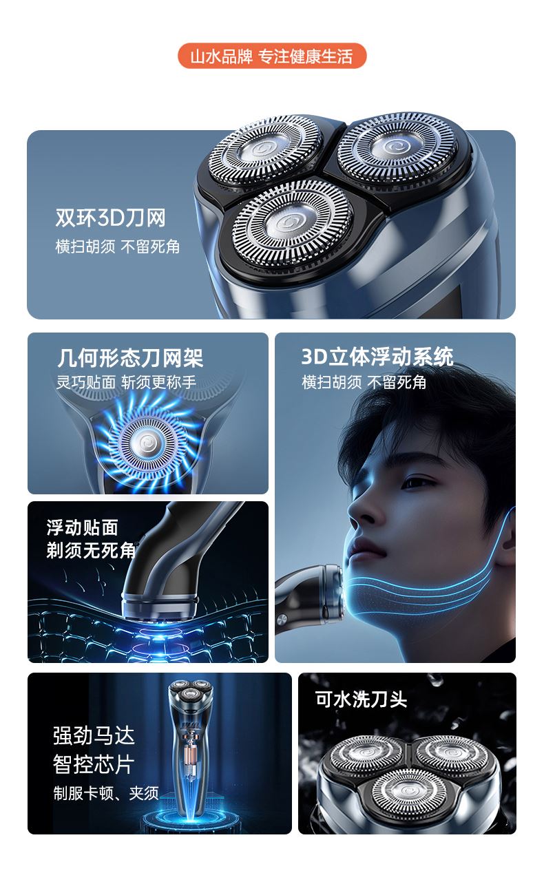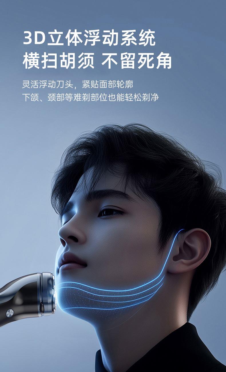 额定功率:8W 双环3D贴面刀网、仿生形态刀网架 刀头自动研磨技术、1小时充电、续航40分钟 智能防夹须系统、浮动贴面剃须系统 强劲马达智控芯片、LED智能电量显示 全身水洗IPX4、支持干湿双剃、弹出式鬓角刀 包装方式:彩盒+网购包装