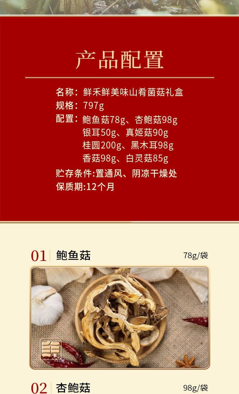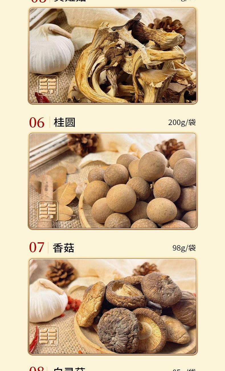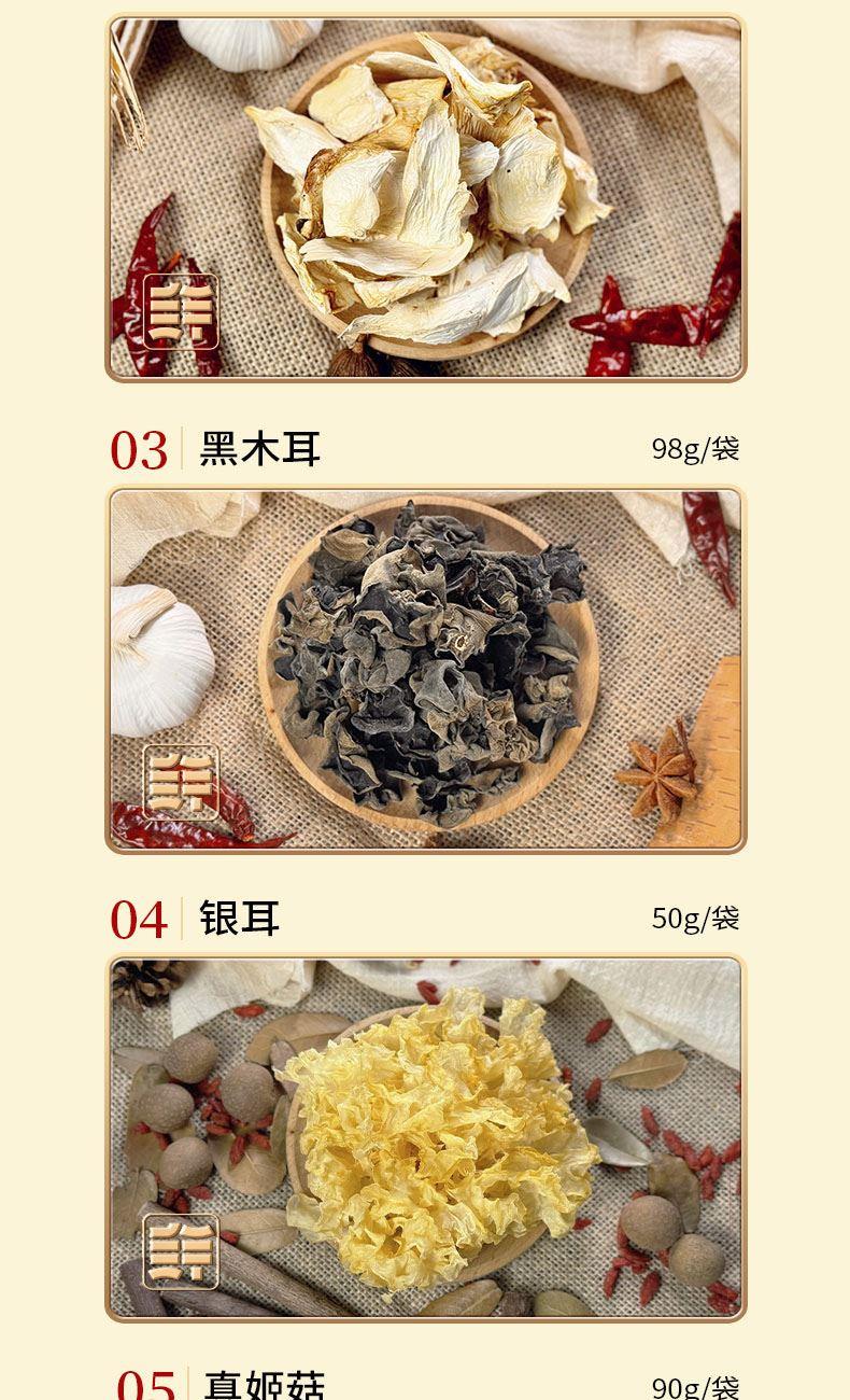 鲍鱼菇78g 杏鲍菇98g 银耳50g 真姬菇90g 桂圆200g 黑木耳98g 香菇98g 白灵菇85g 797g