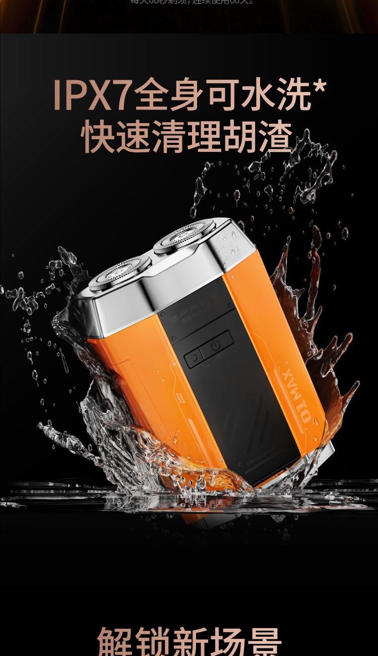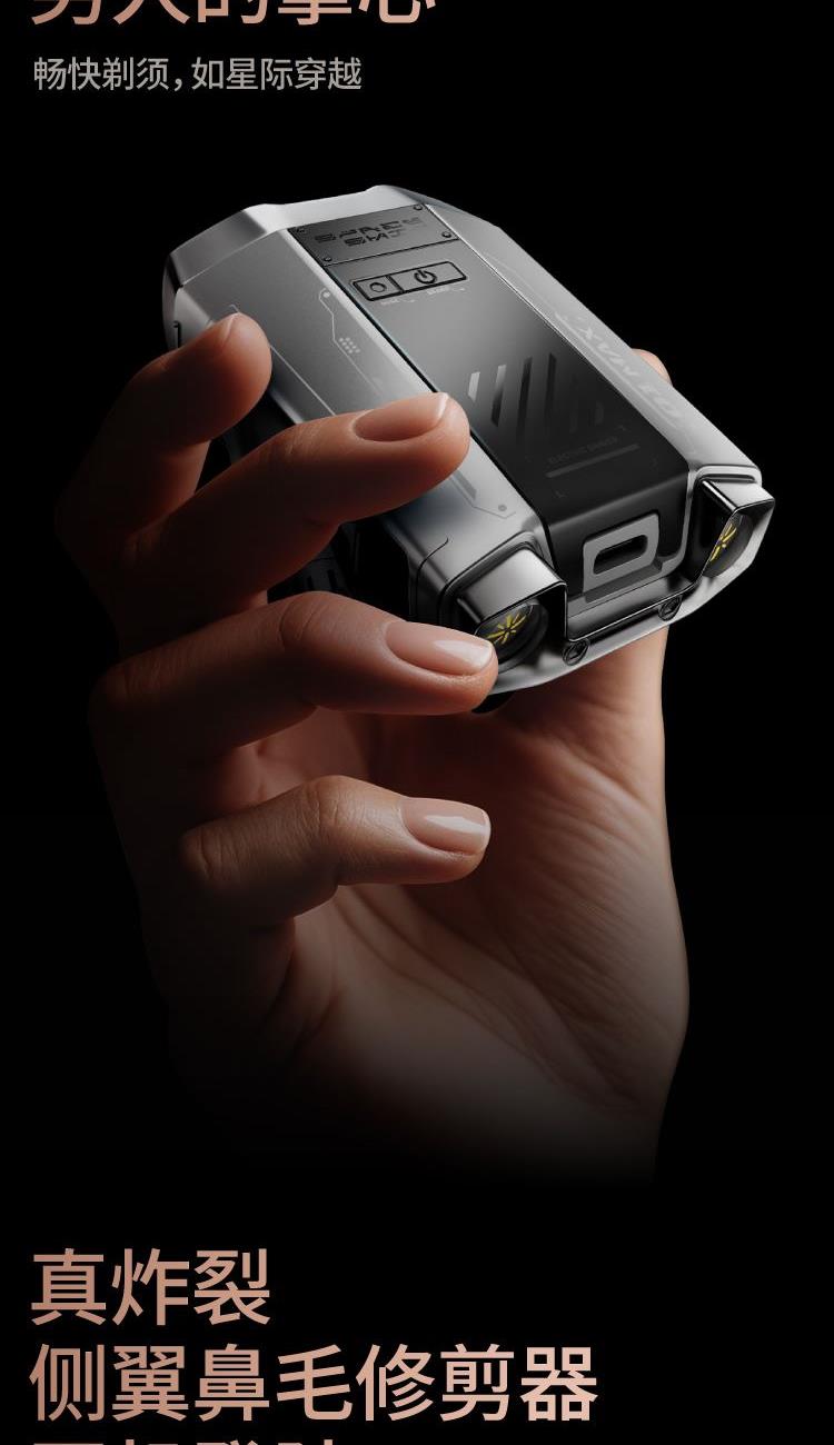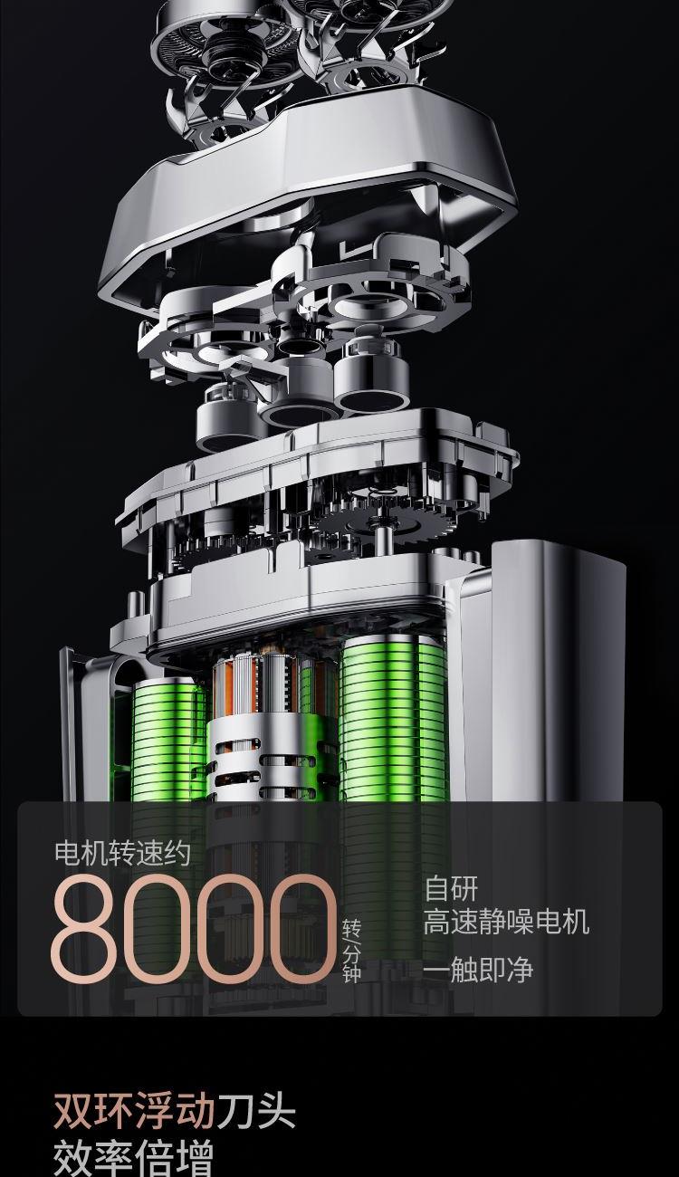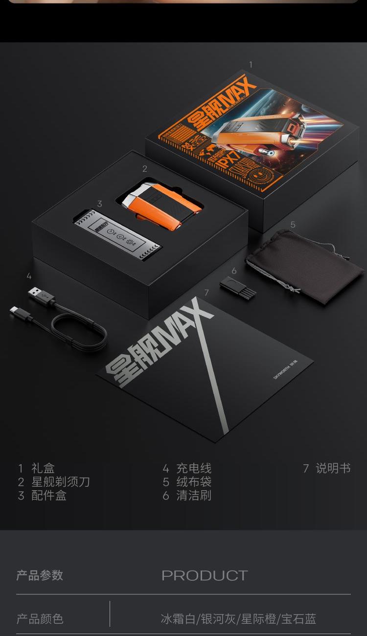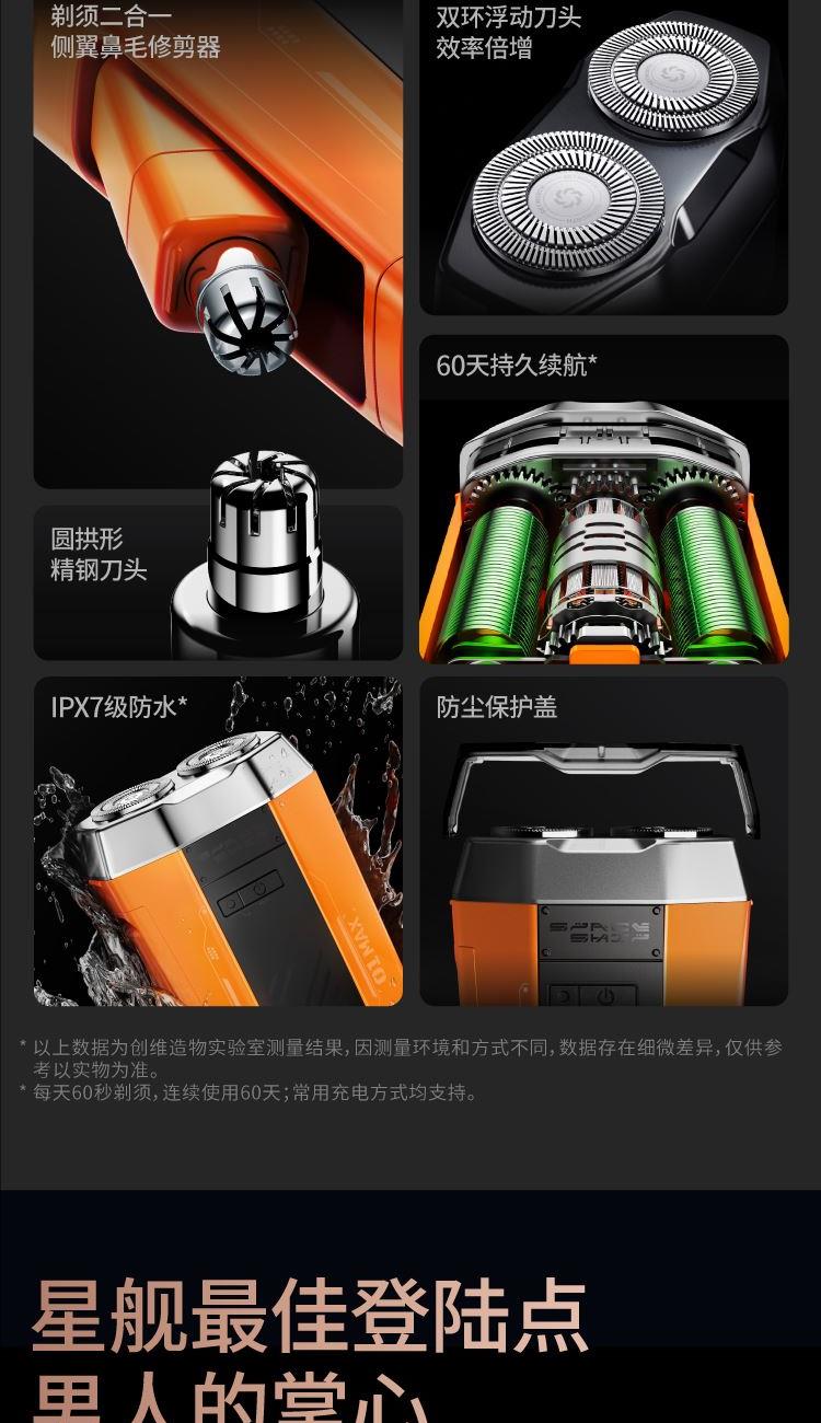 电机转速:8000转/min 刀头材质:精钢 刀头数量:2个 产品尺寸:86.8*62.5*30.5mm 产品净重:0.124kg 电压:5V 防水等级:IPX7,可全身水洗 充电时间:1小时快充 续航:60天 1、剃须2合一,侧翼鼻毛修剪器; 2、双环浮动刀头,效率倍增; 3、8000转自研高速静噪电机,够性能才够快; 4、星舰独特造型,畅快剃须; 5、IPX7级防水等级,可全身水洗;
