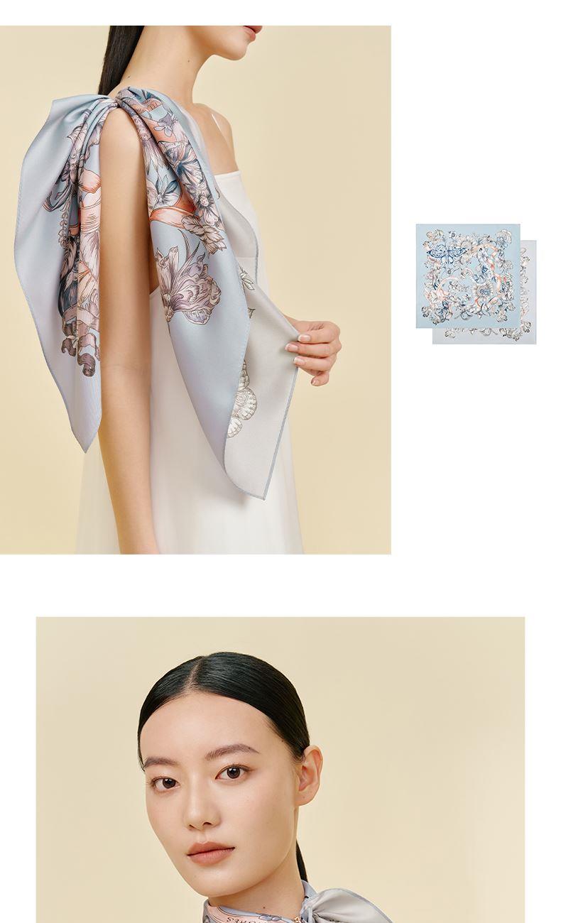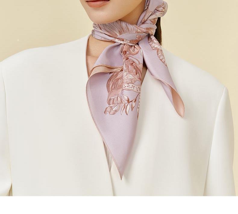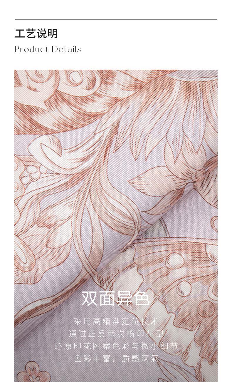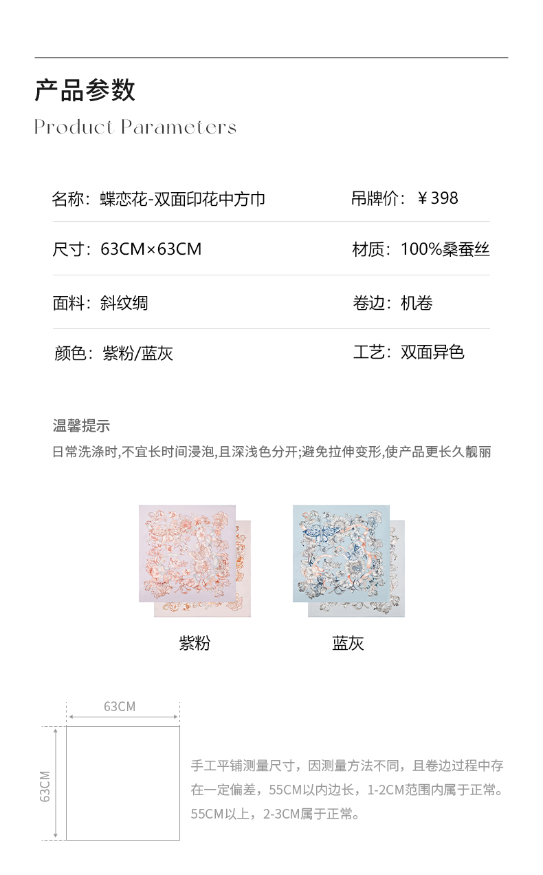 尺寸:63CM×63CM 材质:100桑蚕丝 面料:斜纹绸 卷边:机卷 颜色:紫粉/蓝灰 工艺:双面异色