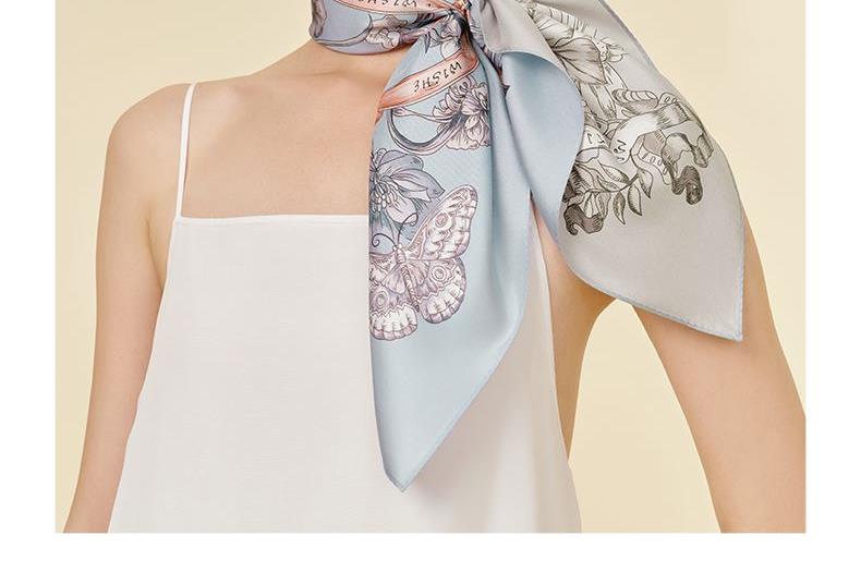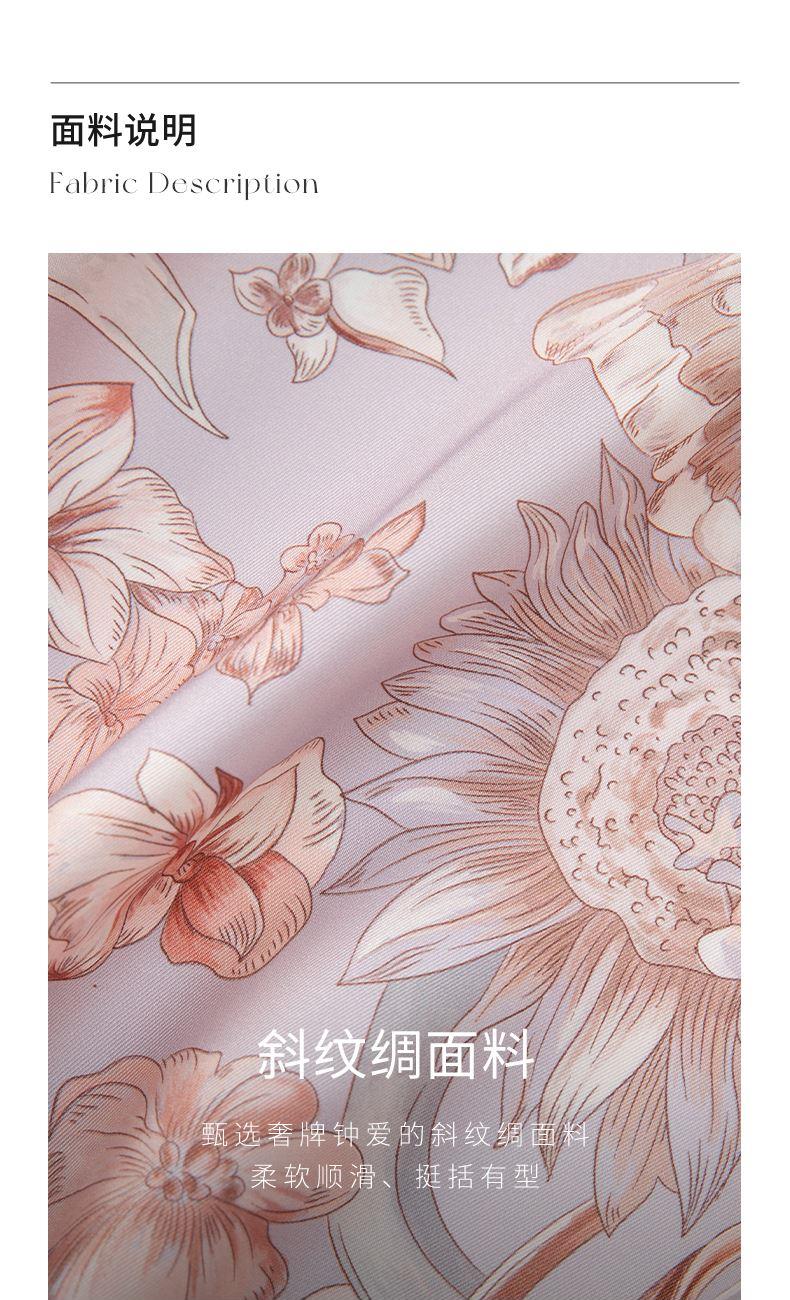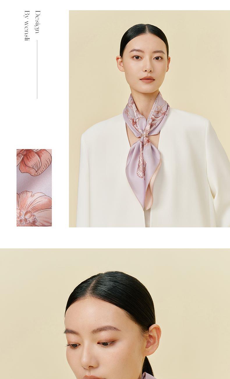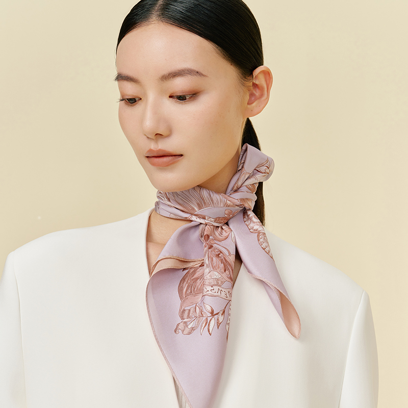 尺寸:63CM×63CM 材质:100桑蚕丝 面料:斜纹绸 卷边:机卷 颜色:紫粉/蓝灰 工艺:双面异色