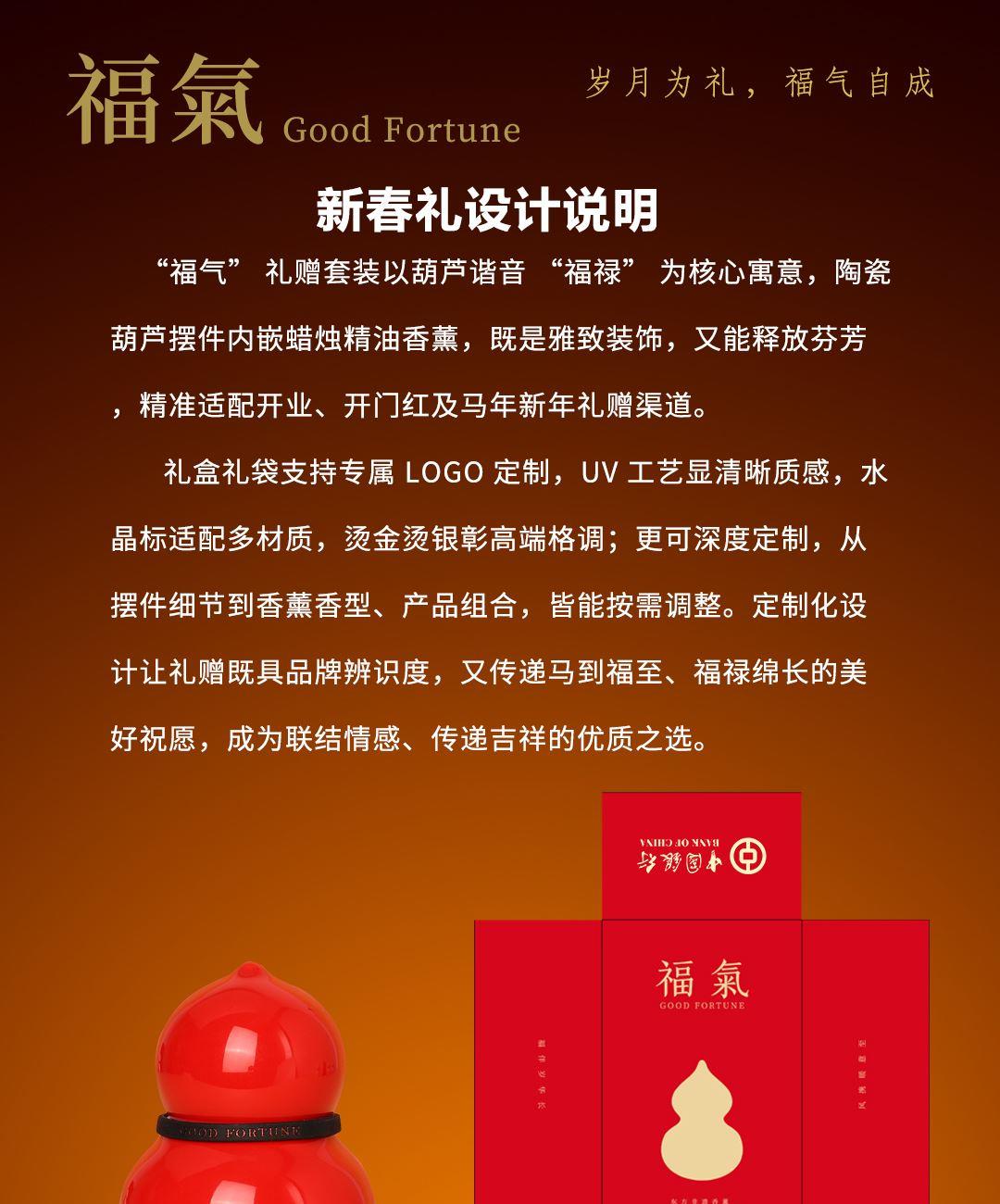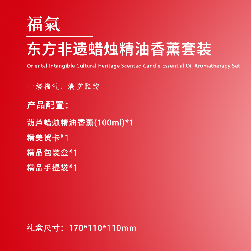 【产品配置】 葫芦蜡烛精油香薰(100ml)*1 精美贺卡*1 精品包装盒*1 精品手提袋*1 【产品说明】 以“葫芦 +福气”为核心,契合中式吉祥祝福; 红色葫芦造型+烫金礼盒,高颜值精致设计; 100ml 蜡烛精油香蒸,兼具香气与氛围营造; 搭配“福”字挂饰,强化中式祝福氛围; 可作自用香薰、节日礼品、家居装饰,多场景适配。