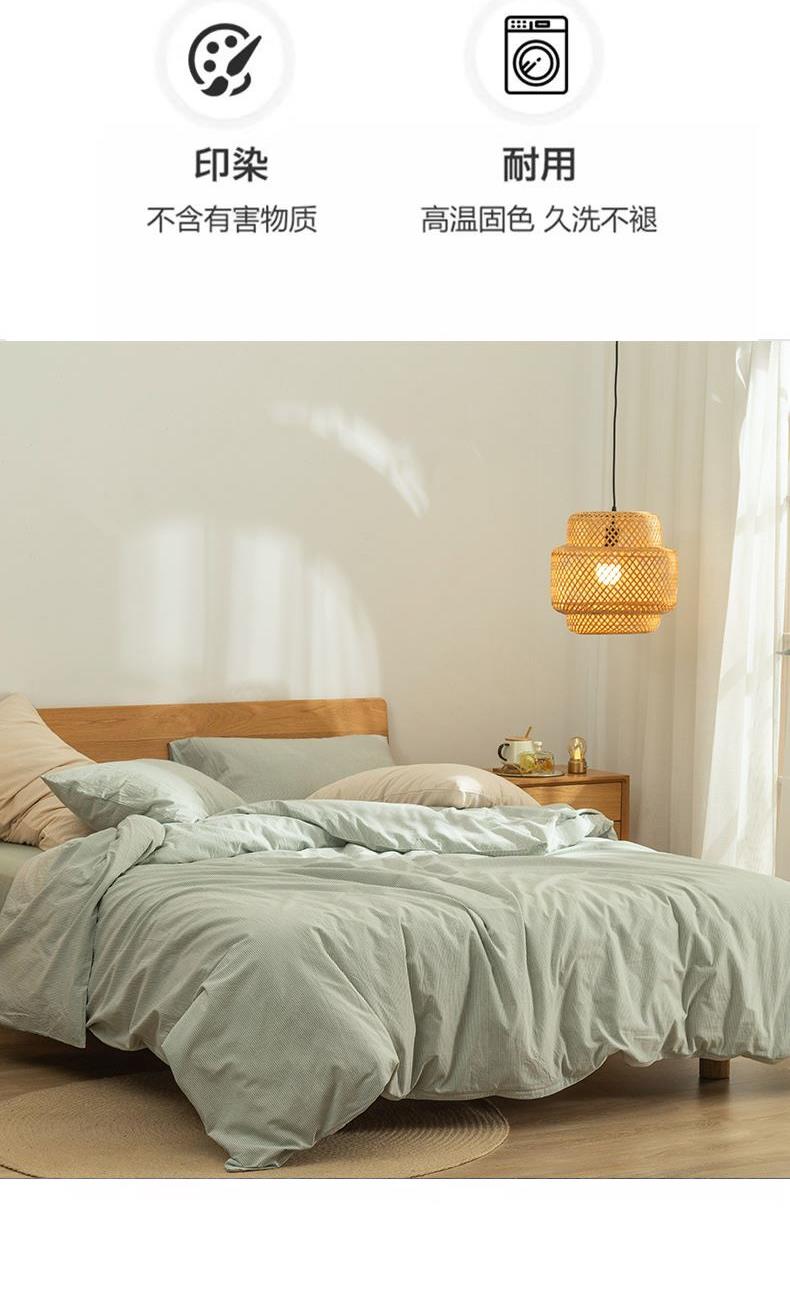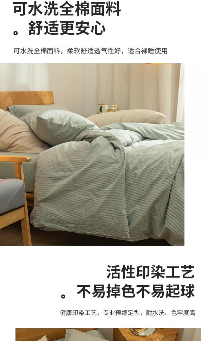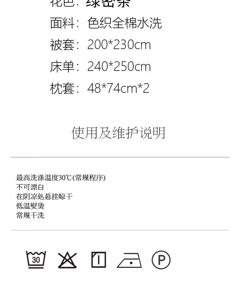 花色:绿密条 面料:色织全棉水洗 被套*1:200*230cm 床单*1:240*250cm 枕套*2:48*74cm*2 包装方式:opp袋 包装尺寸:330*260*80mm 单套重量:2.2kg 1、全棉活性印花面料,绿色环保,色泽自然靓丽,久用不掉色,细腻柔润舒适,亲肤性好,吸湿透气,让您享受一种清馨自然的舒适睡眠。 2、历经多道印染工艺,经精梳后纺织而成,贴身舒适,柔软亲肤质感。