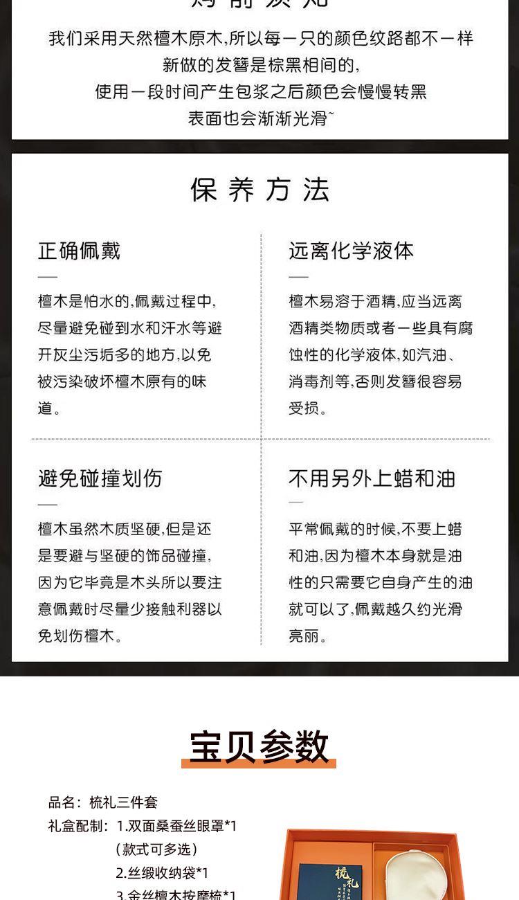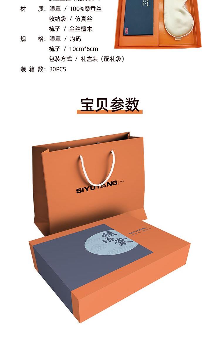 礼盒配制:1.双面桑蚕丝眼罩*1(款式可多选) 2.丝缎收纳袋*1 3.金丝檀木按摩梳*1 材质:眼罩/桑蚕丝 收纳袋/仿真丝 梳子:金丝檀木 规格:眼罩:均码 梳子:10cm*6cm 包装方式:礼盒装(配礼袋)