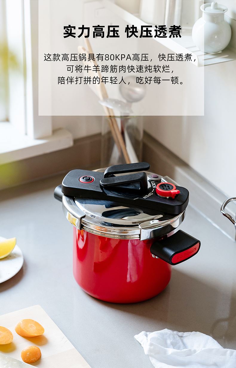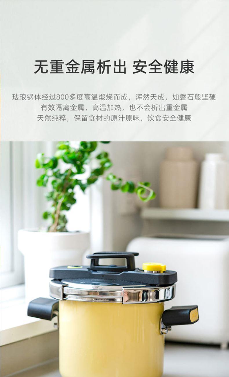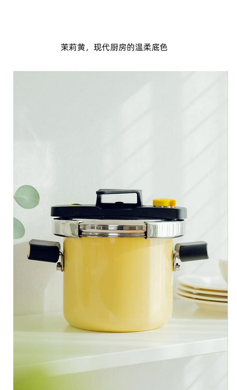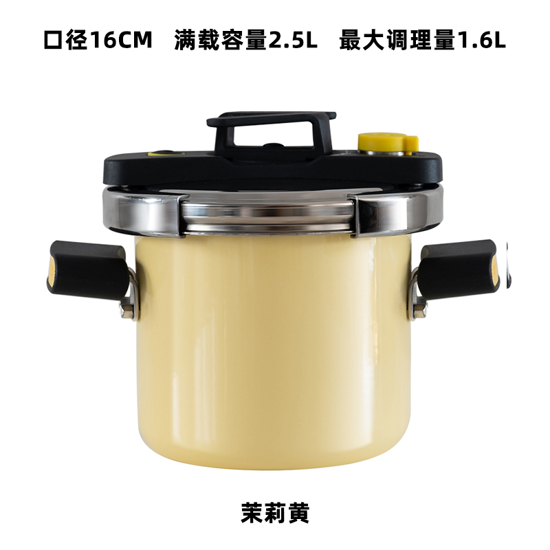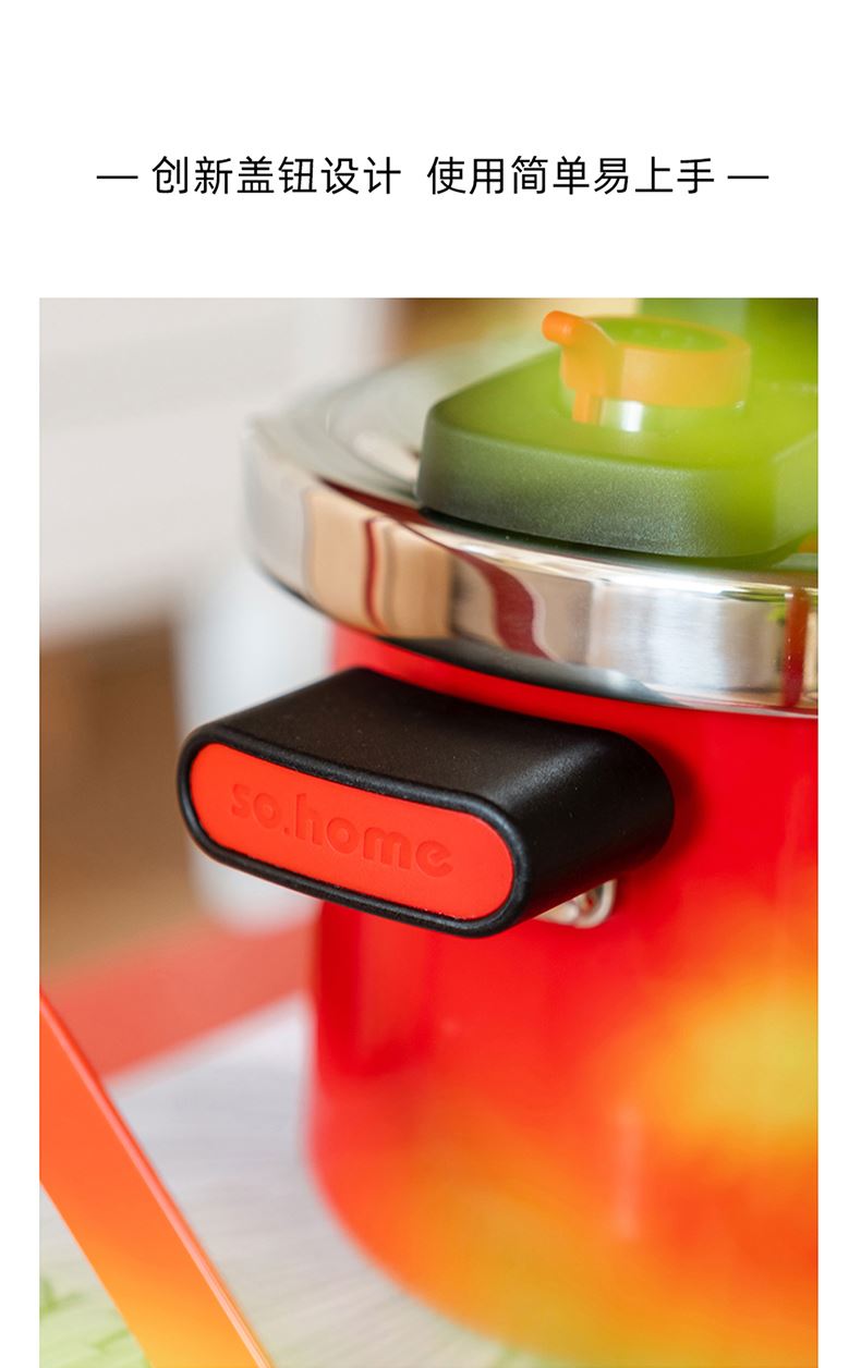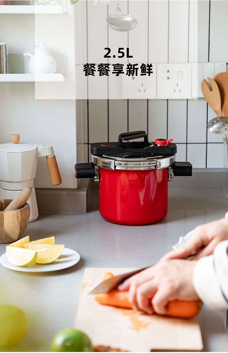 产品容量:2.5L 产品材质:10Cr17不锈钢、珐琅、电木、PP、硅橡胶、尼龙、 钢化玻璃 产品颜色:茉莉黄、红色 1、小肚子大能量,80kpa的压力,旋转开关设计,省时省力,轻松掌握使用超简单; 2、一锅双盖,高压烹饪硬菜,玻璃锅盖日常料理,一锅多用,尼龙耐高温把手,高颜值硬实力,不怕烈火炙烤; 3、430不锈钢锅体,可用于煤气灶、电磁炉、电陶炉、烤箱的烹饪; 5、德国进口珐琅釉彩涂装,耐腐蚀抗酸碱,保持食物原始风味; 6、四重840℃高温窑炉烧制, 坚固耐用,久烧不黑 ,靓彩永不褪色。