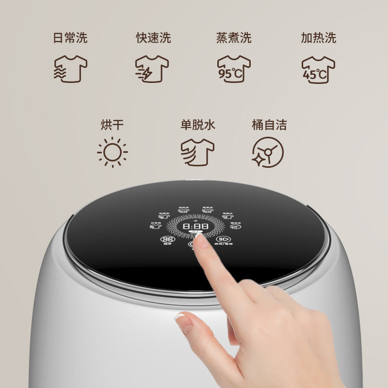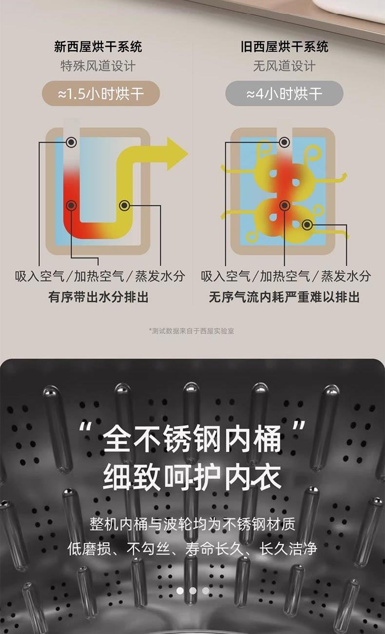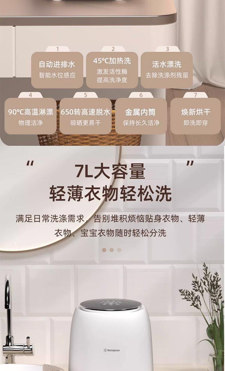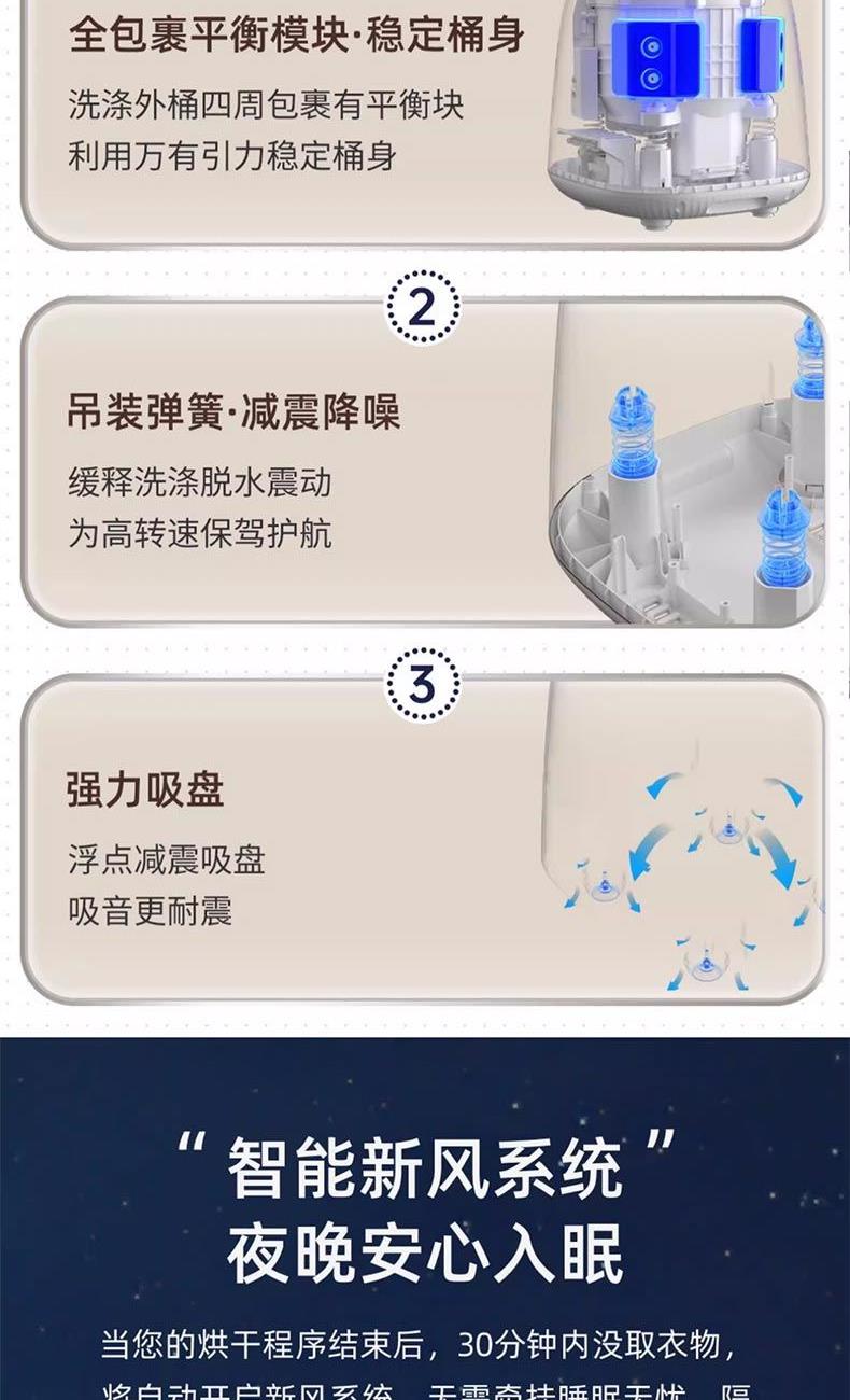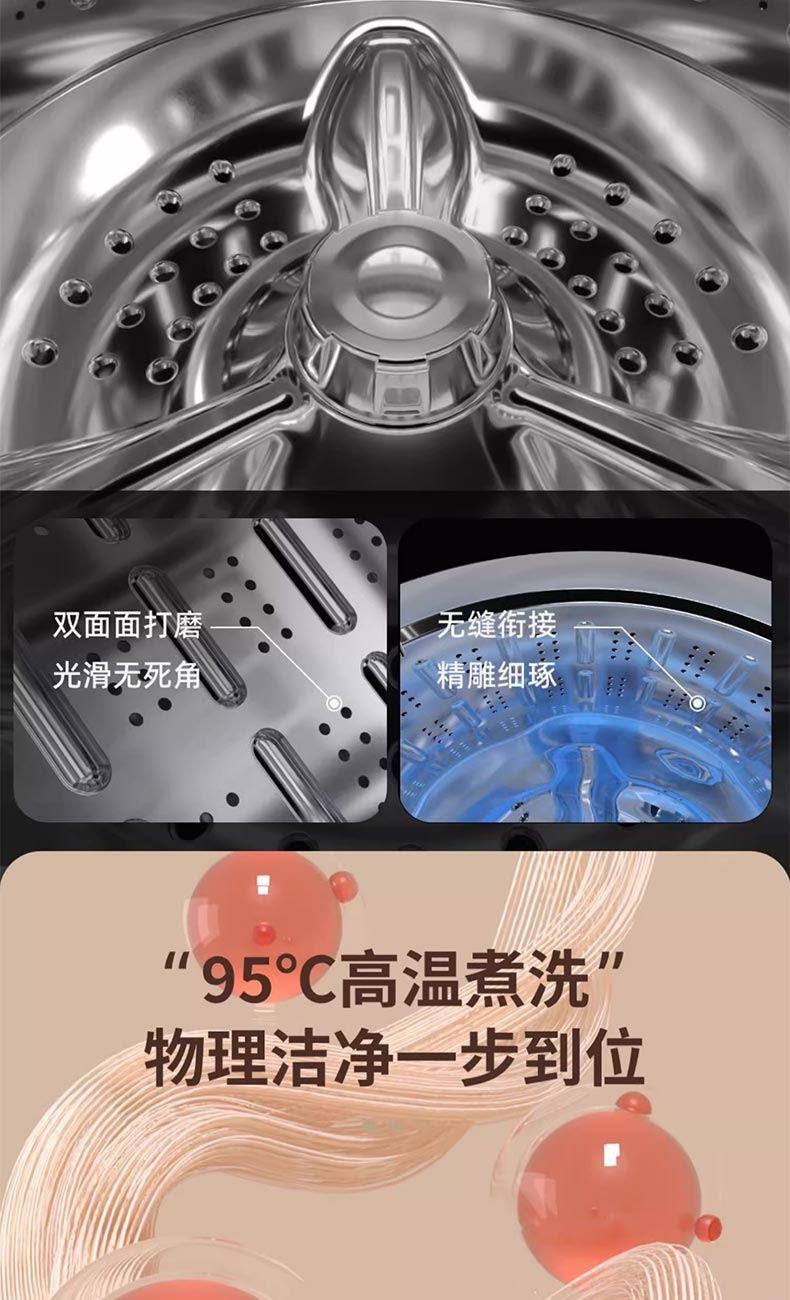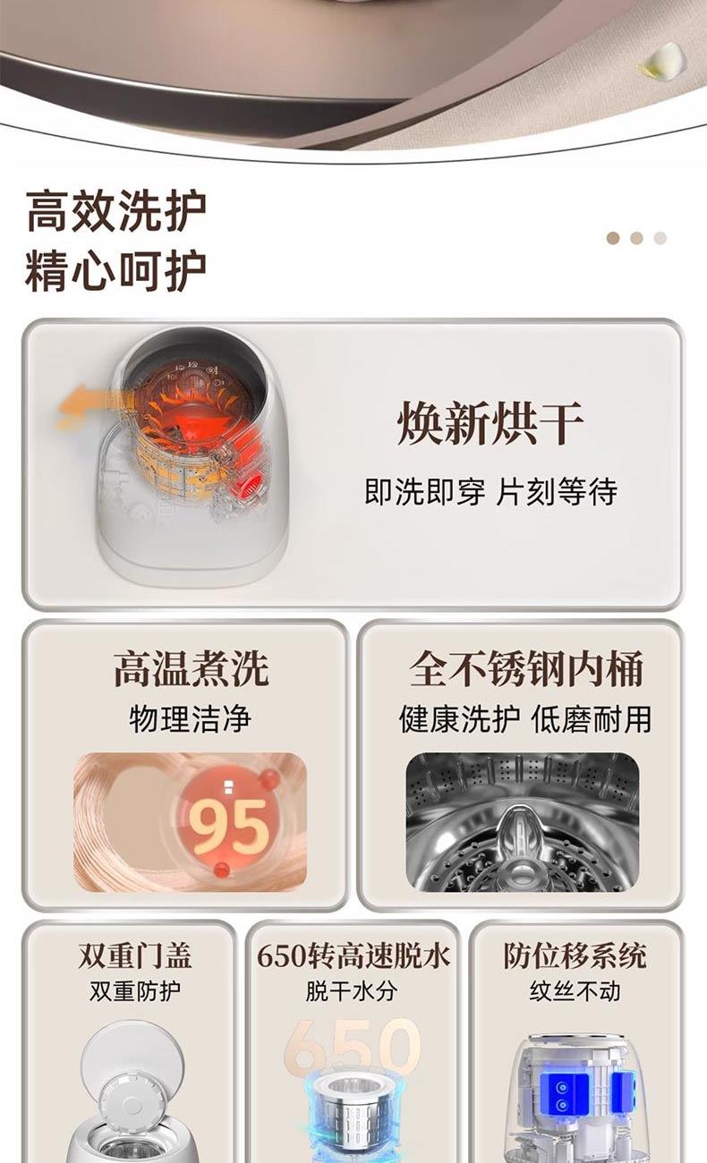 焕新烘干、95°高温煮洗 全不锈钢内筒、双重门盖 650转速脱水、防移位系统; 七合1一键洗消洪