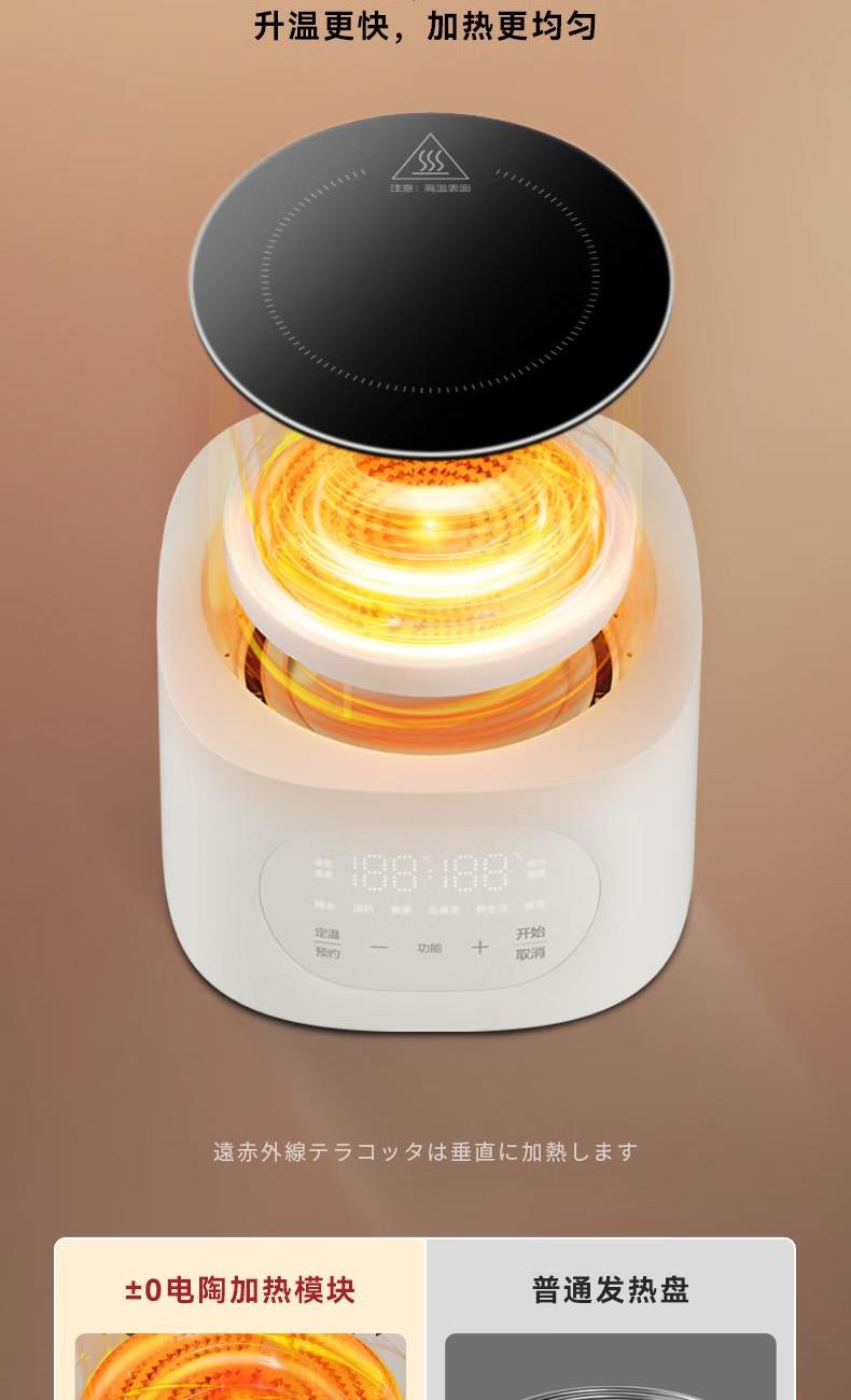 容量1L 额定电压220V 额定功率900W 全玻璃一体 可拆上盖 发热盘涂层材质 0涂层 12小时长效预约,24小时自动保温 5大花样菜单,养生需求全满足 远红外电陶炉芯,升温更快,加热更均匀 加厚高硼硅玻璃,无磨底,无惧骤冷骤热