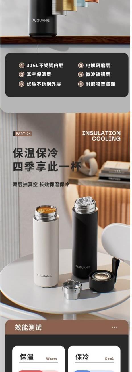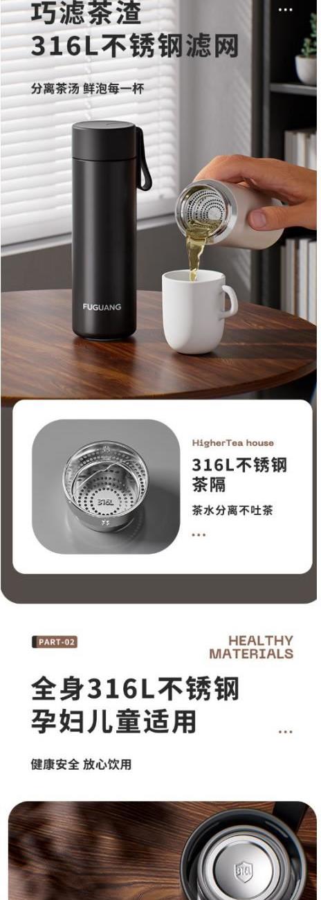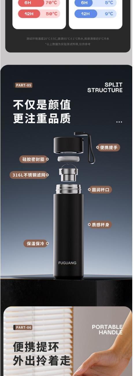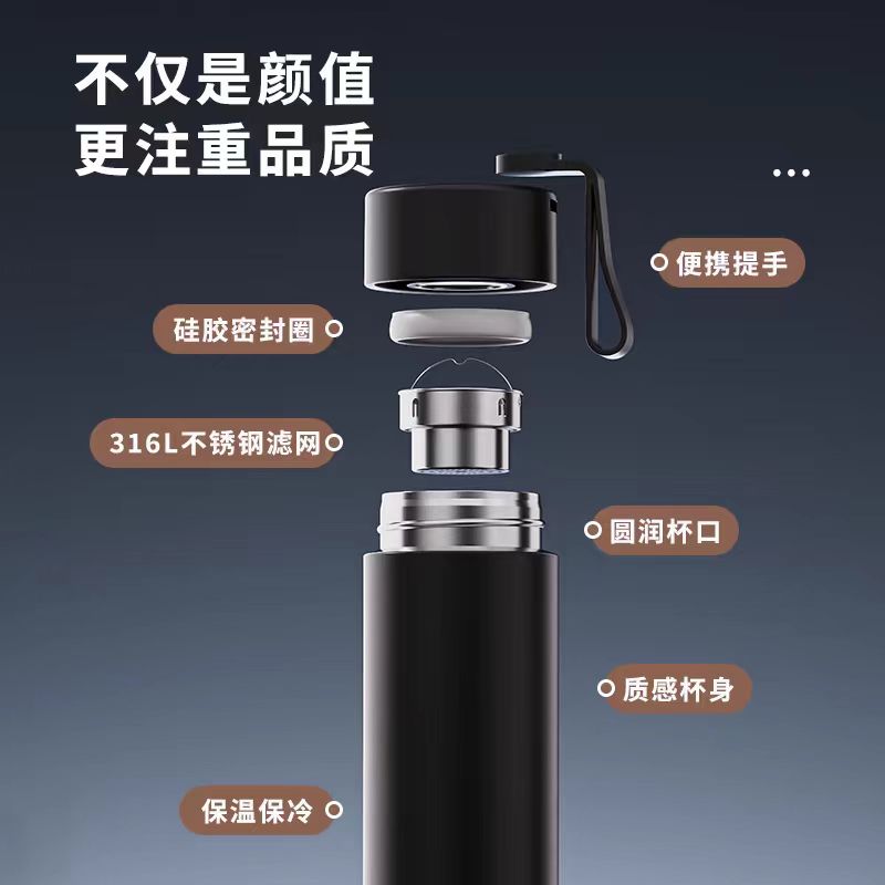 颜色:黑色 白色 粉色 绿色 容量:480ml 尺寸:62*210mm 材质:316奥氏体不锈钢内胆,316不锈钢滤网。 无尾真空超长保温。 超轻杯身设计,加宽硅胶提手随身携带更方便。 包装:单瓦盒