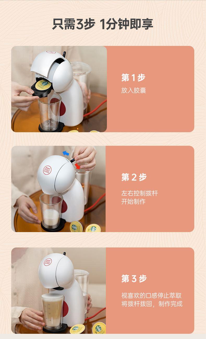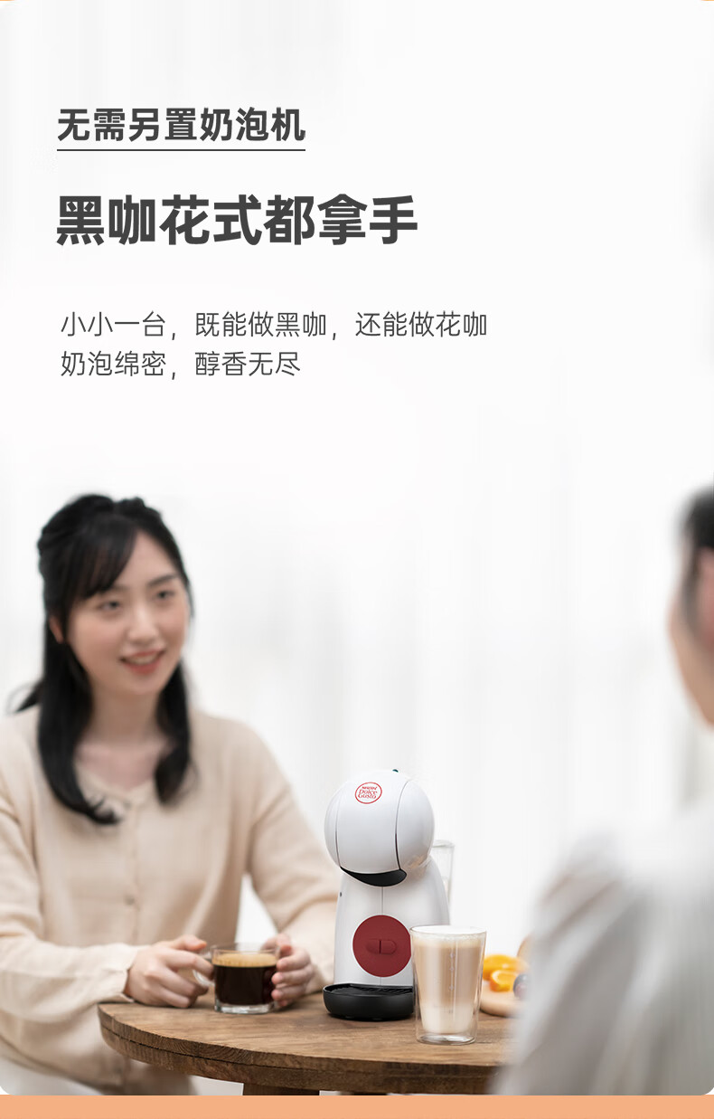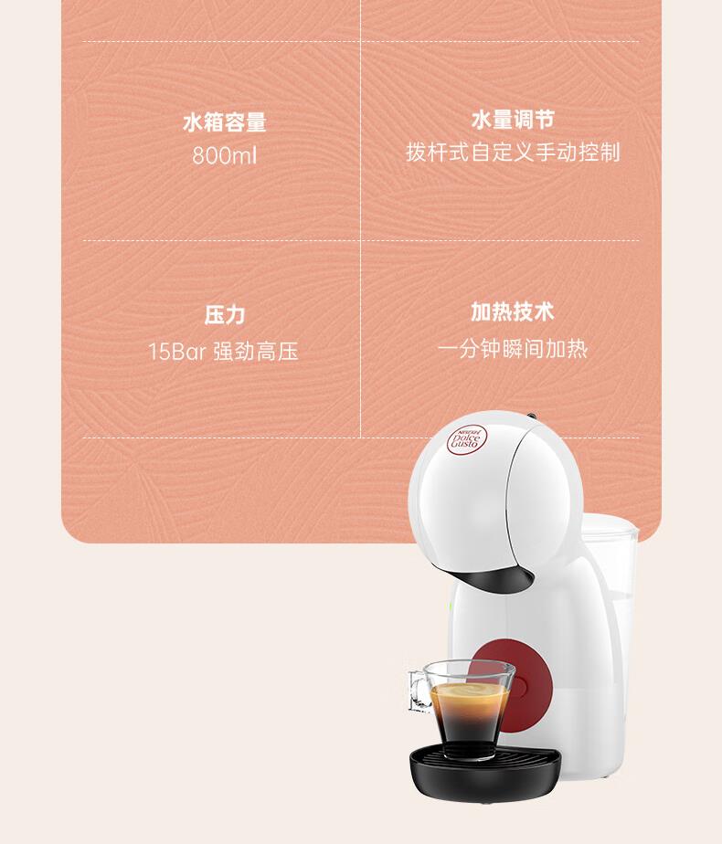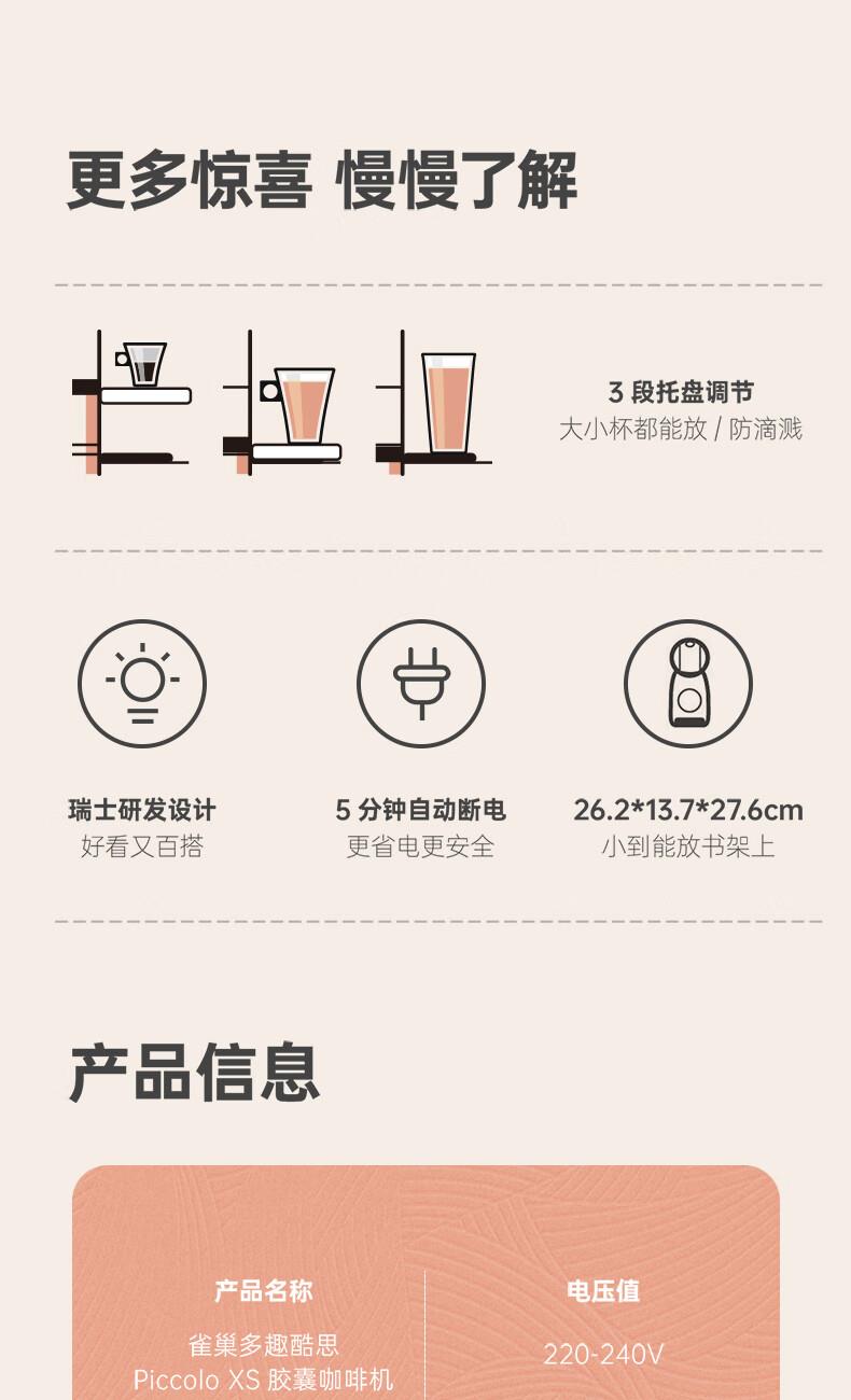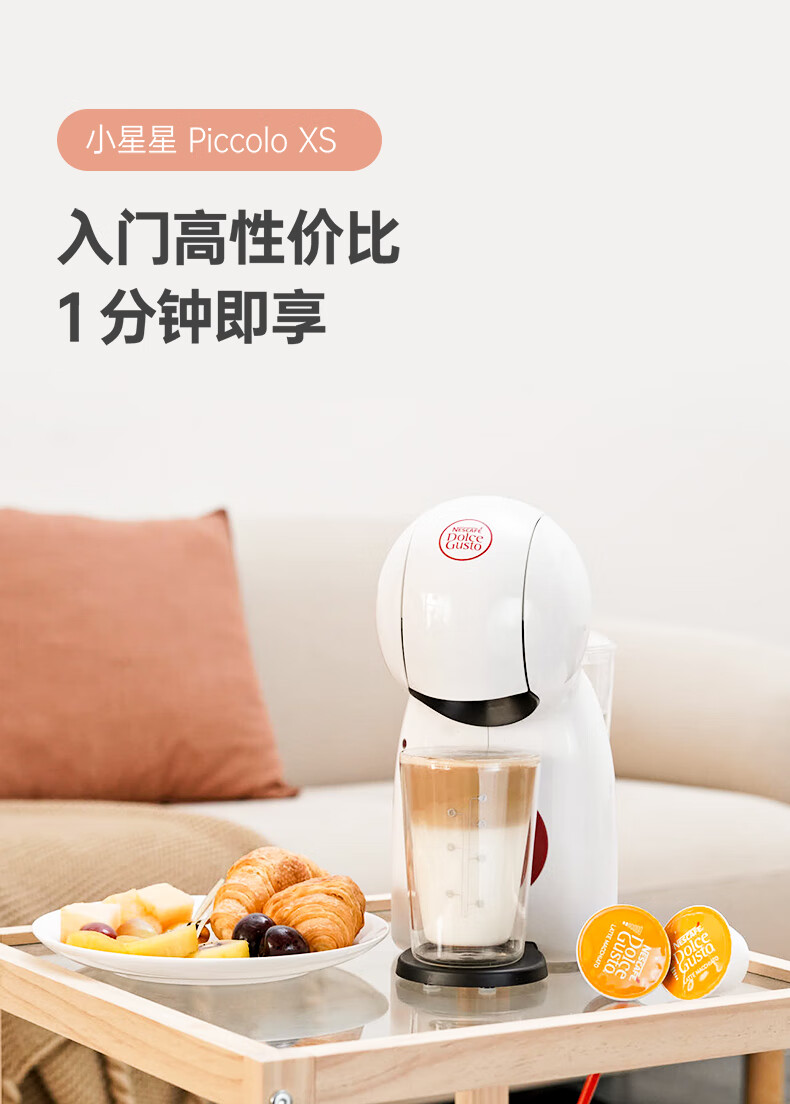 产品:雀巢多趣酷思Piccolo XS 胶囊咖啡机 产品型号:小星星单机 水箱容量:800ML 颜色:白色系 压力:15bar 强劲高压