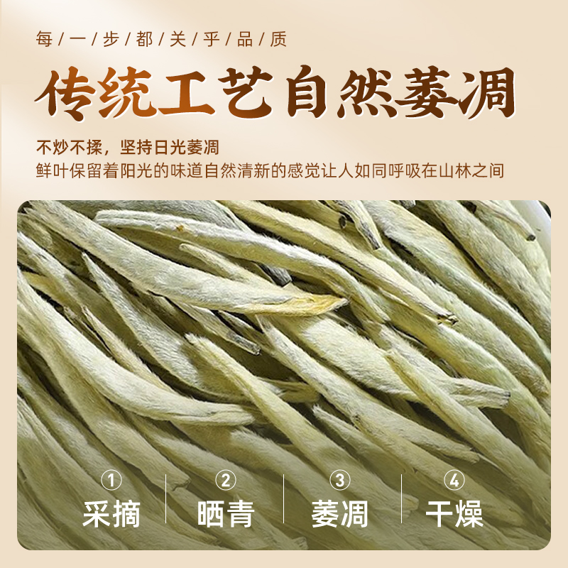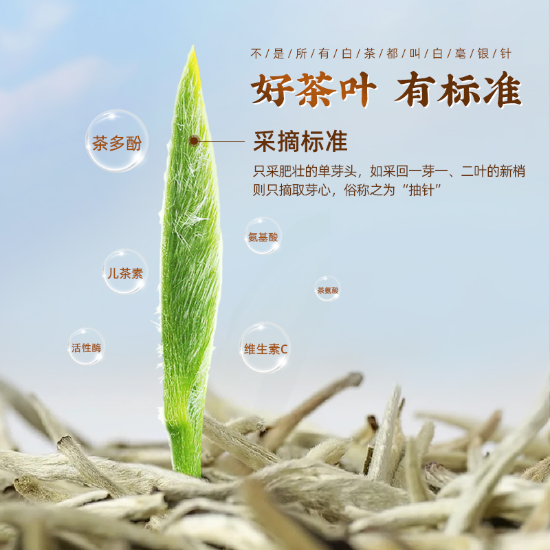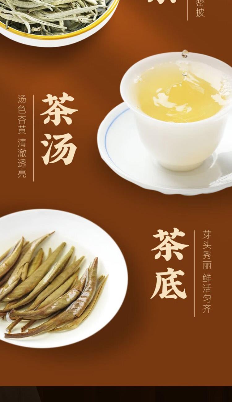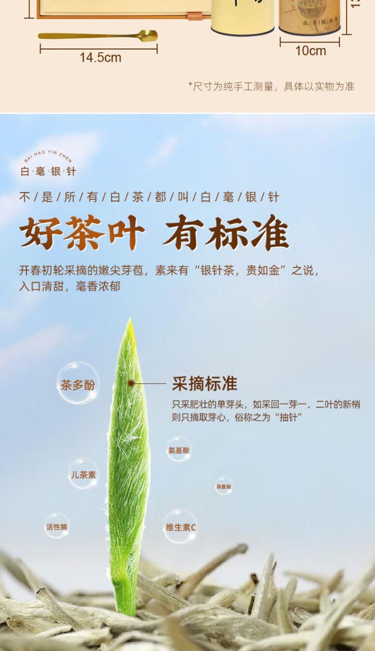 【系列】白毫银针·隰有荷华礼盒 【配料】云南大叶种茶鲜叶 【等级】特级 【净含量】200克(100克*2罐) 【保 质 期】在符合贮存条件下 适宜长期保存 【贮存条件】干燥、密封、防潮、防异味 卖点: 1.金奖品质,荣获茶博会金奖 2.高山茶园老树茶,好山好水出好茶 3.明前头采,手工采摘单芽,一年只采一次,量少而珍 4.内质丰富,滋味鲜甜 5.干茶=芽头粗壮 满披白毫 茶汤=鲜爽甘甜 清香浓醇 茶底=芽头肥硕 鲜亮均匀 6.臻品双罐礼盒,颗颗优选,甄选芽头,送礼有面
