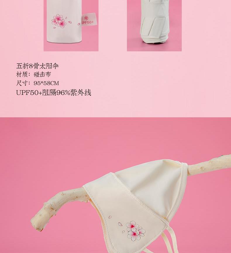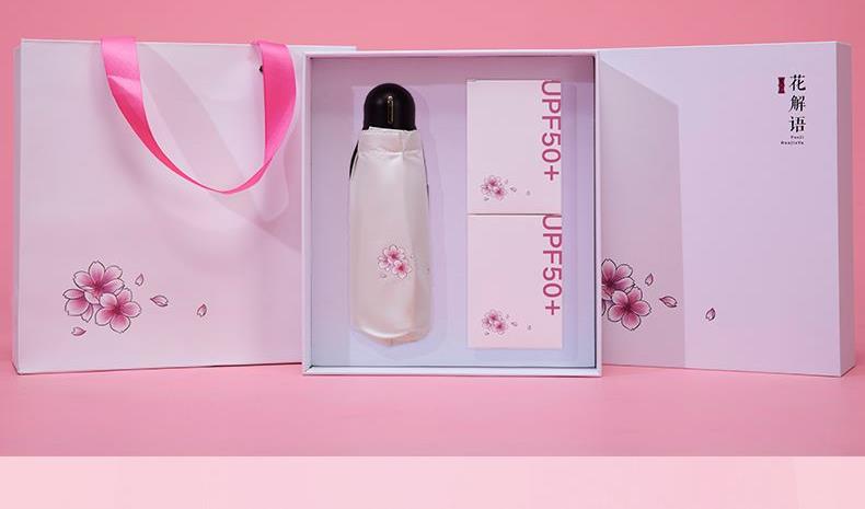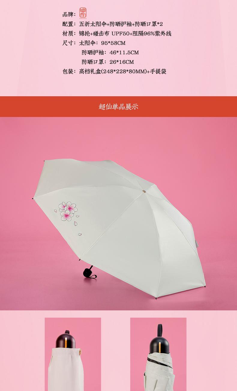 配置:五折太阳伞+防晒护袖+防晒口罩*2 材质:锦纶+碰击布 UPF50+阻隔96%紫外线 尺寸:太阳伞:95*58cm 防晒护袖:46*11.5cm 防晒口罩:26*16cm 包装:礼盒(248*228*80mm)+手提袋