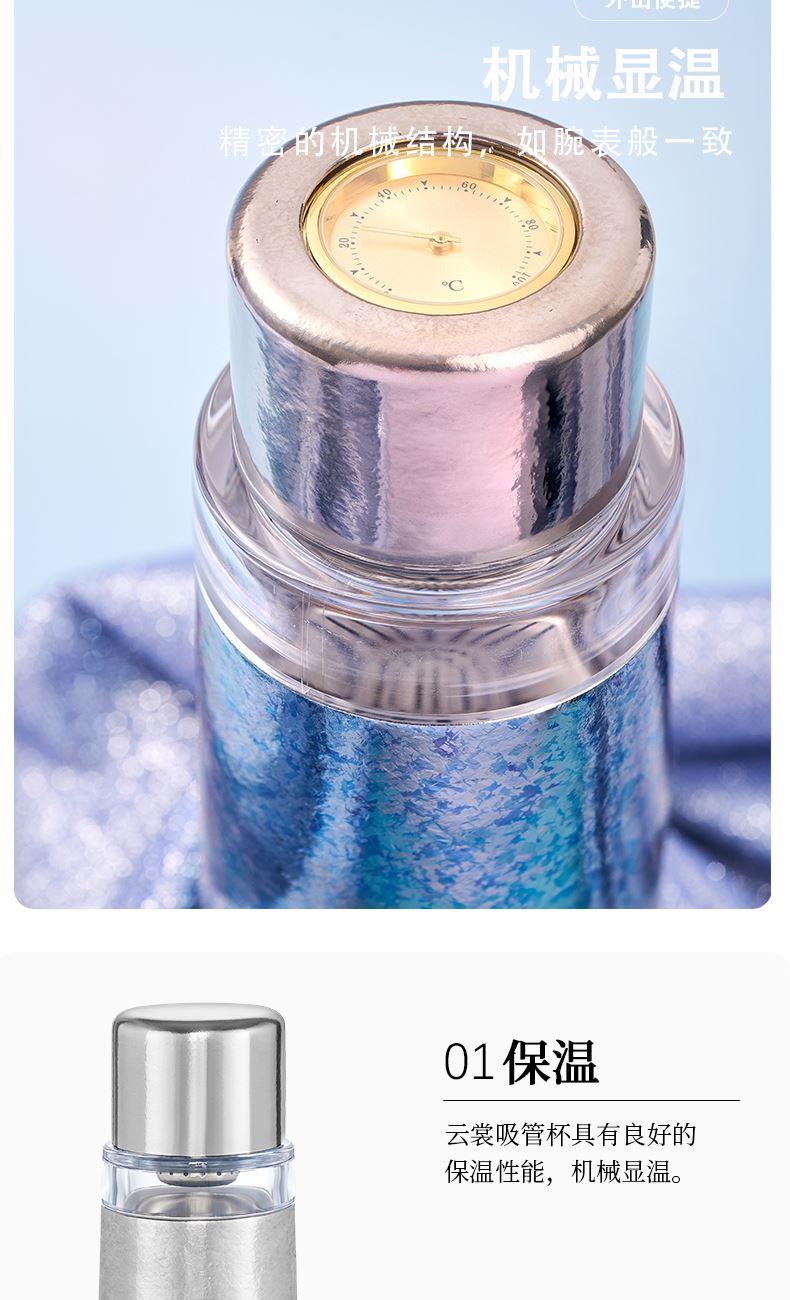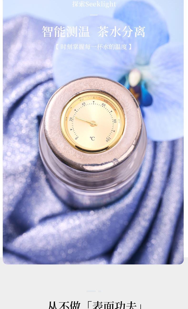 纯钛真空杯身:400ml 保温保冷一整天 透明茶仓: 100ml透明Tritan茶仓:母婴级食品材质,茶汤颜色尽显,上下可拆卸滤网,一冲即净 机械温显+磁吸盖:机械温显盖秒懂水温,磁吸盖碗单手开合 全场景适用,500ml全场景适用,茶水分离不串味,新手也能泡出专业感 型号:LBQY-0401/0402 尺寸:75*75*211 mm 重量:约365g 容量:400 ml+100ml(茶仓) 晓月 · 银 远山 · 蓝