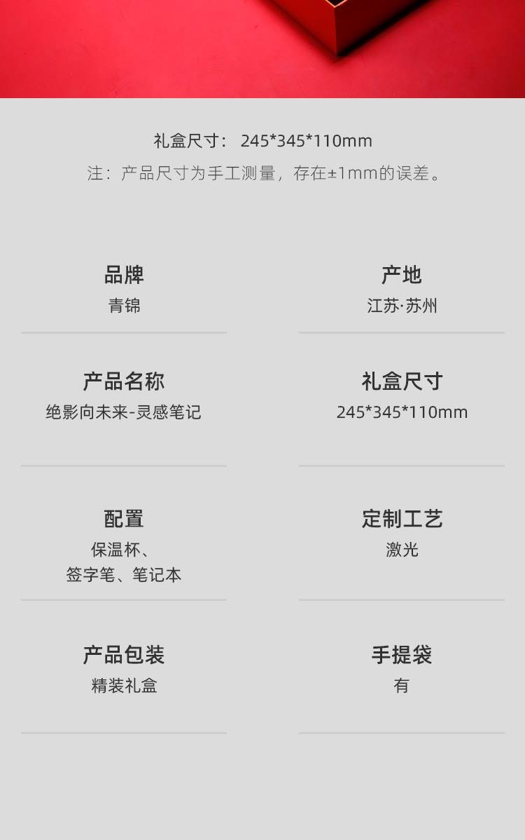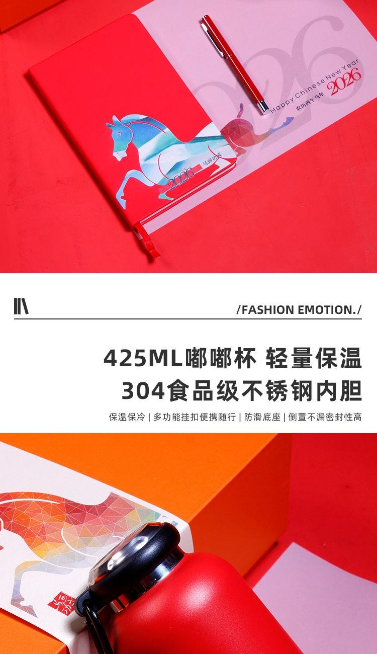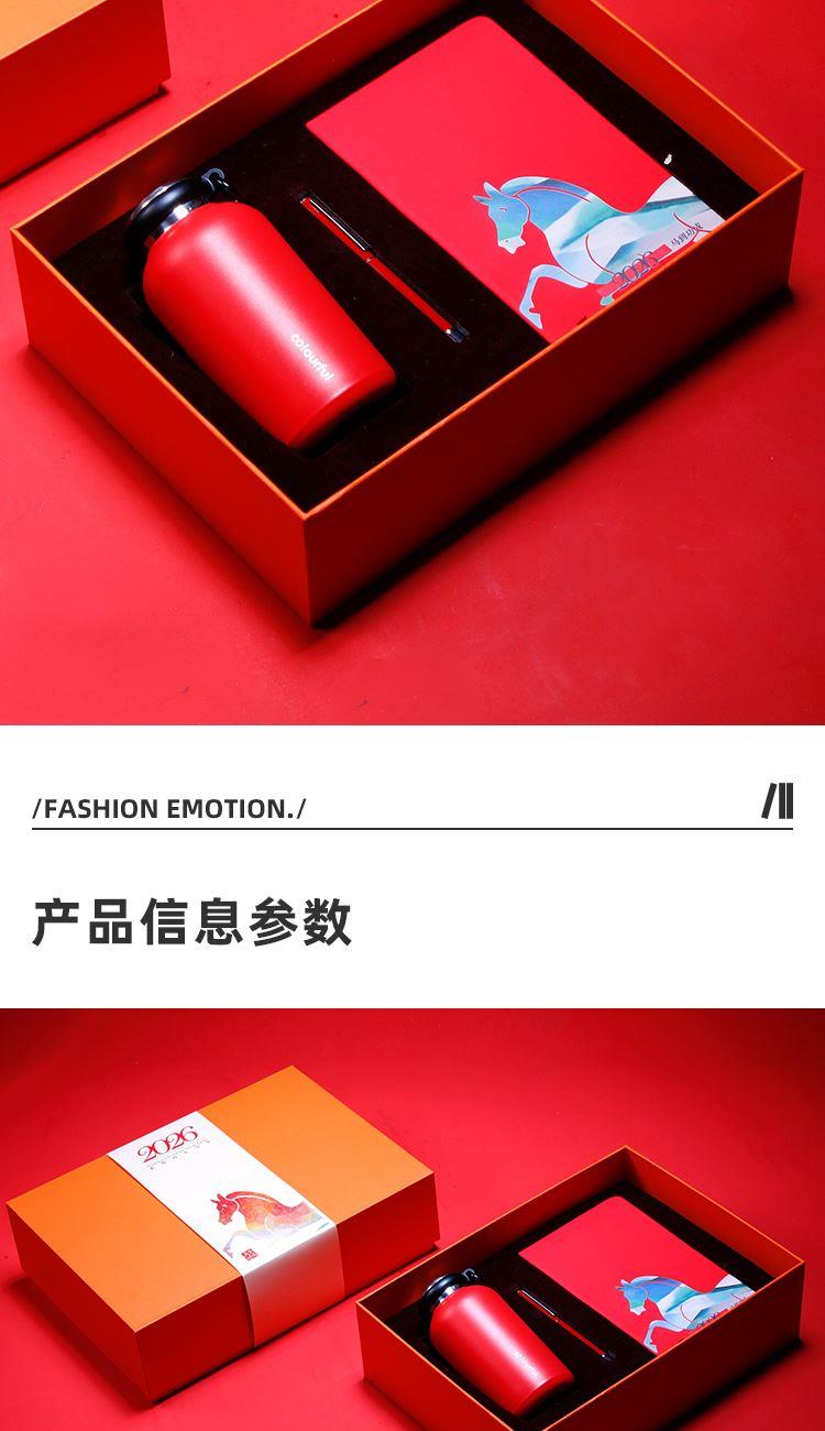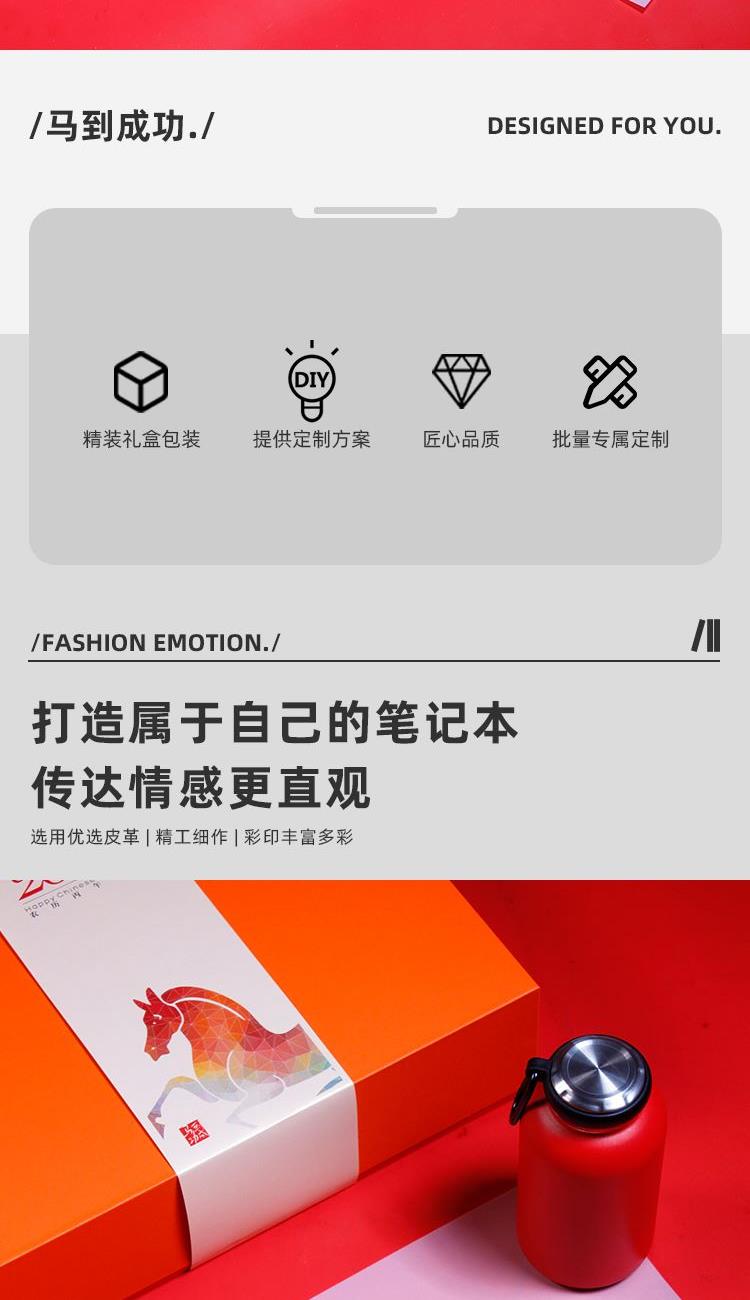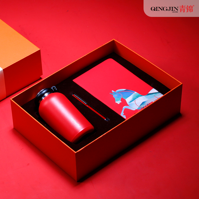 配置 嘟嘟杯425ml*1 颜色:红色 签字笔*1 颜色 红色黑色蓝色 青马笔记本*1 颜色红色/白色 精装礼盒手提袋*1 材质 保温杯:304钢 签字笔:金属 笔记本:皮革千越象牙白纸100克80张 尺寸 笔记本:130*212mm 礼盒:245*345*110mm