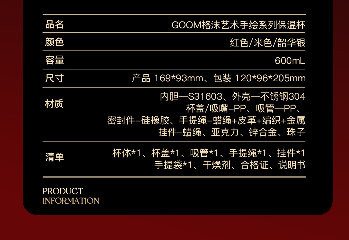 型 号:GM-23AW-B9 颜 色:韶华银/添鸿运/丰米运 材 质:外壳-奥氏体不锈钢S30408、内胆—奥氏体不锈钢S31603、杯盖/吸嘴-PP聚丙烯(丙烯与乙烯的聚合物)、吸管-PP聚丙烯(丙烯均聚物)、密封件-硅橡胶、手提绳-蜡绳+皮革+编织+金属、挂件-蜡绳、亚克力、锌合金、珠子 容 量:600ml 单杯尺寸:169*93mm 外箱尺寸:120*96*205mm