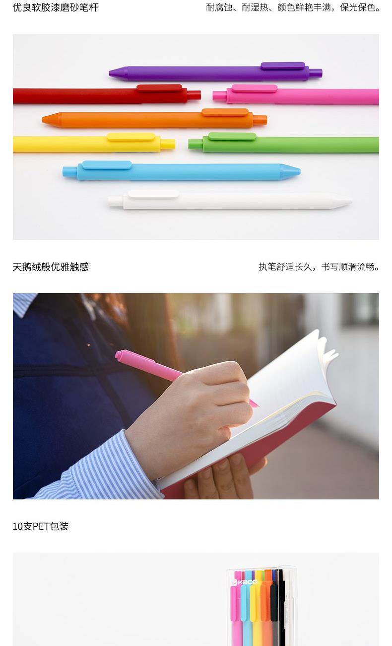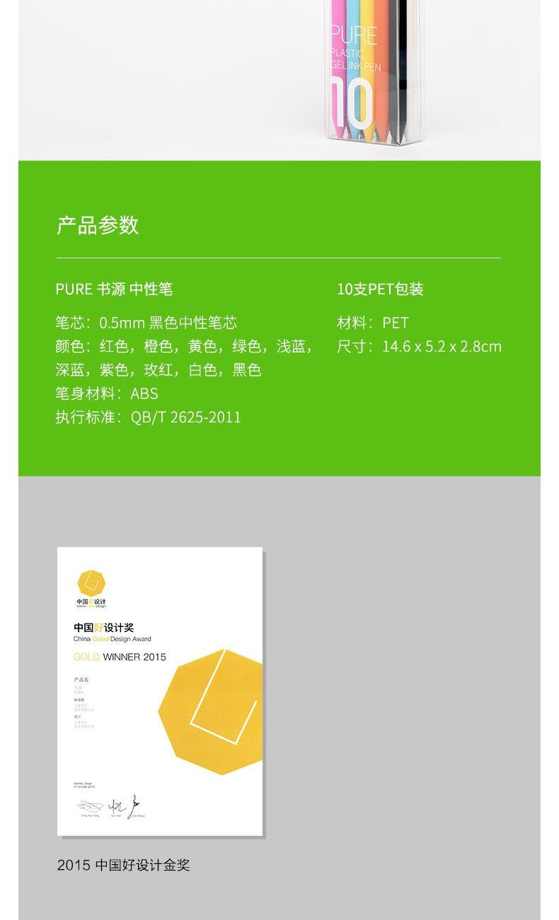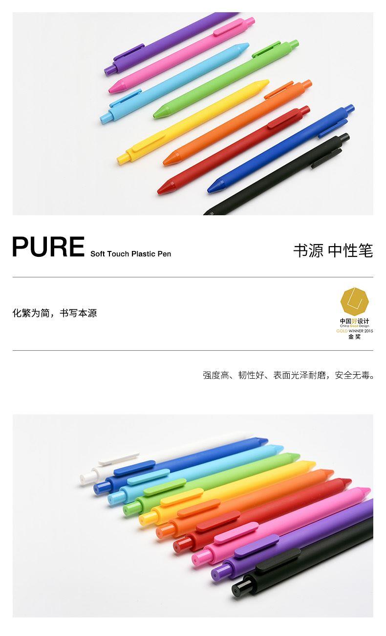 单笔尺寸:145*13.6mm 材 质:ABS 外观颜色:黑色/白色/红色/橙色/黄色/绿色/深蓝/浅蓝/紫色/玫红色 1、化繁为简的设计理念,荣获当代好设计金奖。 2、色彩饱满,书写流畅顺滑,不易飞白断墨。 3、笔杆软胶喷漆工艺,执笔舒适自如。 黑色笔芯/笔芯跟笔杆 定制工艺:笔身印刷Logo 打样周期:3-5天 货 期:7-10天发货(不含重大法定假日) 包装方式:10支入一个pet盒