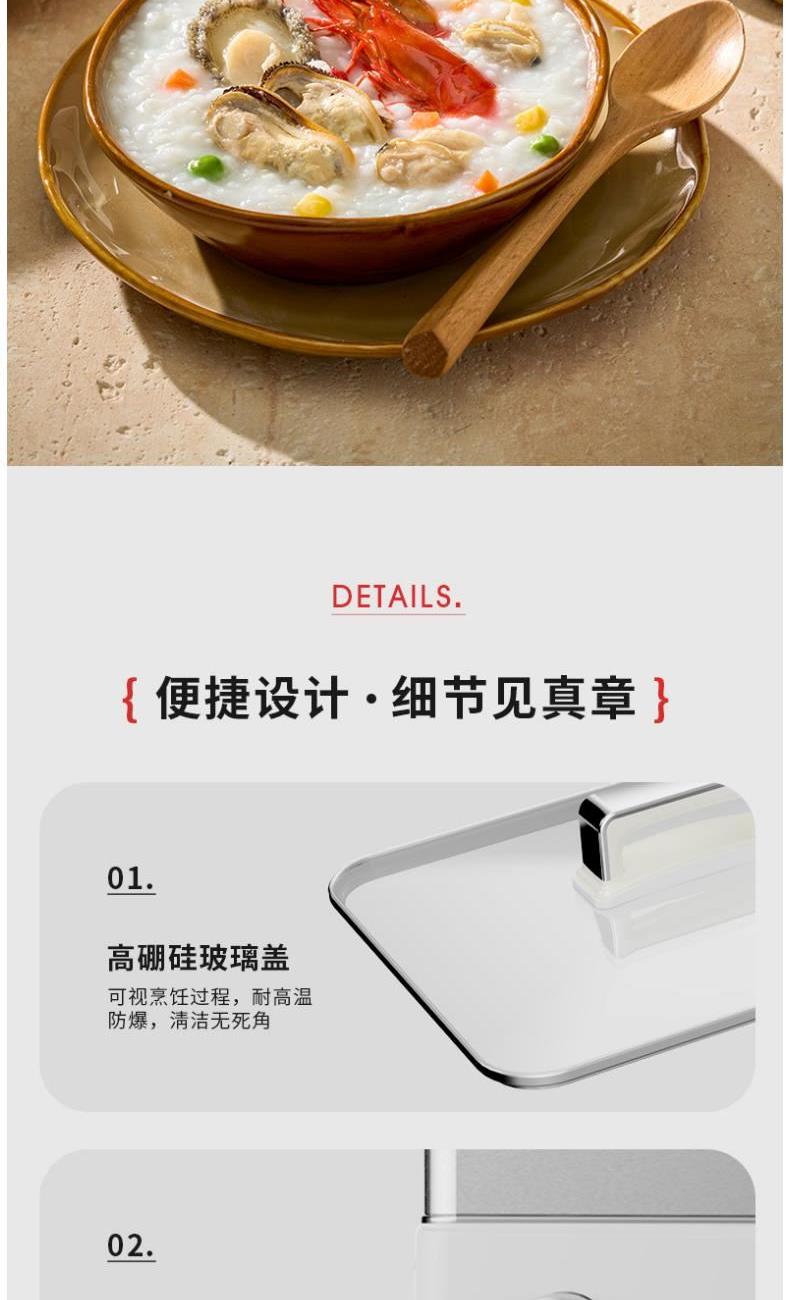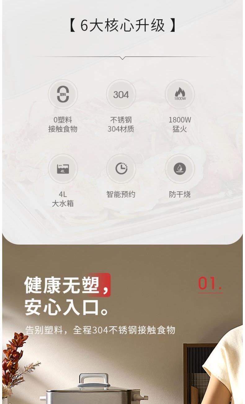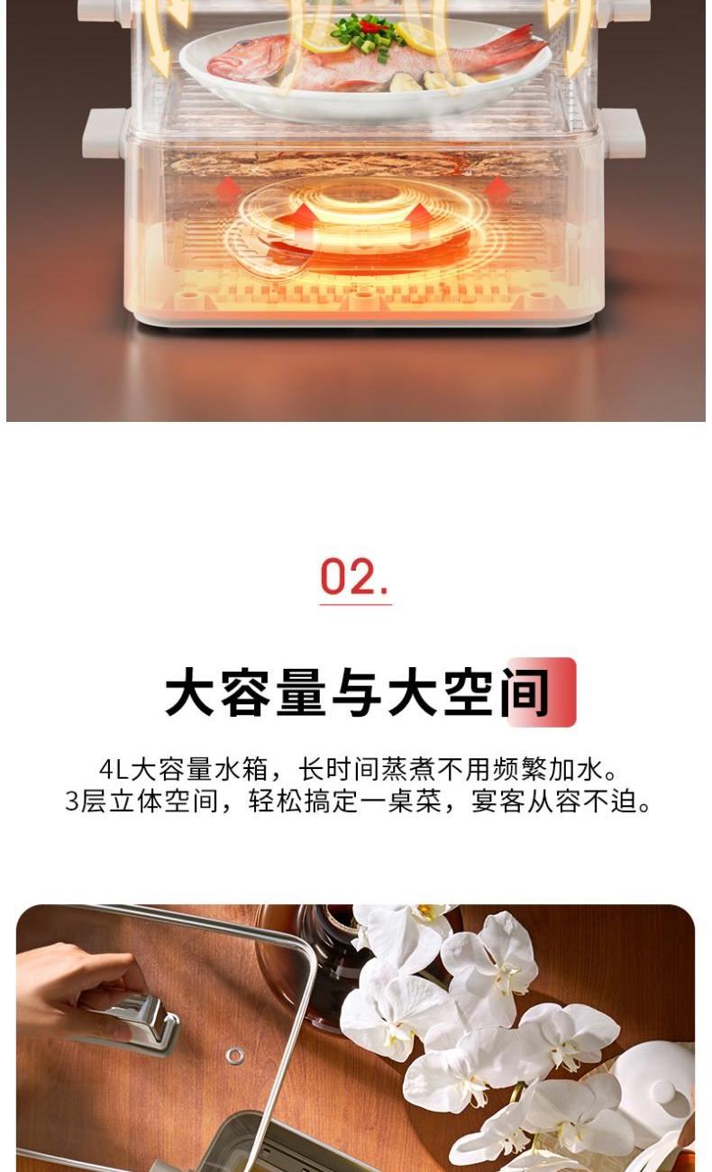 额定电压:220V~ 额定频率:50Hz 额定功率:1800W 水箱容量:4L 额定容积:12L 净重:5.2kg 毛重:6.26kg 产品尺寸:195x135x32lmm 包装尺寸:435*345*448mm 产品清单:主机x1、清洁刷x1、量杯x1、 电源线x1、说明书(含食谱) 1.1800W 猛火速蒸 2.双层防干烧,安全有保证 3.全钢304,0塑料接触 母婴级安全 4.双层大容量,轻松应对大家庭 5.蒸煮焖炖涮五合一功能。