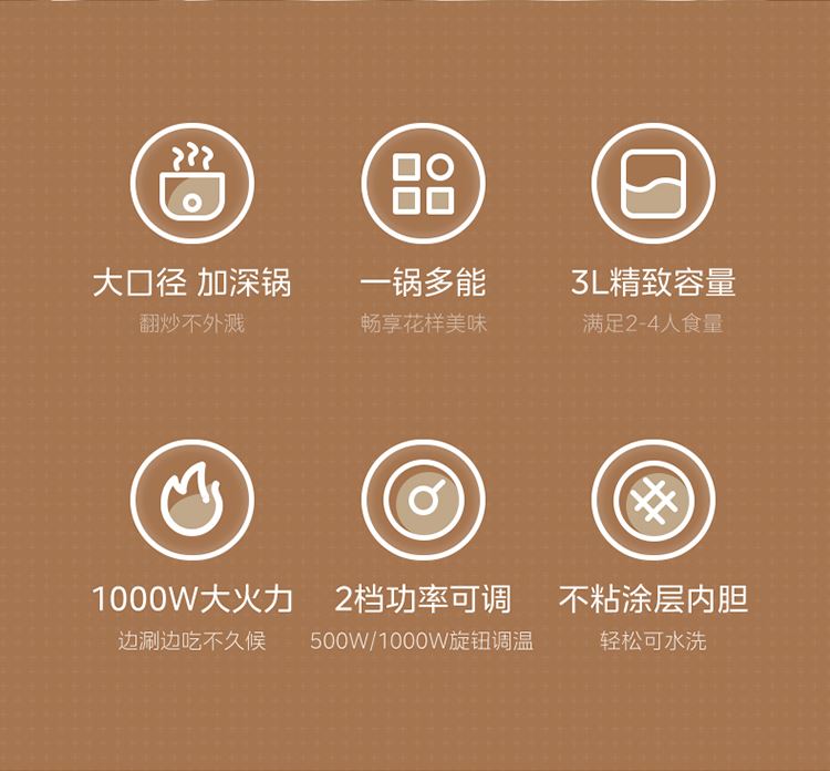 产品规格: 产品尺寸:305 x 253 x 215 mm 包装尺寸:290 x 195 x 300 mm 产品毛重:2 kg 产品特点: 1000W快速沸腾,毛肚羊肉涮起来 加深内胆,实用容量,3-5人可食用 不粘涂层内胆,,不粘锅好清洗 一锅多能,畅享花样美味