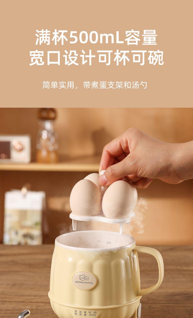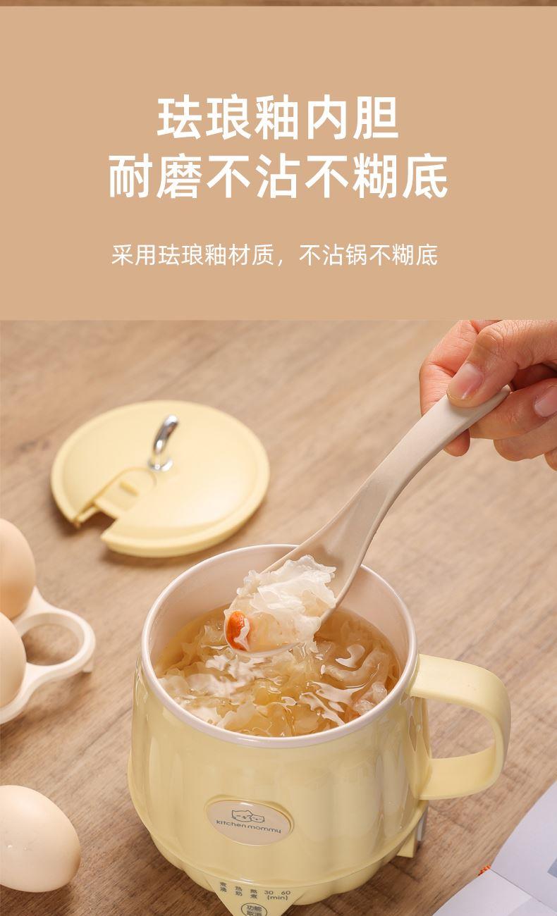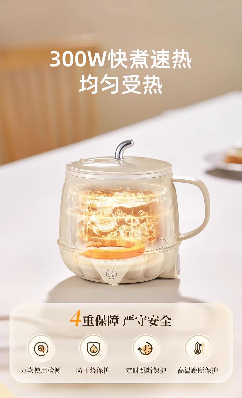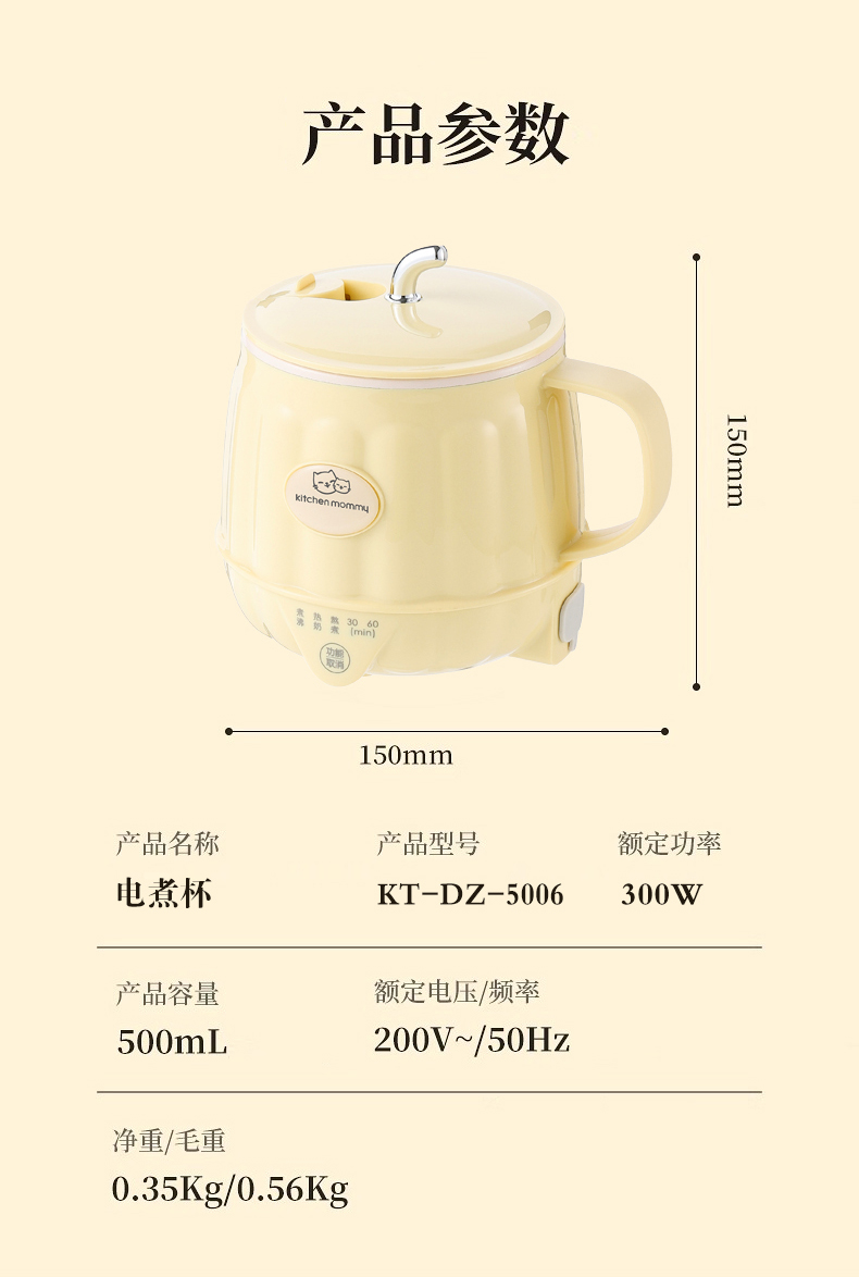 功率:300W 电压:220V 容量:500mL 毛重:0.56KG 材质:外壳PP+陶瓷釉不沾锅内胆 彩盒包装尺寸:152*152*152mm 推荐理由: 1、小巧轻便,杯锅两用,珐琅釉不粘内胆,易清洗 2、3分钟快速热奶,50度暖而不烫刚刚好,不糊底 3、300W快速加热沸腾,无需久等 4、五档功能调节,(煮沸、热奶、熬煮15min、熬煮30min、熬煮60min)5、外形精巧设计,高颜值,迷你精致,500ml精巧容量