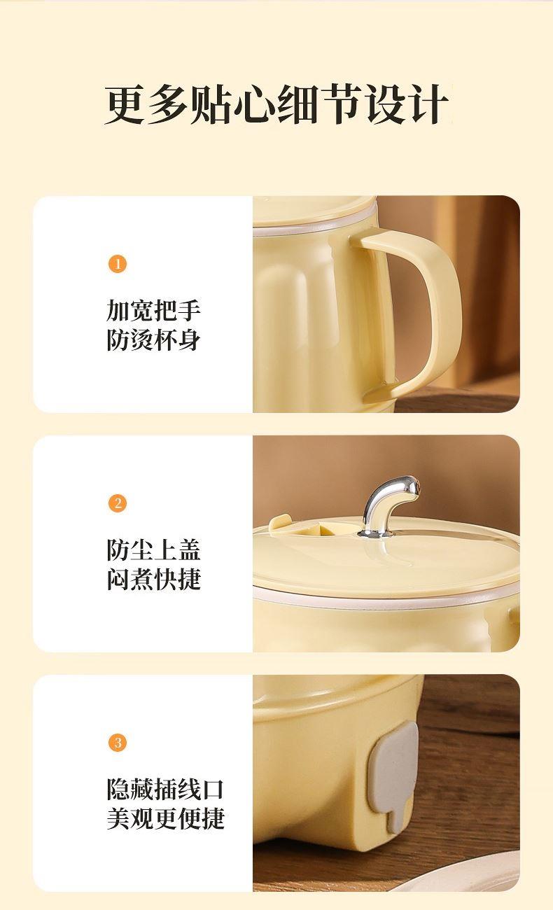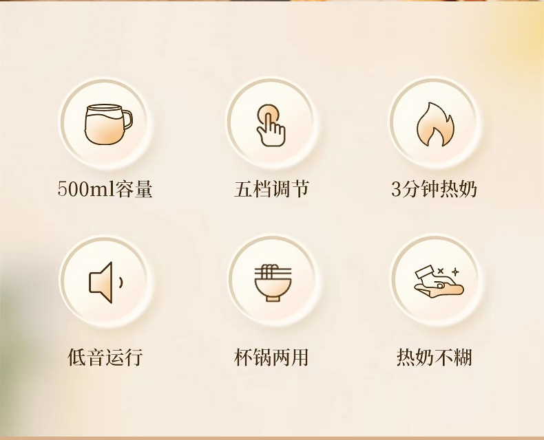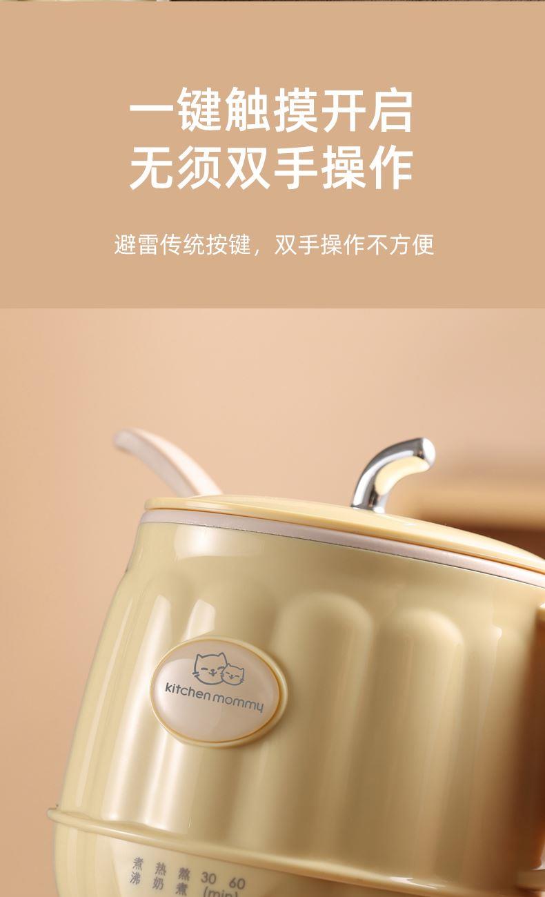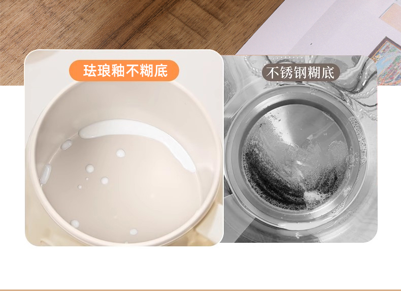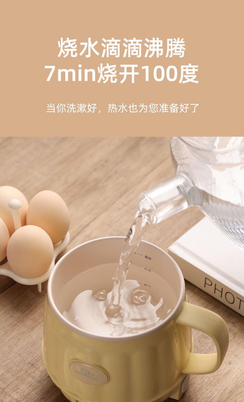 功率:300W 电压:220V 容量:500mL 毛重:0.56KG 材质:外壳PP+陶瓷釉不沾锅内胆 彩盒包装尺寸:152*152*152mm 推荐理由: 1、小巧轻便,杯锅两用,珐琅釉不粘内胆,易清洗 2、3分钟快速热奶,50度暖而不烫刚刚好,不糊底 3、300W快速加热沸腾,无需久等 4、五档功能调节,(煮沸、热奶、熬煮15min、熬煮30min、熬煮60min)5、外形精巧设计,高颜值,迷你精致,500ml精巧容量