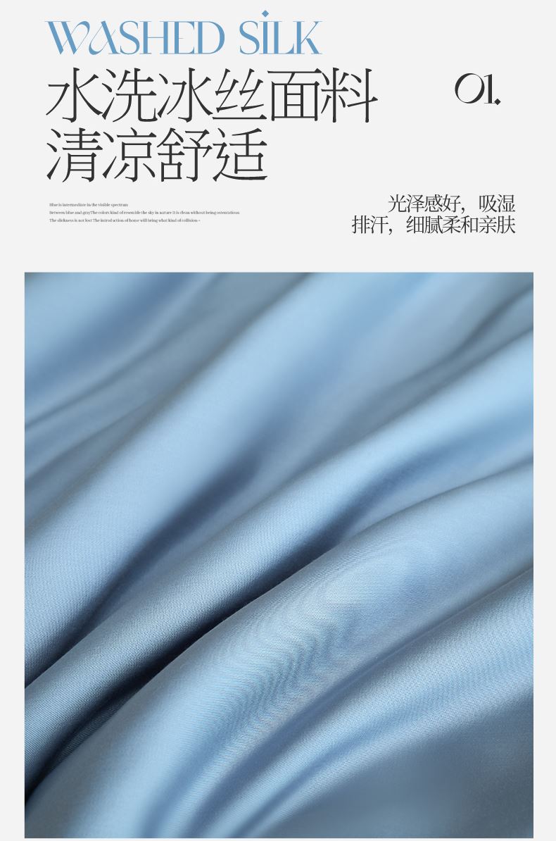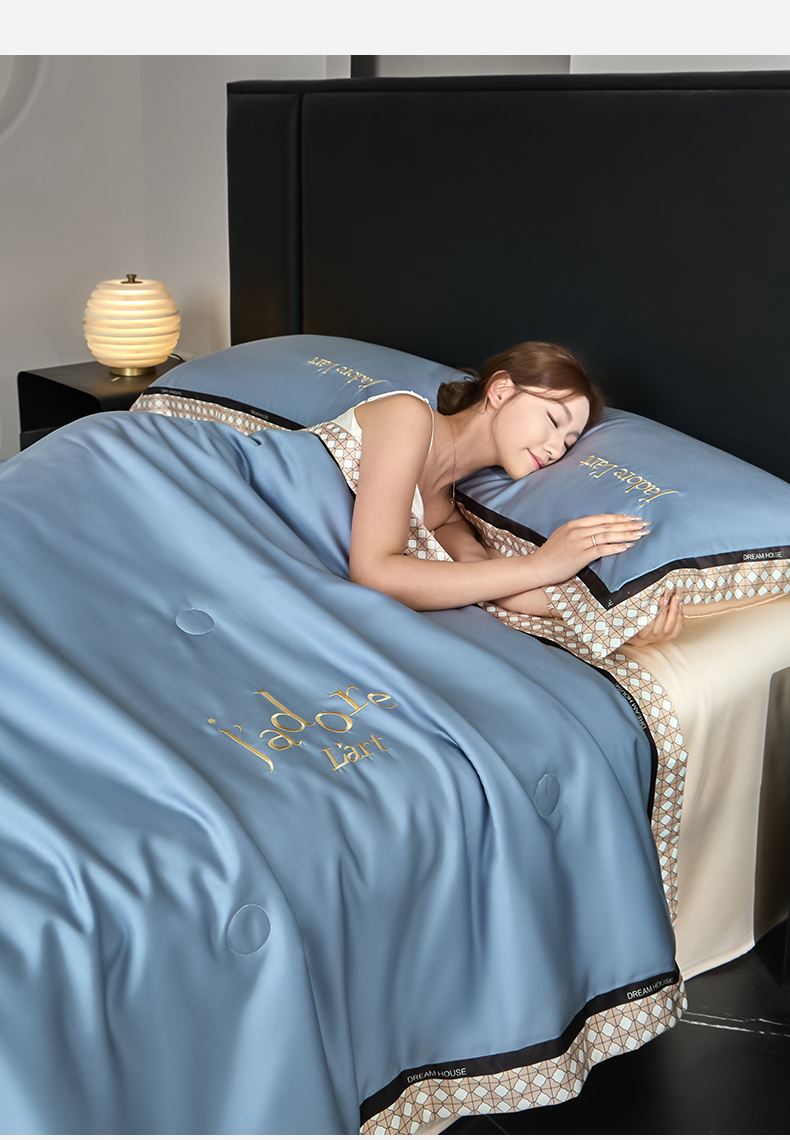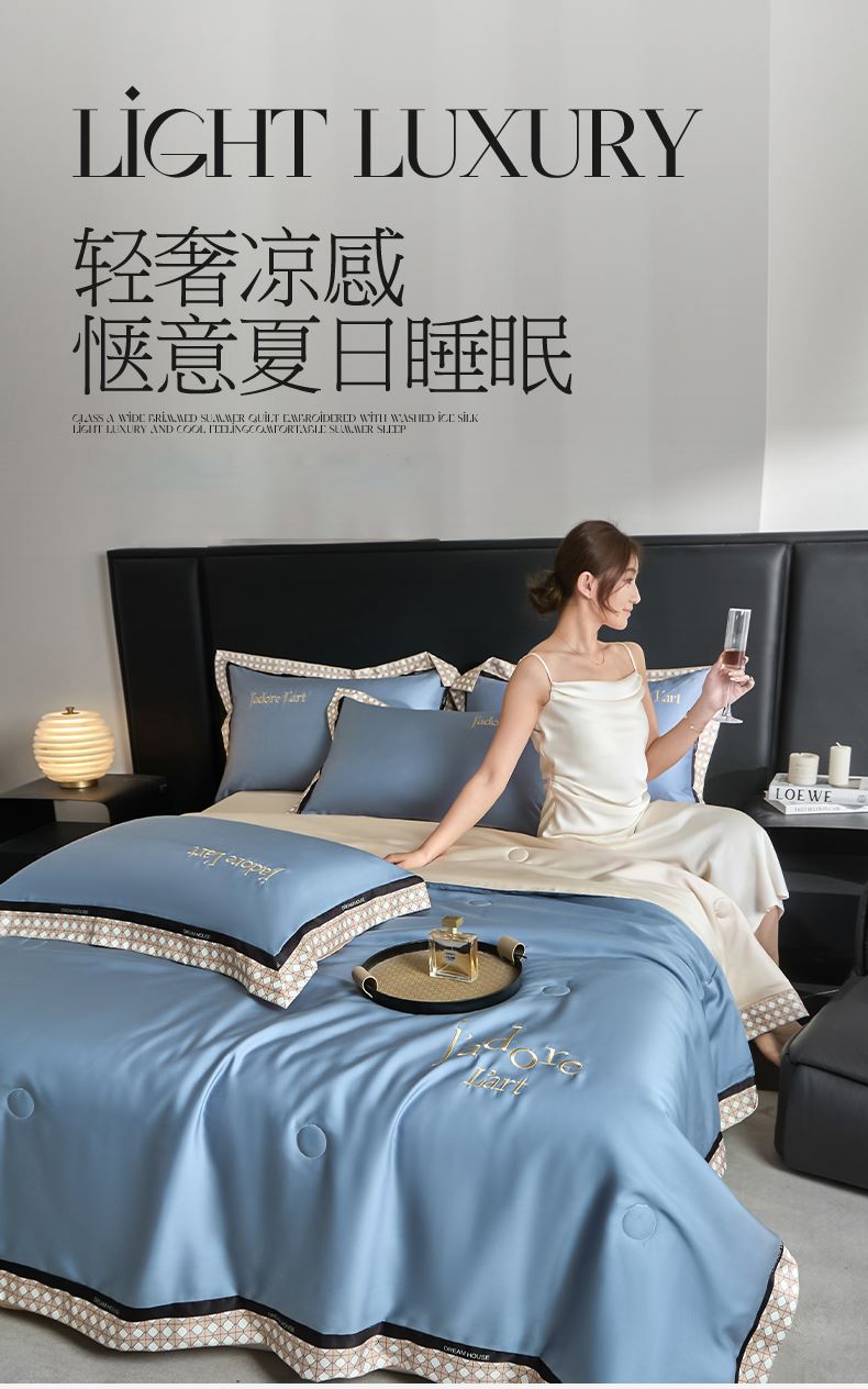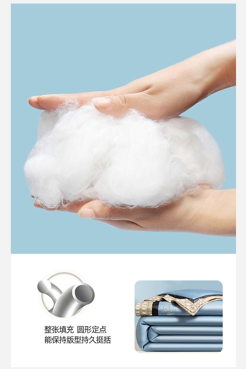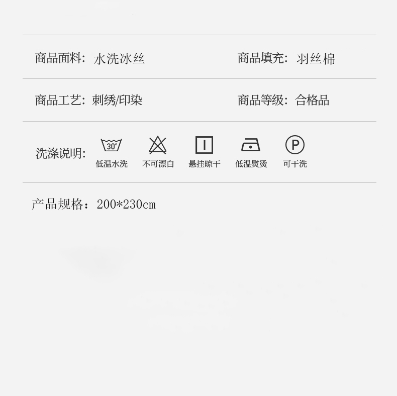 规格:200*230cm 面料:水洗冰丝 填充:羽丝棉 克重:1400g 产品特点: 1.水洗冰丝面料舒爽柔滑,具有良好的透气性,手感柔软,轻触如绸,且富有光泽感。 2.水洗冰丝带来的清凉感,恰好成为燥热天气的一抹清凉。