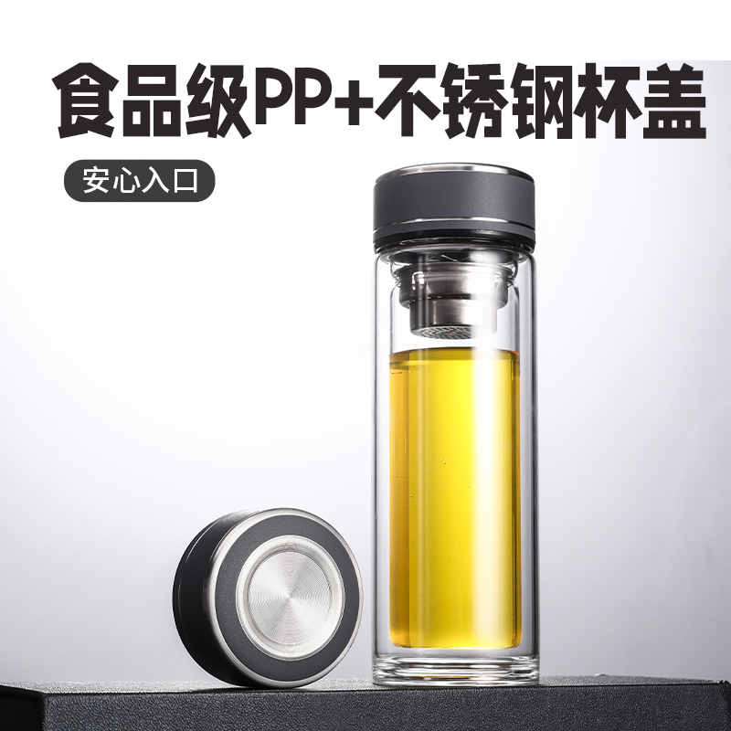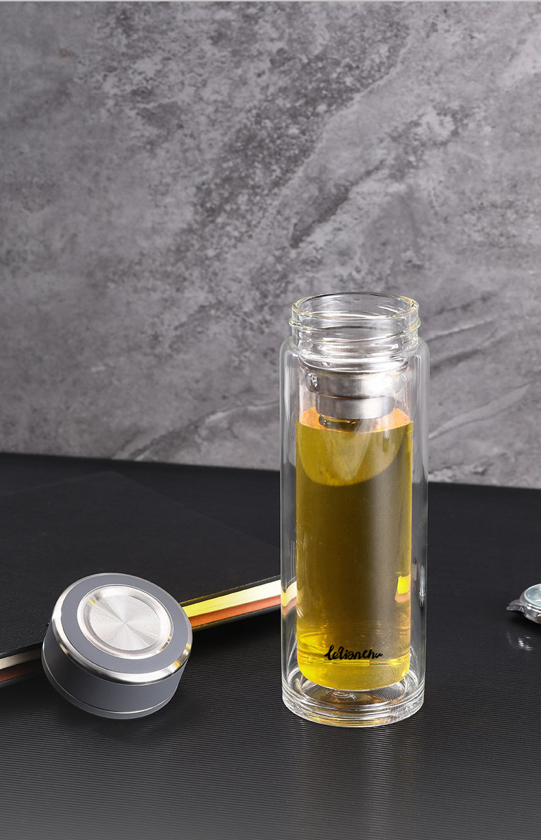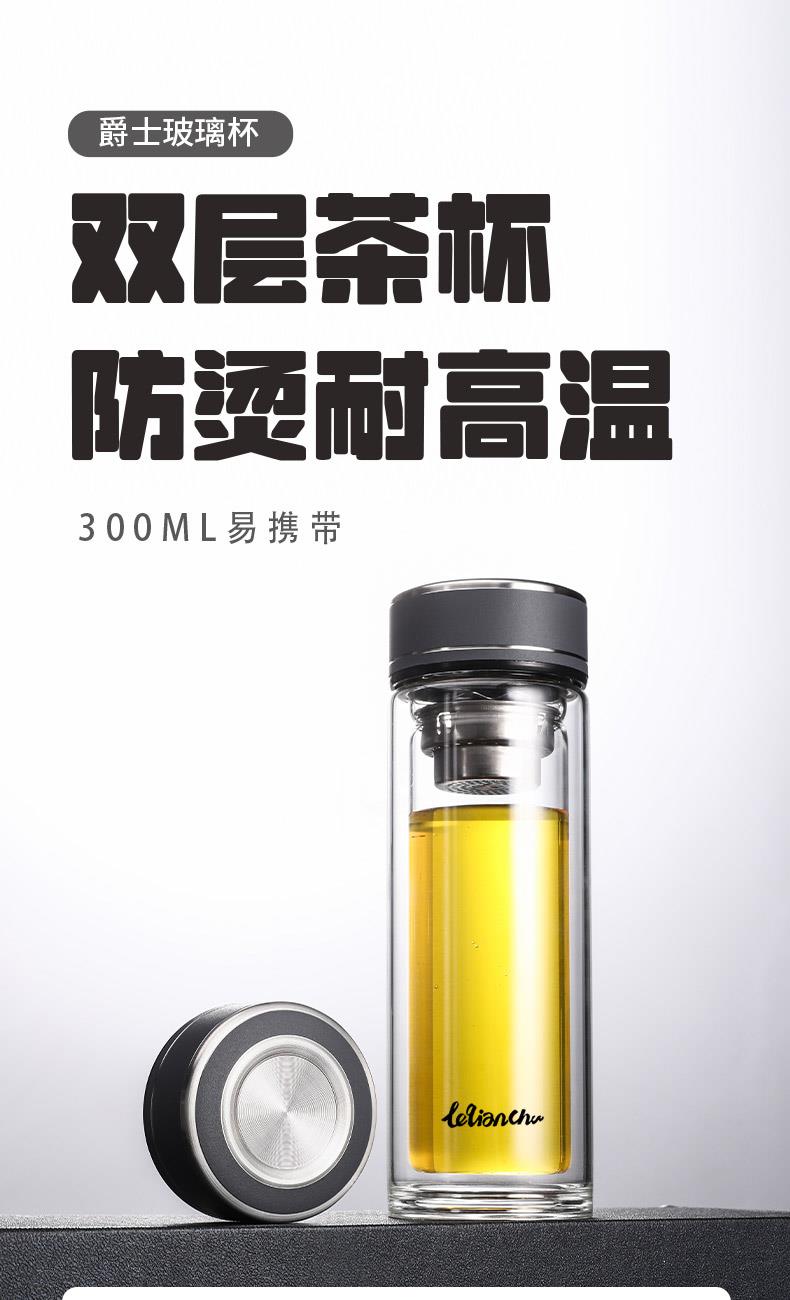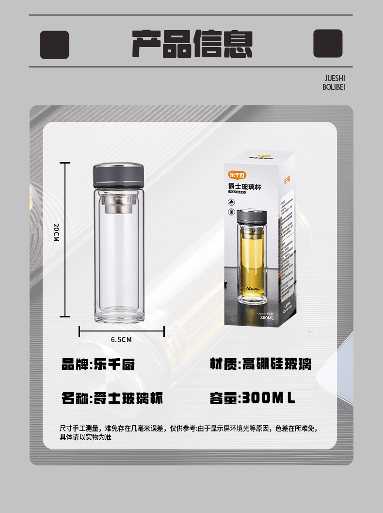 材 质:高硼硅玻璃 容 量:300ml 彩盒尺寸:6.9*6.9*20.5cm 1. 杯身采用双层高硼硅玻璃,有效隔热防烫; 2. 304不锈钢茶漏,有效阻隔茶渣入口; 3. 杯盖密封性良好无滴漏; 4. 杯口圆润光滑,触感温润舒适; 5. 底座坚固耐磨,有效保护杯体。