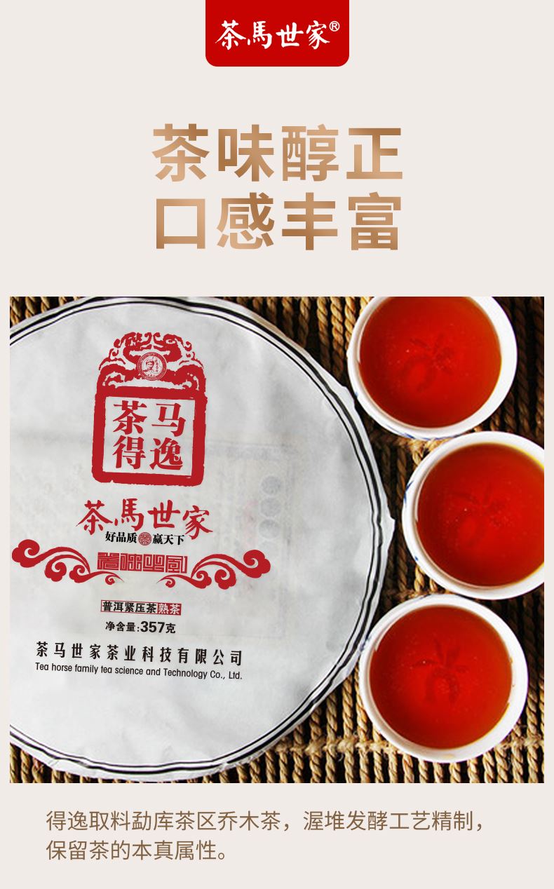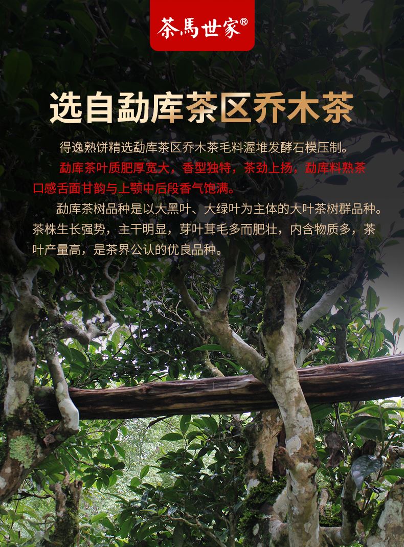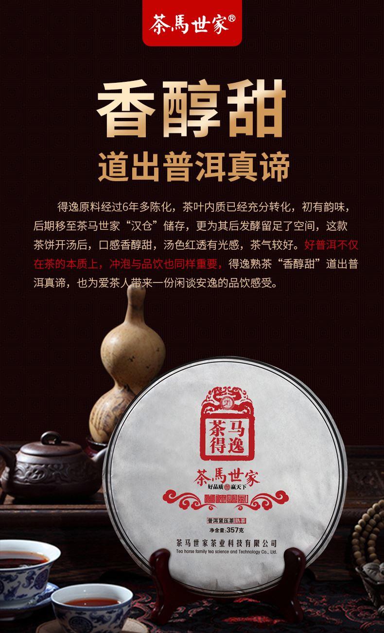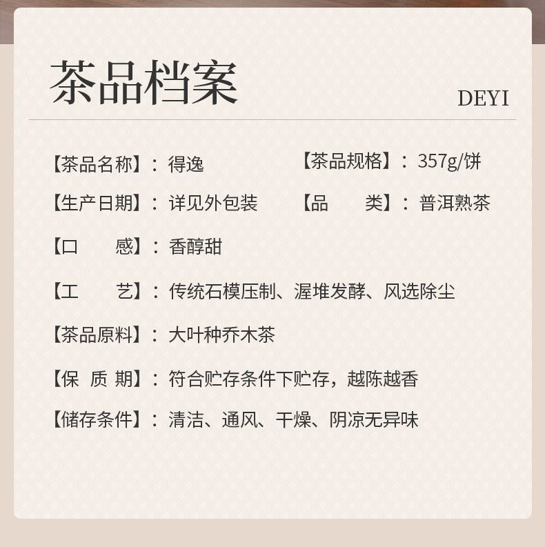 【茶 名】:得逸 【规格】:357g/饼 【生产日期】:详见外包装 【品类】:普洱熟茶 【口感】:香醇甜 【工艺】:传统石模压制、渥堆发酵、风选除尘 【茶品原料】:大叶种乔木茶 【保 质 期】:符合贮存条件下贮存,越陈越香 【储存条件】:清洁、通风、干燥、阴凉无异味 卖点: 1.15年生产普洱茶。勐库茶区乔木茶,叶质肥厚宽大,香型独特,茶劲上扬,勐库料熟茶口感舌面甘韵与上颚中后段香气饱满。 2.勐库茶树品种是以大黑叶、大绿叶为主体的大叶茶树群品种。茶株生长势强,主干明显,茶叶毫毛多而肥壮,内含物质多,茶叶产量高,是茶界公认的优良品种。 3.茶叶内质已经充分转化,初有韵味,后期转到茶马;世家“汉仓”储存,为其后面的发酵留足了空间。 4.口感甜醇,汤色红透有光感,茶气较好。叶底油润有光泽,条索肥厚,且有弹性。