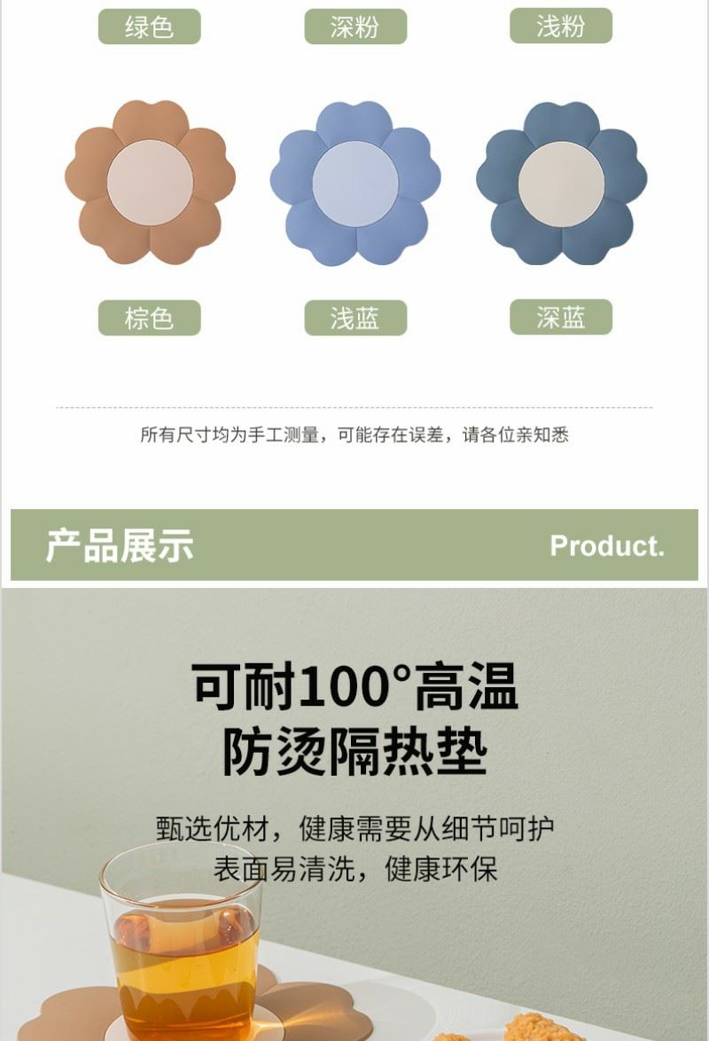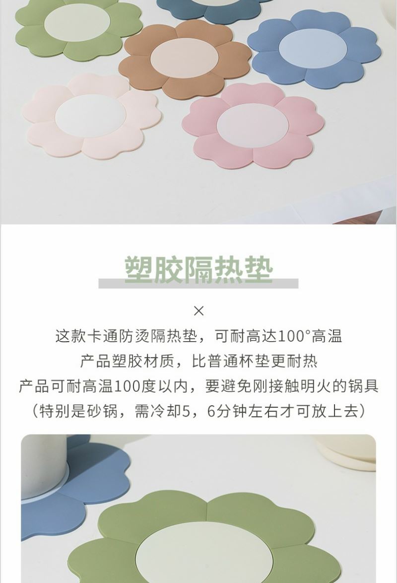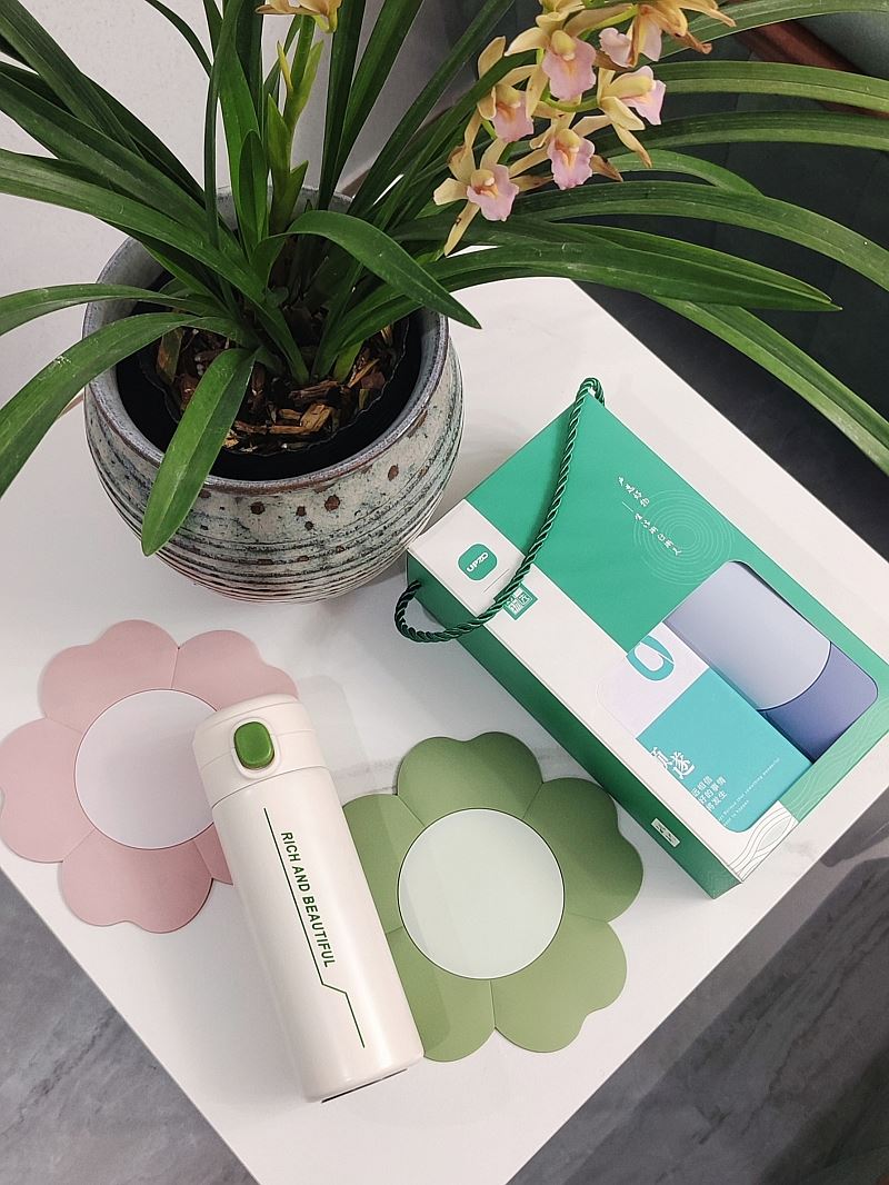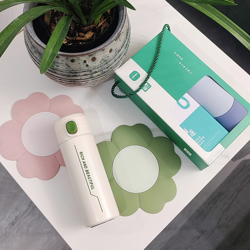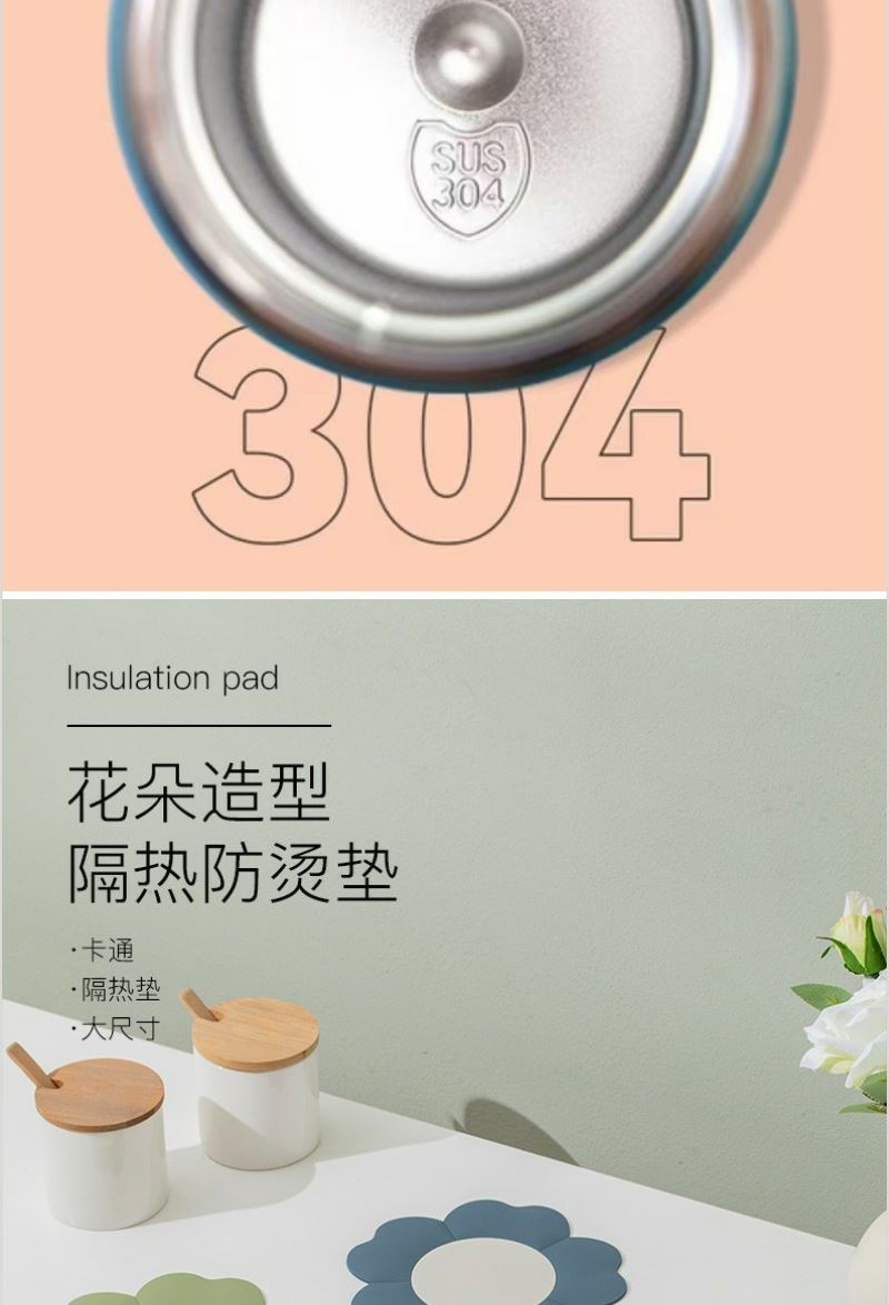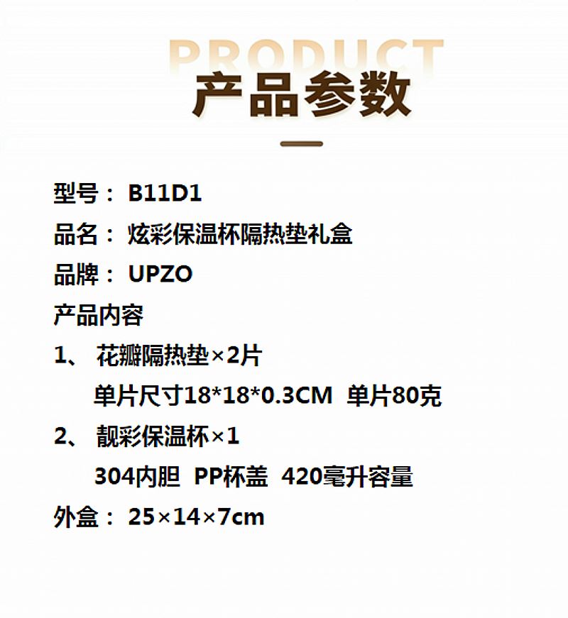 型号: B11D1 产品内容 1、 花瓣隔热垫×2片 单片尺寸18*18*0.3CM 单片80克 2、 靓彩保温杯×1 304内胆 PP杯盖 420毫升容量 外盒: 25×14×7cm 420毫升高颜值保温杯 304内胆 精美设计文案 花瓣隔热垫2片 造型靓丽 产品优质 PVC材质 经久耐用