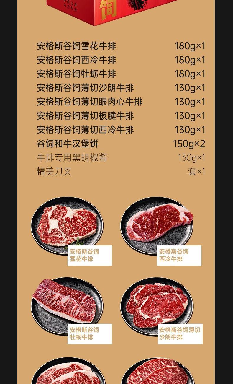 安格斯谷饲雪花牛排 180gx1 盒 安格斯谷饲西冷牛排 180gx1 盒 安格斯谷饲牡蛎牛排 180gx1 盒 安格斯谷饲薄切沙朗牛排 130gx1 盒 安格斯谷饲薄切眼肉心牛排 130gx1 盒 安格斯谷饲薄切板腱牛排 130gx1 盒 安格斯谷饲薄切西冷牛排 130gx1 盒 谷饲和牛汉堡饼 150gx2 盒 牛排专用黑胡椒酱 130gx1 袋 精美刀叉 x1 套 净含量:1360g